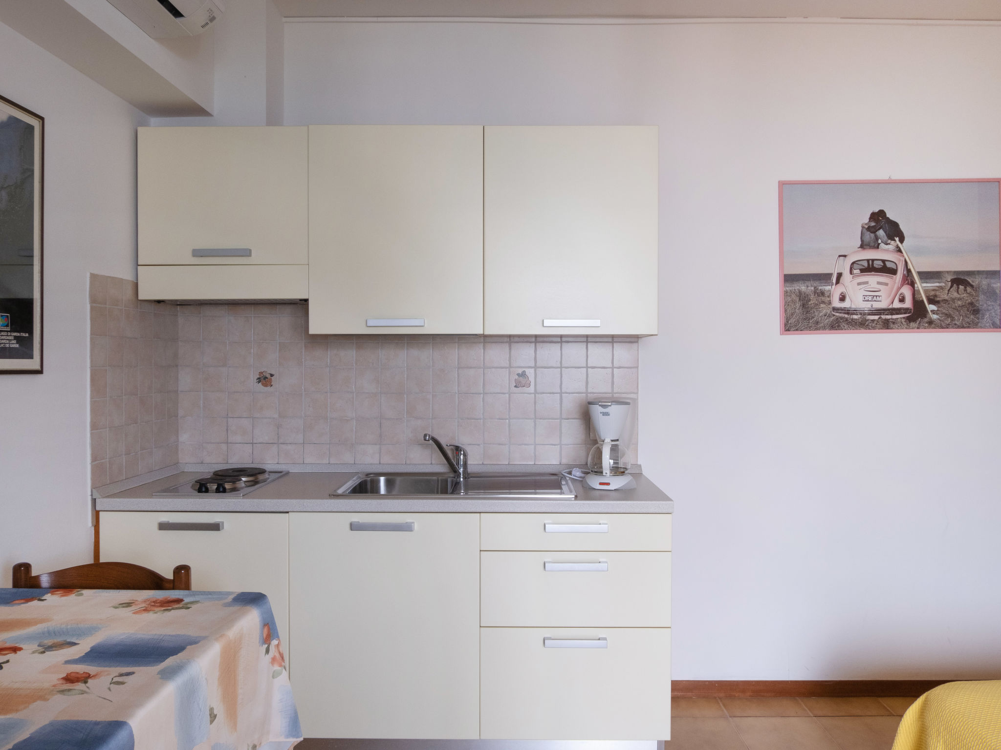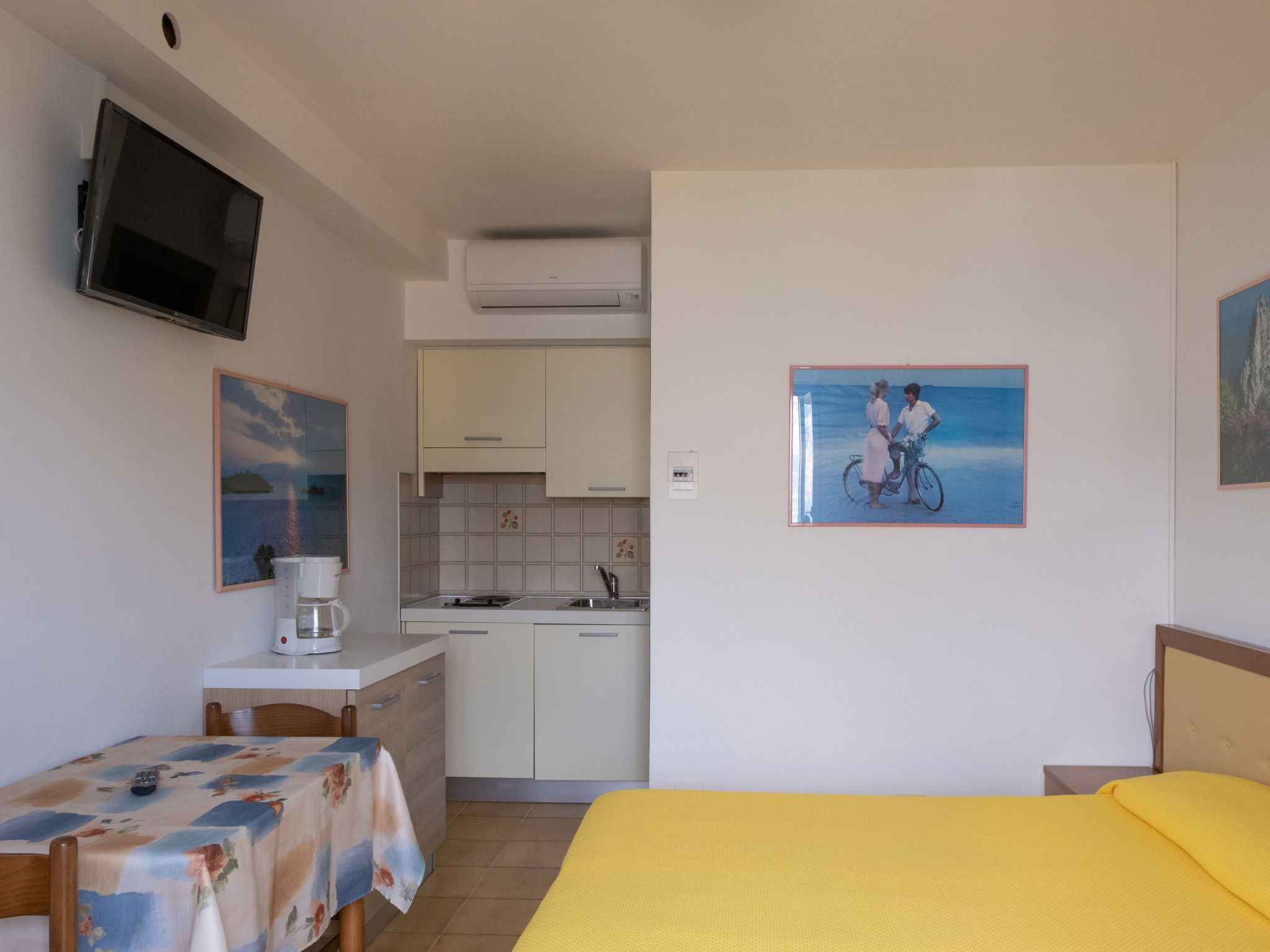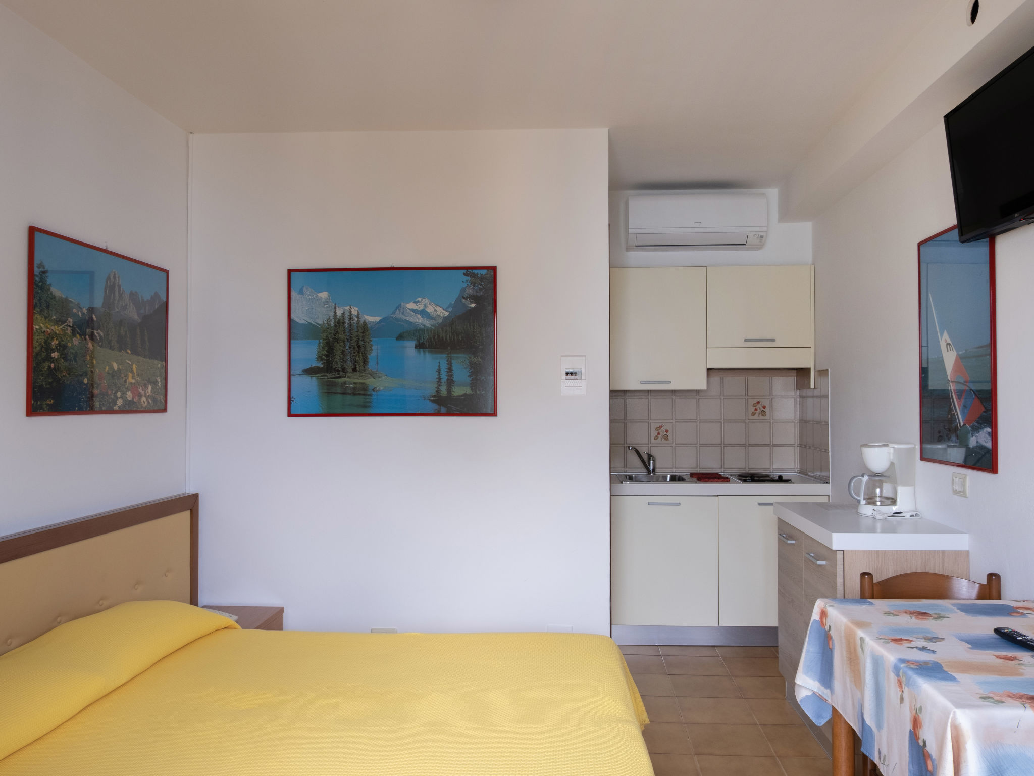 "Studio", 1-Zimmer-Wohnung 18 m2, im Erdgeschoss. Zweckmässig eingerichtet: Wohn-/Schlafzimmer mit 1 Doppelbett, Esstisch und Sat-TV. Offene Küche (2 Kochplatten, elektrische Kaffeemaschine). Dusche/WC. G-Heizung. Terrasse. Terrassenmöbel. Sicht auf den See. Zur Verfügung: Babybett (extra), Haartrockner. Internet (Wireless LAN, gratis). Bitte beachten: Nichtraucher-Unterkunft.