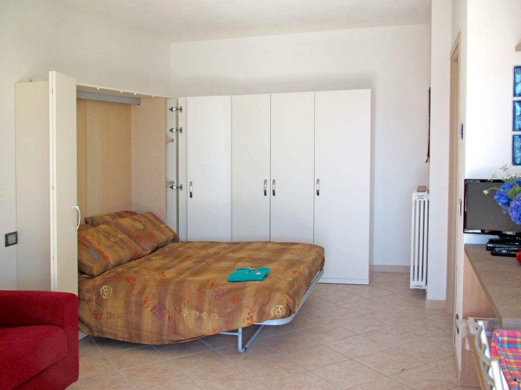 1-Zimmer-Wohnung, Erdgeschoss, ca. 30 m². Separater Zugang über Außentreppe und Terrasse in Wohn-/Schlafraum mit Bettcouch, franz. Bett (1,60 m breit, tagsüber in Schrank hochklappbar), Küchenzeile (4 Flammen, Backofen, Kühlschrank, Kaffeemaschine, Wasserkocher, Toaster) mit Theke. Dusche/Bidet//WC. CIR: 013249-CNI-00126