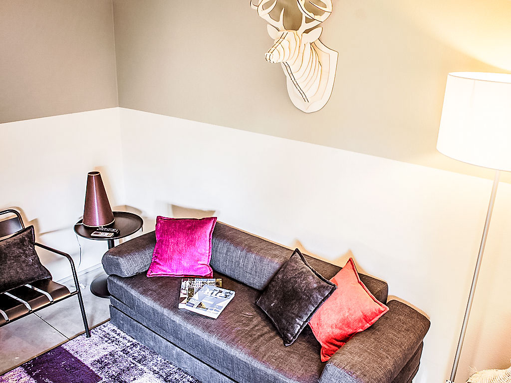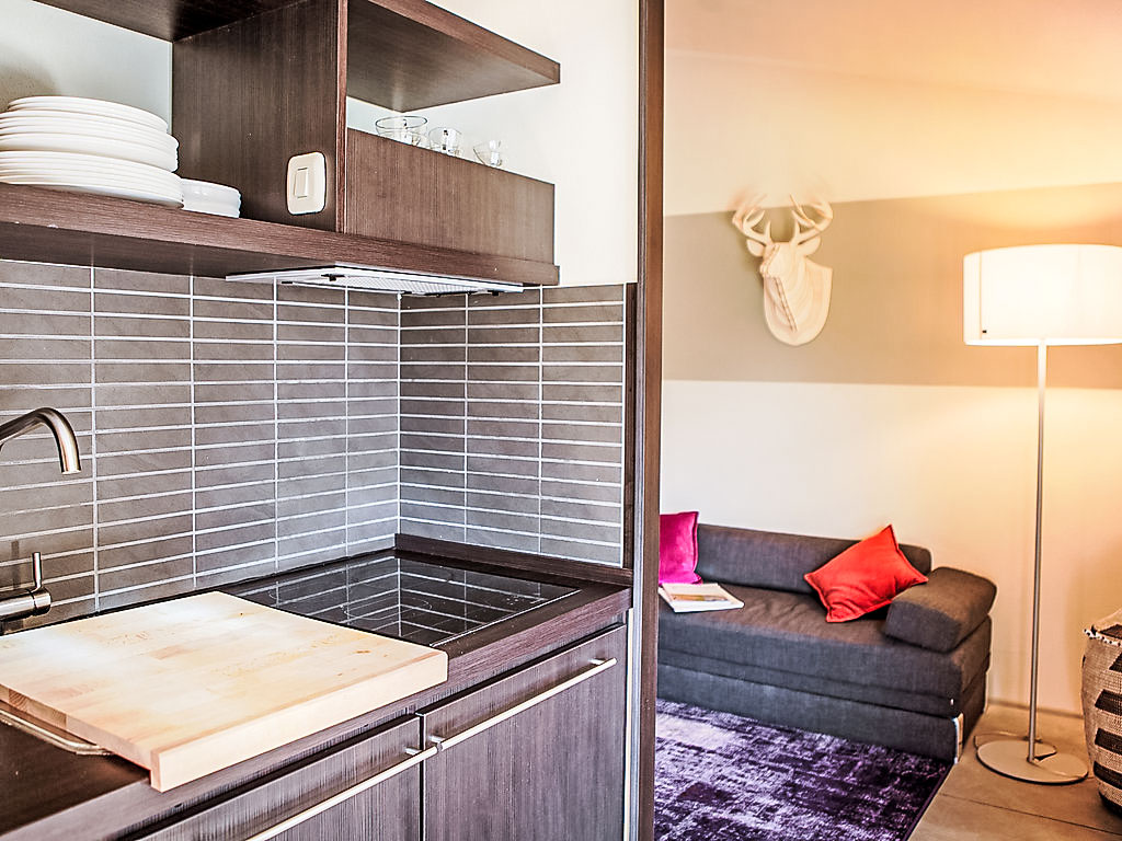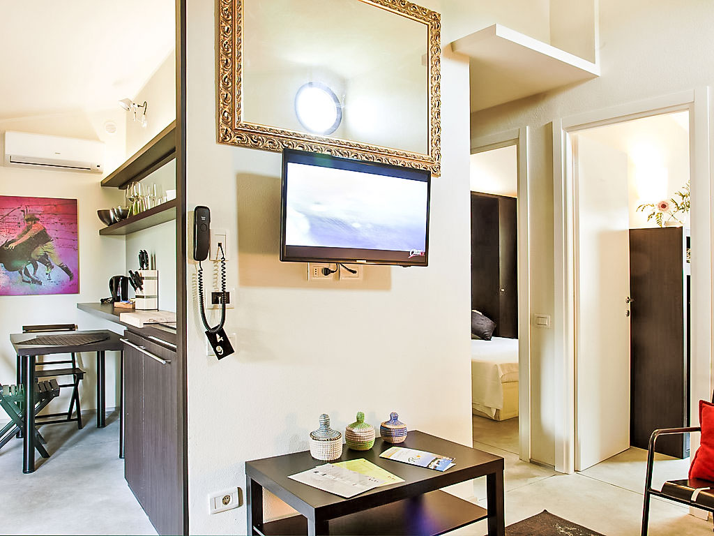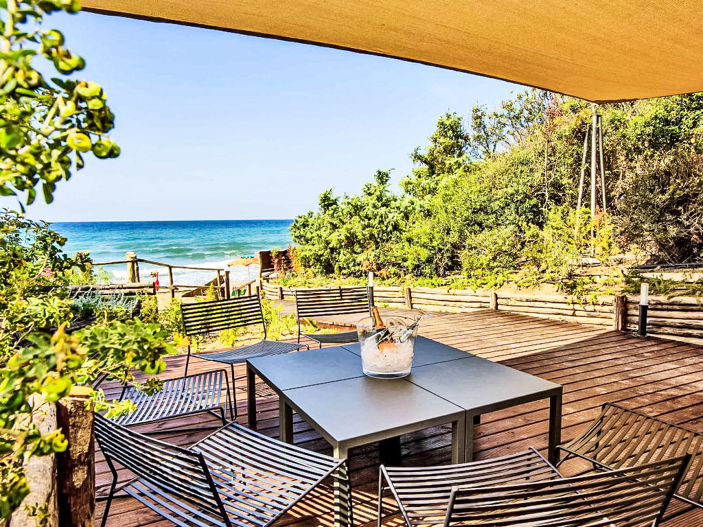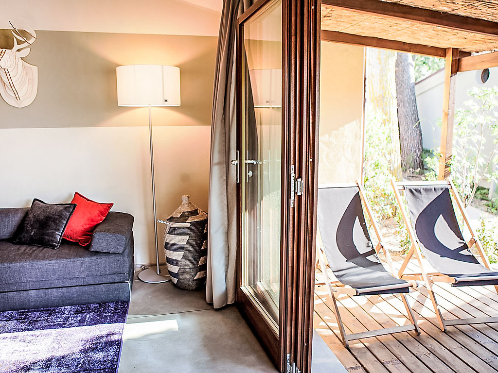 "Deluxe", 3-Zimmer-Haus 40 m2, im Erdgeschoss. Modern und stilvoll eingerichtet: Wohn-/Esszimmer mit 1 Doppeldiwanbett, Küchenblock und Digital-TV. Ausgang zur Terrasse. 1 Doppelzimmer mit Digital-TV. 1 kleines Zimmer mit 2 Betten. Dusche/Bidet/WC. Klimaanlage. Gartensitzplatz. Sitzplatz. Die Unterbringun von Behinderten muss im Voraus beantragt werden.
