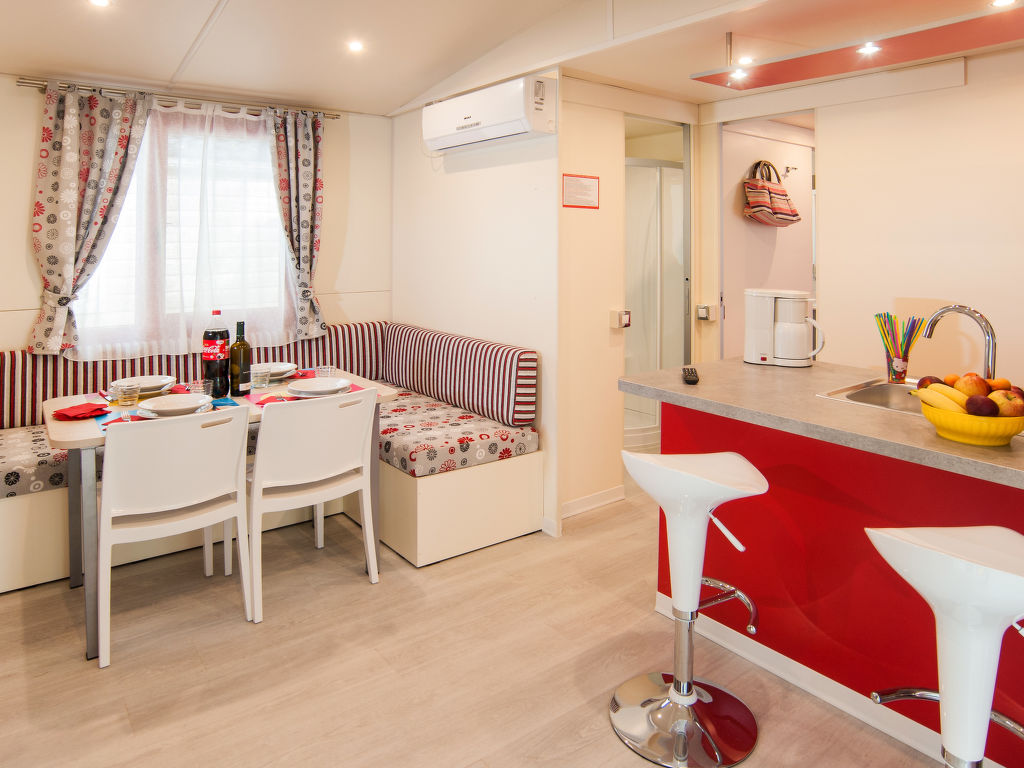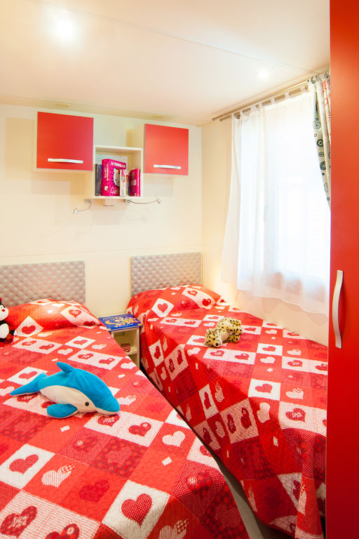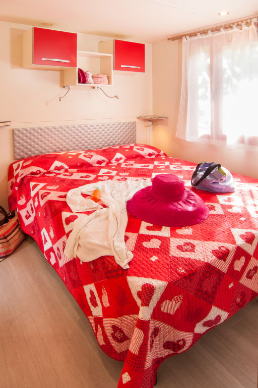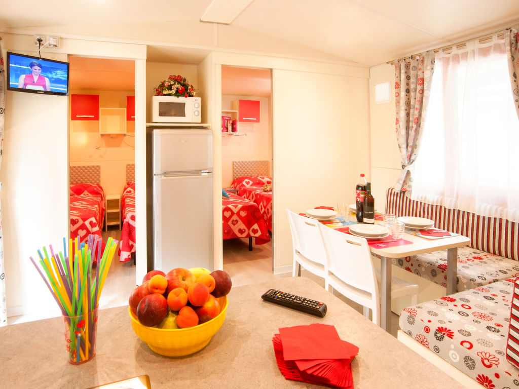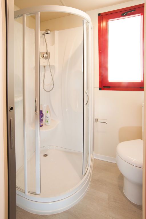 4-Zimmer-Mobilhome, ca. 34 m². Über 5 Stufen und Terrasse Zugang zu: Wohn-/Schlafraum mit Bettcouch, Essplatz, davon räumlich durch Theke (2 Barhocker) abgetrennte Küchenzeile (4 Flammen, Mikrowelle, Kühl-/Gefrierkombination, Kaffeemaschine). Schlafzimmer mit franz. Bett und Dusche/WC. 2 Zweibettzimmer (Bettenbreite jeweils 75 cm). Dusche/WC. Maximale Belegung: 6 Erwachsene. Flexibilität bei der Bettenaufteilung: Es stehen mehr Schlafmöglichkeiten zur Verfügung als die maximal zugelassene Personenzahl, diese darf dennoch nicht überschritten werden.
