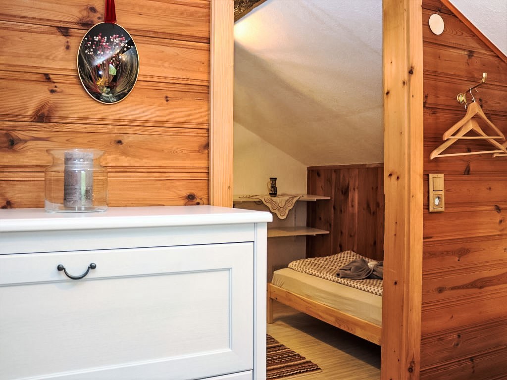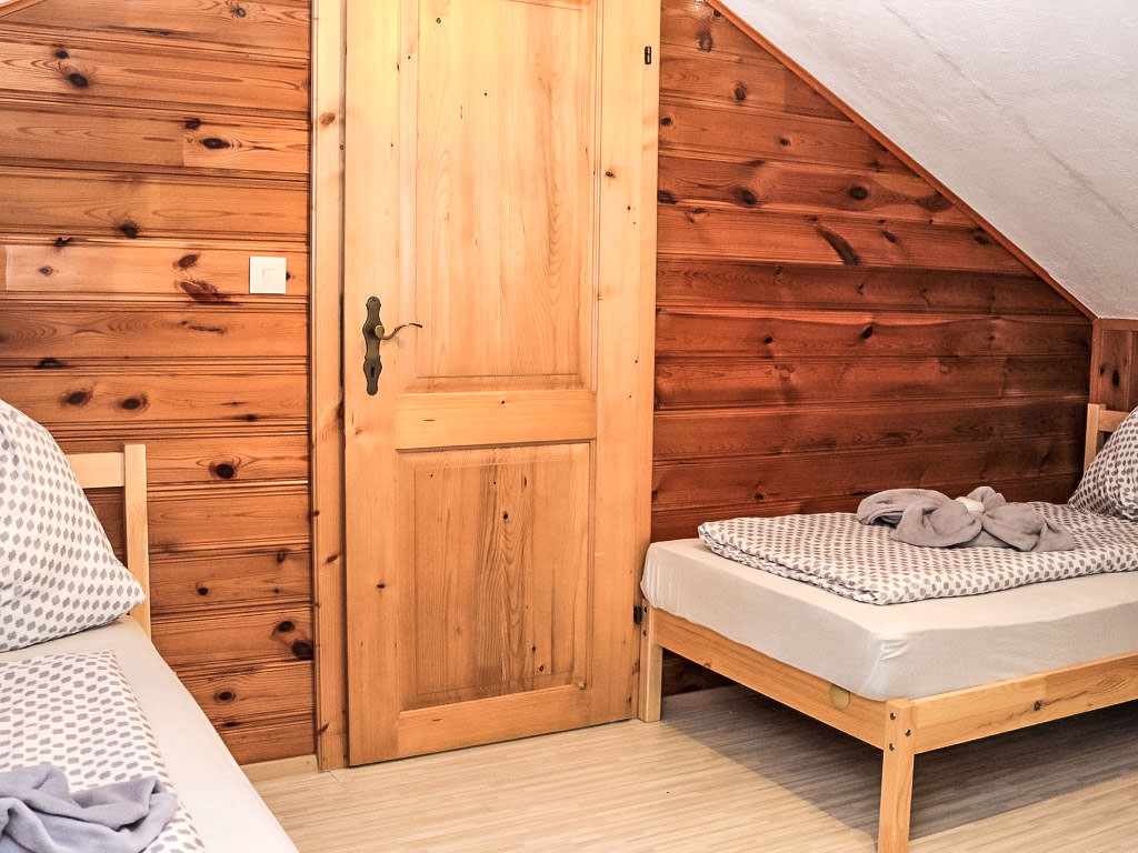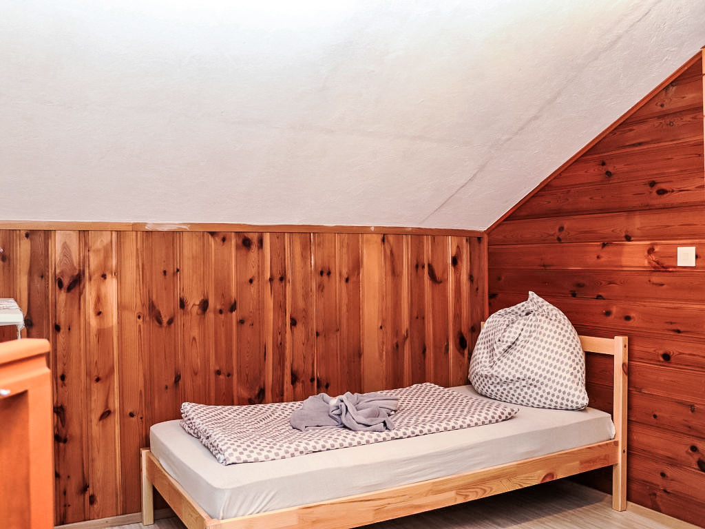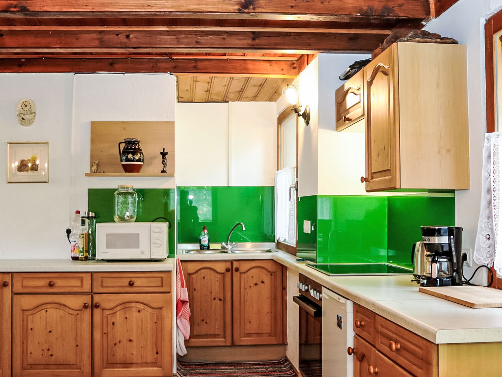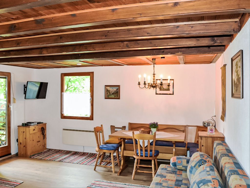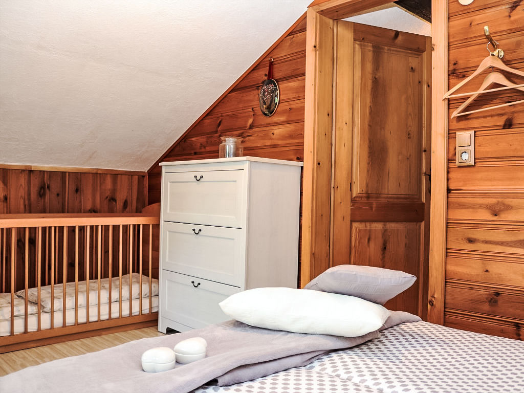 3-Zimmer-Haus 80 m2 auf 2 Stockwerken. Objekt geeignet für 2 Erwachsene + 2 Kinder. Teilweise abgeschrägt, gemütlich und mit viel Holz eingerichtet: grosses Wohn-/Esszimmer mit 1 Doppeldiwanbett, Essecke und Sat-TV (Flachbildschirm), Stereoanlage und DVD. Ausgang zur Terrasse. Offene Küche (Backofen, 4 Glaskeramikherd Platten, Mikrowelle, elektrische Kaffeemaschine). Dusche/WC. E-Heizung. Obergeschoss: (steile Treppe) 1 offenes Kinderzimmer mit 2 Betten (90 cm, Länge 180 cm). 1 Zimmer mit 1 franz. Bett (160 cm, Länge 200 cm). Ausgang zur Loggia. Holzböden. Terrasse teilweise überdacht, Gartensitzplatz. Terrassenmöbel, Balkonmöbel, Gartengrill, Liegestühle. Zur Verfügung: Bügeleisen, Fliegengitter, Kinderhochstuhl, Babybett, Haartrockner. Bitte beachten: geeignet für Familien. Nichtraucher-Haus. 1 kleines Haustier/Hund erlaubt. Rauchmelder, Feuerlöscher.