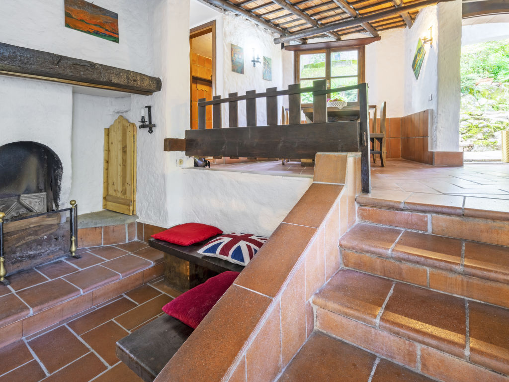 3½-Zimmer-Haus, 2 Etagen, ca. 90 m². Zugang von der Hangseite in die 1. Etage: Diele mit Essplatz, 3 Stufen tiefer Wohn-/Schlafraum mit Doppelbettcouch und Balkonausgang. Küche (5 Flammen, Backofen, Kühl-/Gefrierkombination, Kaffeemaschine, Toaster)und Ausgang ins Freie. Sep.WC. Zwischenebene: Kamin mit Sitzecke (Bänke). Erdgeschoss: Flur mit Terrassenausgang. Schlafzimmer mit franz. Bett (1,60 m breit). Schlafzimmer mit Etagenbett. Bad/WC. CIR: 012088-CIM-00001