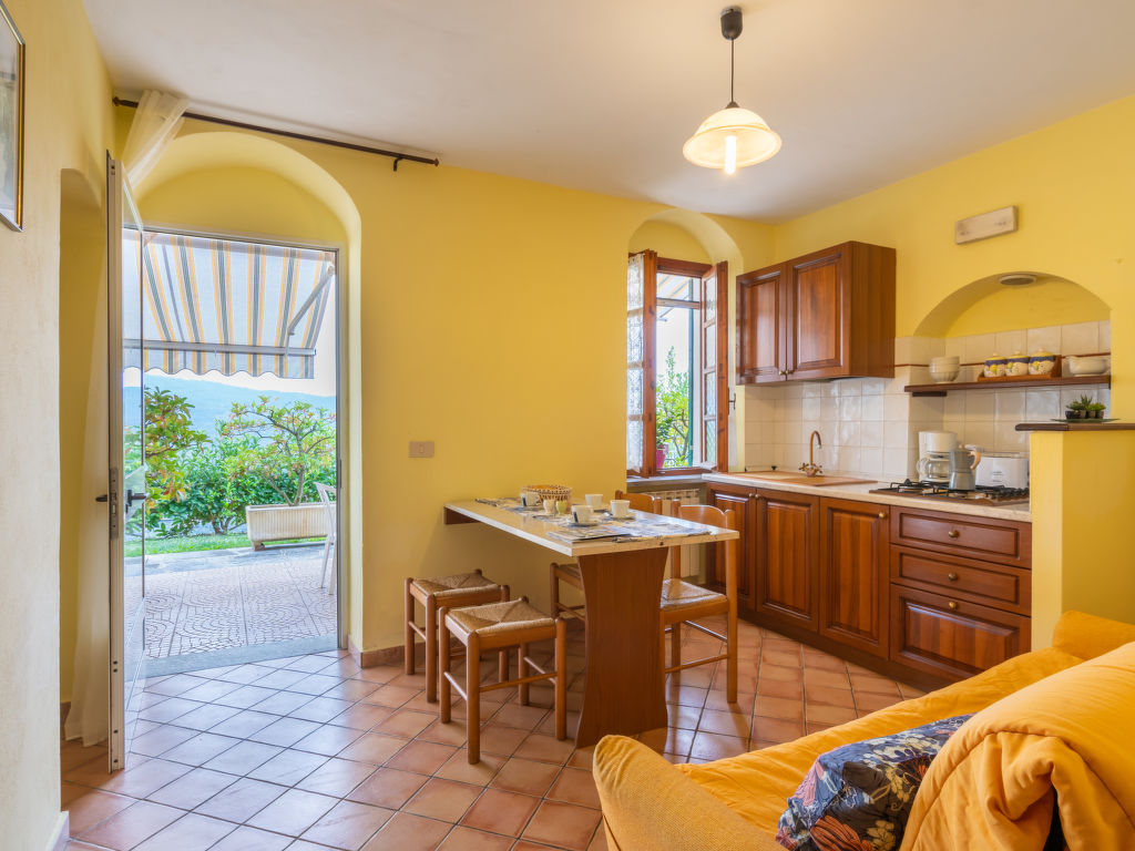 2-Zimmer-Wohnung 'Viola', Erdgeschoss, ca. 30 m². Wohn-/Schlafraum mit Doppelbettcouch, Essplatz, Küchenzeile (4 Flammen, Kühlschrank, Kaffeemaschine, Wasserkocher, Toaster) und Terrassenausgang. Von hier Zugang zu Doppelzimmer (Bett 1,60 m breit) mit Dusche/WC. Vor dem Eingangsbereich Terrasse (15 m²) mit Markise und Blick bis zum Meer. CITR: 008047-AGR-0005