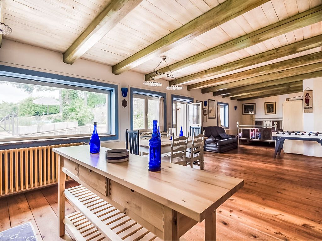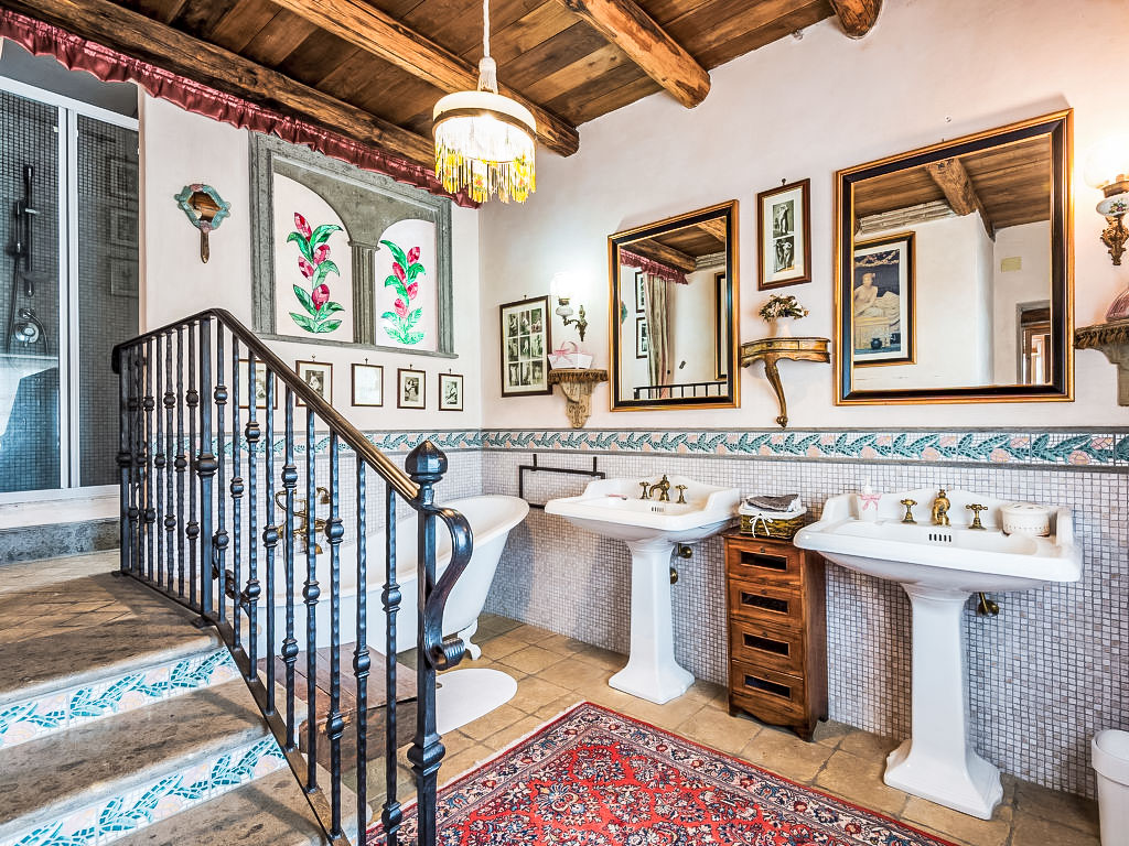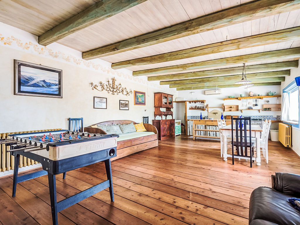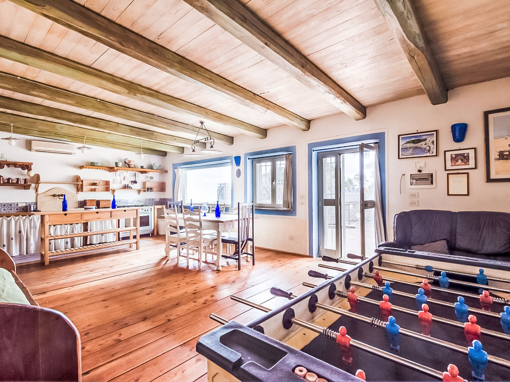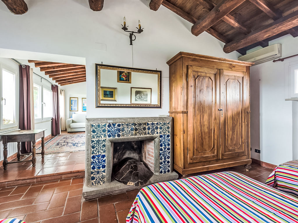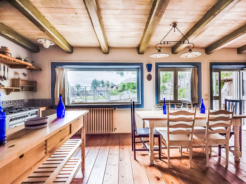 6-Zimmer-Villa 420 m2 auf 3 Stockwerken. Sehr komfortabel und geschmackvoll eingerichtet: Wohnzimmer mit offenem Kamin. Billardzimmer. 1 Zimmer mit 1 Doppeldiwanbett und 1 Doppelbett. Esszimmer. Grosse, offene Küche 30 m2 (5 Kochplatten, Backofen, Geschirrspüler, Mikrowelle, Tiefkühler) mit offenem Kamin, Esstisch und TV. Dusche/Bidet/WC, 2 sep. WC's. Obergeschoss: 1 Doppelzimmer mit Dusche/Bidet/WC. Ausgang zum Balkon. 1 grosses Zimmer mit 1 Doppelbett und Bad/Dusche/Bidet/WC. Ausgang zum Balkon. 1 Doppelzimmer. (geländerlose Treppe) abgeschrägte, offene Galerie mit 1 Bett. Dusche/Bidet/WC. 2. Obergeschoss: (Wendeltreppe) 1 grosses Zimmer mit Panoramafenster mit 3 Betten und Klimaanlage. Wohnzimmer mit TV und Flachbildschirm. Dusche/WC. Sehr schöne Panoramasicht auf den See und das Tal. Zur Verfügung: Waschmaschine. Internet (Wireless LAN, gratis). Das Zimmer im Erdgeschoss mit 1 Doppelbett, 1 Doppelschlafsofa, im Anbau beim Schwimmbad, verfügt über Dusche/WC und separates WC. Kochnische. 9199