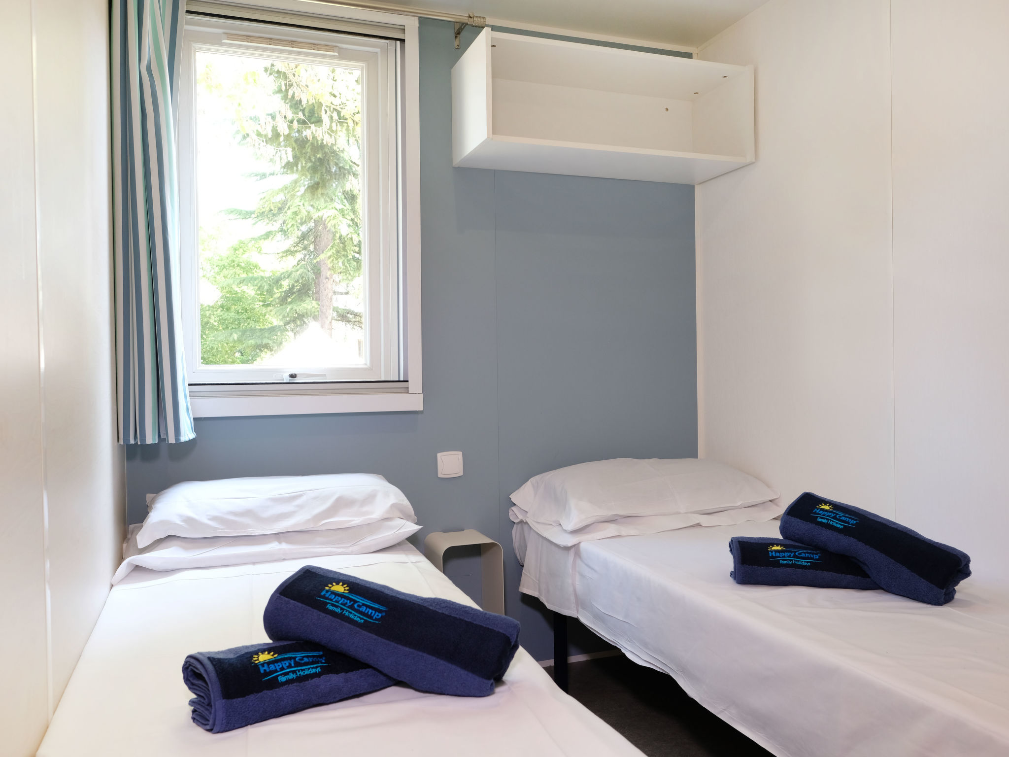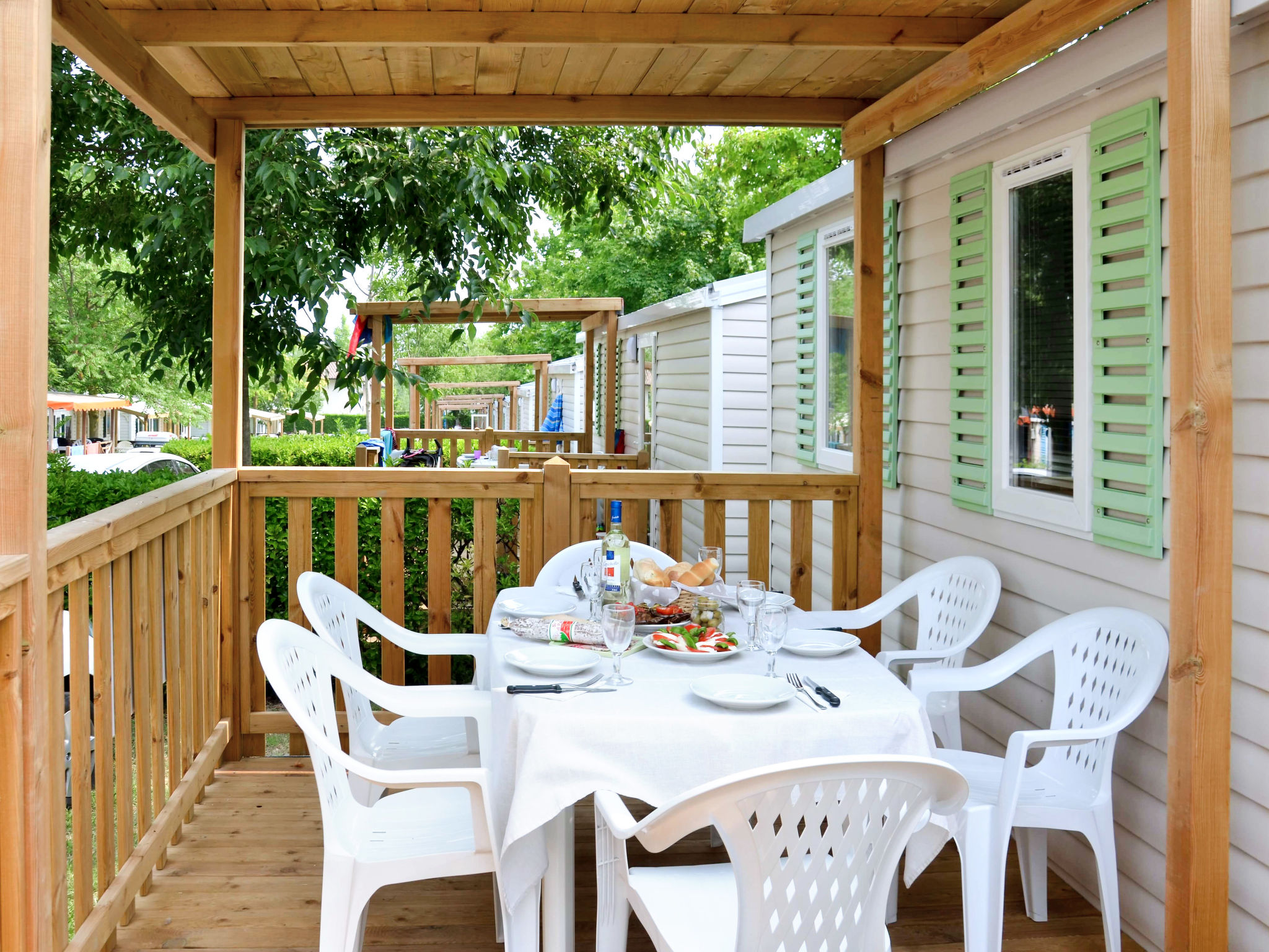 "Happy Premium", 4-Zimmer-Mobilheim 30 m2. Komfortabel eingerichtet: Wohn-/Schlafzimmer mit 1 Diwanbett, Esstisch, E-Heizung und Klimaanlage. 1 Zimmer mit 1 franz. Bett (140 cm). 2 Zimmer, jedes Zimmer mit 2 Betten (70 cm). Offene Küche (4 Kochplatten, Mikrowelle, Tiefkühler, elektrische Kaffeemaschine). Dusche/WC. Terrasse teilweise überdacht. Terrassenmöbel, Elektrogrill (mobil), Liegestühle (2). Zur Verfügung: Fliegengitter. Bitte beachten: Nichtraucher-Unterkunft.