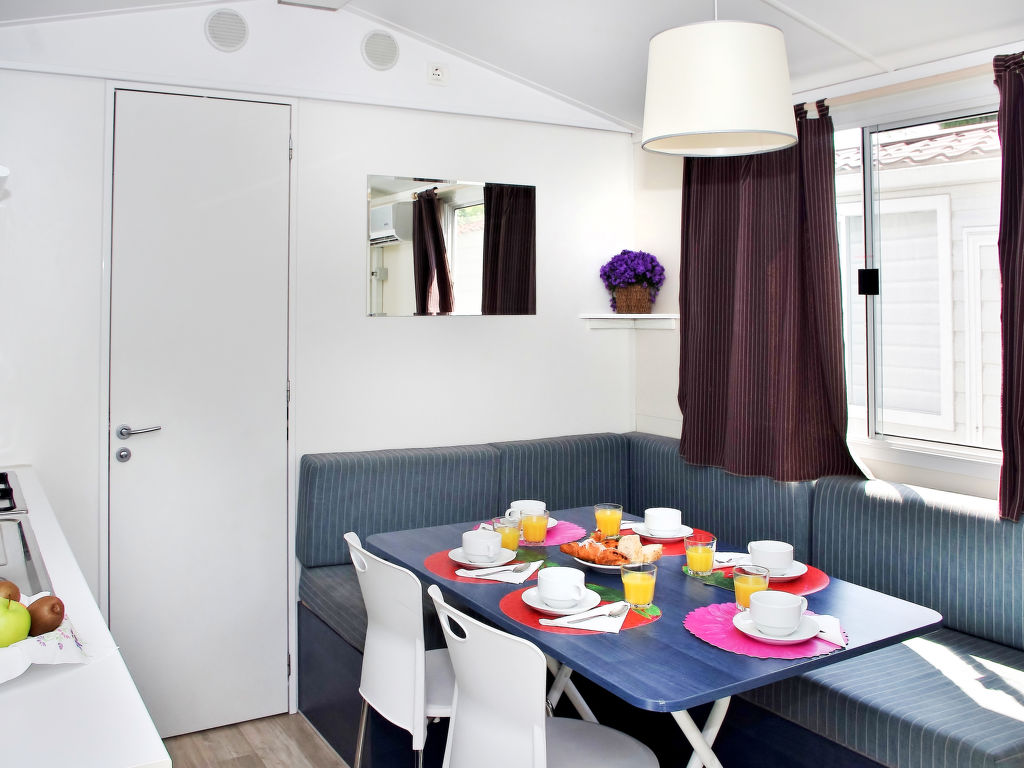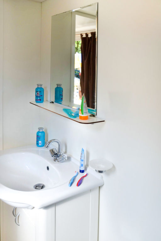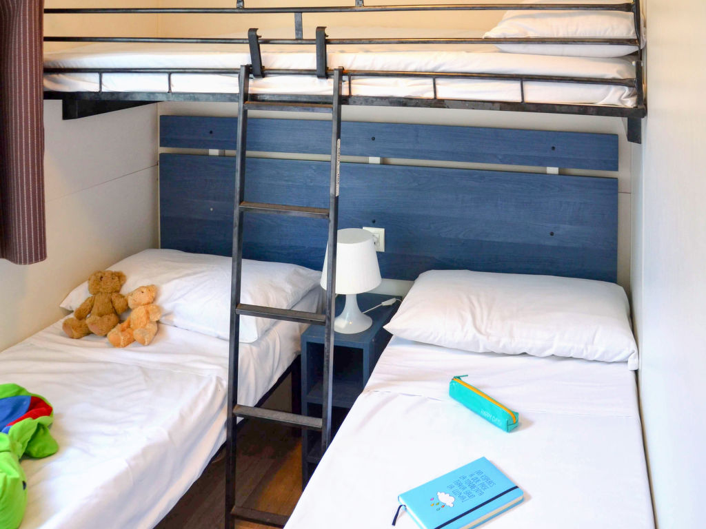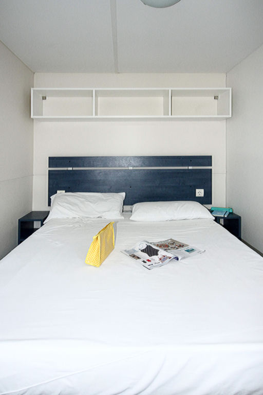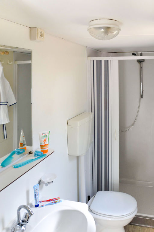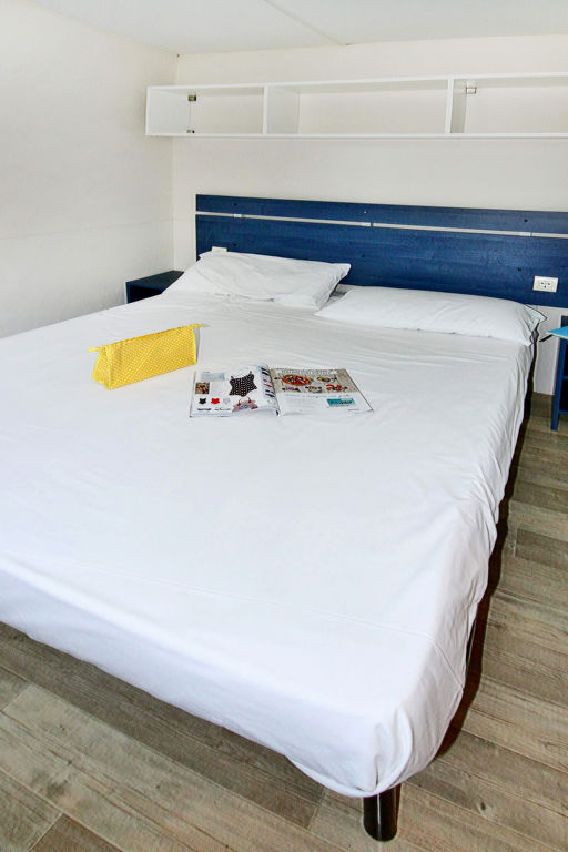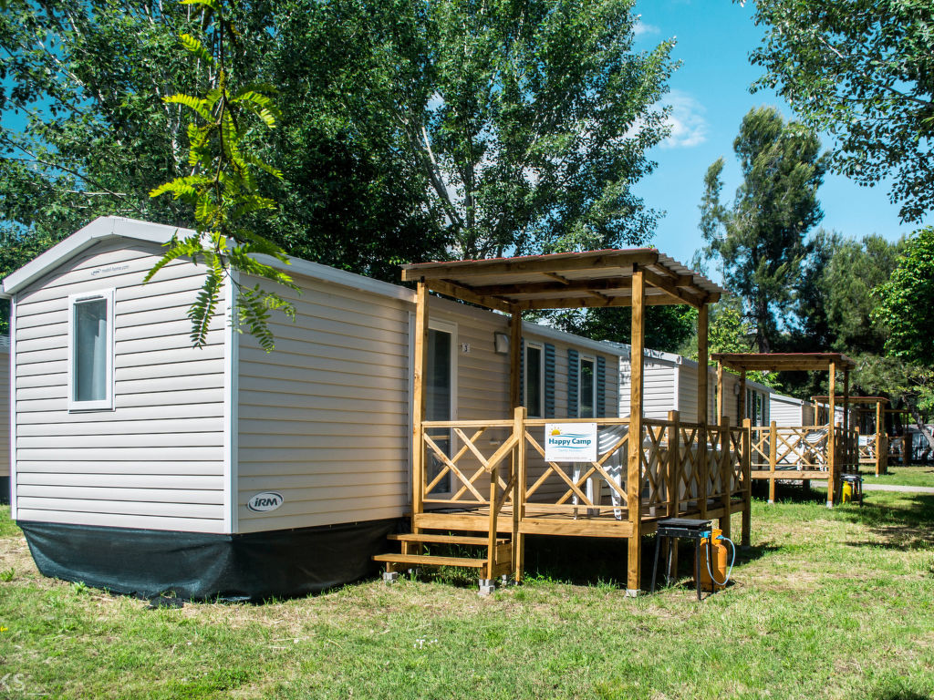 "Happy Standard", 3-Zimmer-Mobilheim 25 m2. Objekt geeignet für 5 Erwachsene + 1 Kind. Zweckmässig eingerichtet: Wohn-/Schlafzimmer mit 1 Diwanbett, Esstisch, E-Heizung und Klimaanlage. 1 Zimmer mit 1 franz. Bett (140 cm). 1 Zimmer mit 2 Betten (70 cm), 1 x 1 Etagenbetten (Länge 150 cm). Offene Küche (4 Kochplatten). Dusche/WC. Terrasse teilweise überdacht. Terrassenmöbel, Elektrogrill (mobil), Liegestühle (2). Zur Verfügung: Fliegengitter. Bitte beachten: Nichtraucher-Unterkunft. Maximal 1 kleines Haustier/Hund erlaubt.