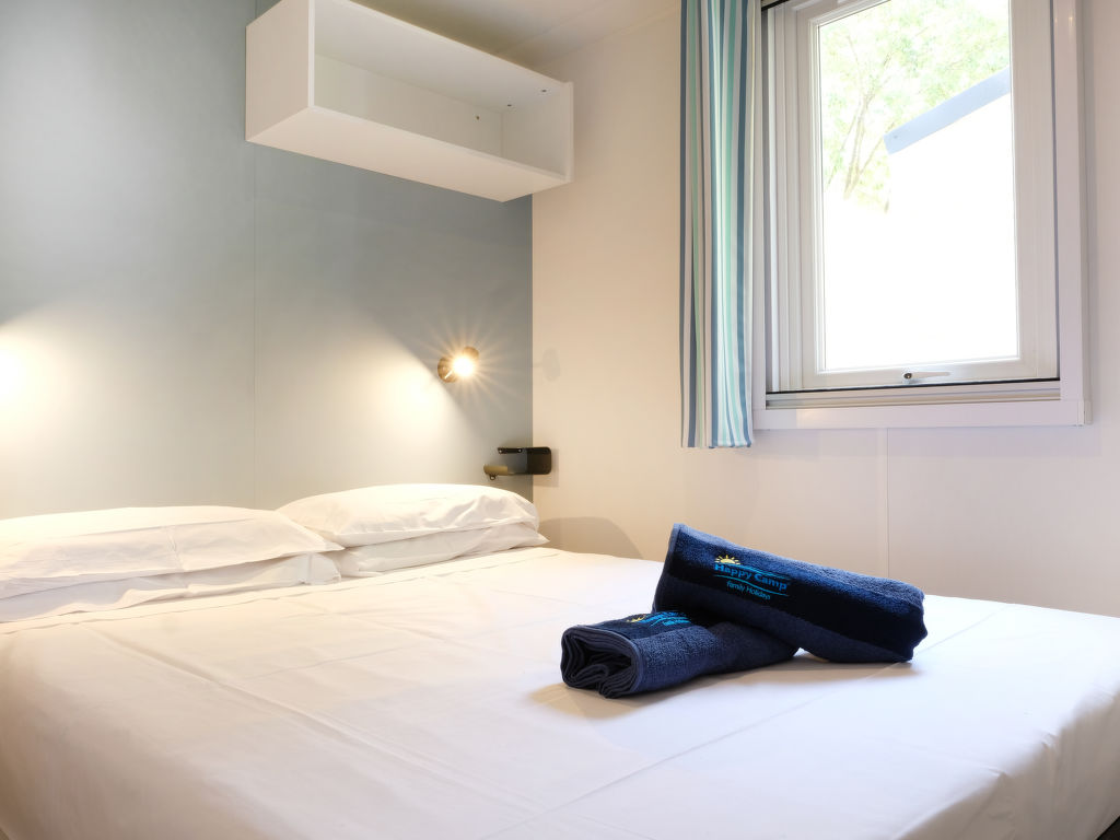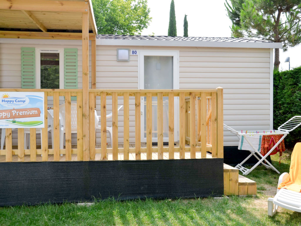 "Happy Premium", 4-Zimmer-Mobilheim 30 m2. Komfortabel eingerichtet: Wohn-/Schlafzimmer mit 1 Diwanbett, Esstisch, E-Heizung und Klimaanlage. 1 Zimmer mit 1 franz. Bett (140 cm). 2 Zimmer, jedes Zimmer mit 2 Betten (70 cm). Offene Küche (4 Kochplatten, Mikrowelle, Tiefkühler, elektrische Kaffeemaschine). Dusche/WC. Terrasse 9 m2 teilweise überdacht. Terrassenmöbel, Elektrogrill (mobil), Liegestühle (2). Zur Verfügung: Fliegengitter. Bitte beachten: Nichtraucher-Unterkunft.