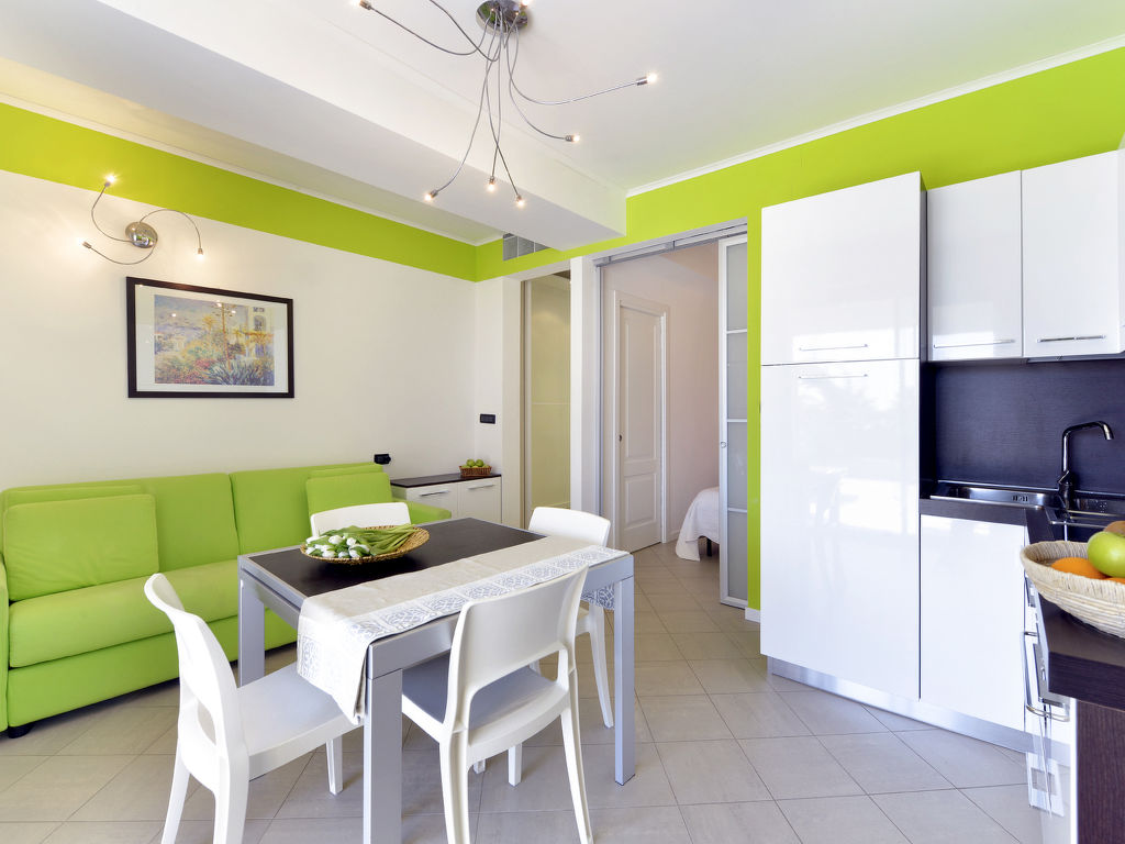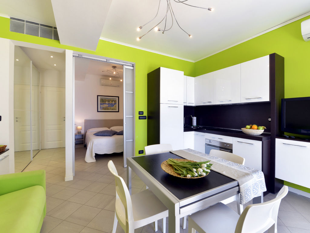 2-Zimmer-Wohnung 'Verde', 1. Etage, ca. 75 m². Wohn-/Schlafraum mit Doppelbettcouch, Essplatz, Küchenzeile (4 Induktionsfelder, Backofen, Geschirrspüler, Kühl-/Gefrierkombination, Kaffeemaschine, Wasserkocher, Toaster) und Terrassenausgang. Schlafzimmer mit franz. Bett (1,60 m breit). Dusche/Bidet/WC. CITRA: 008056-LT-0140