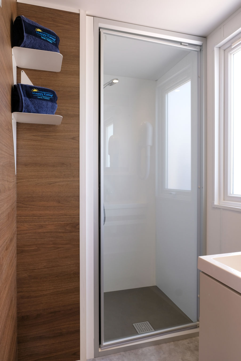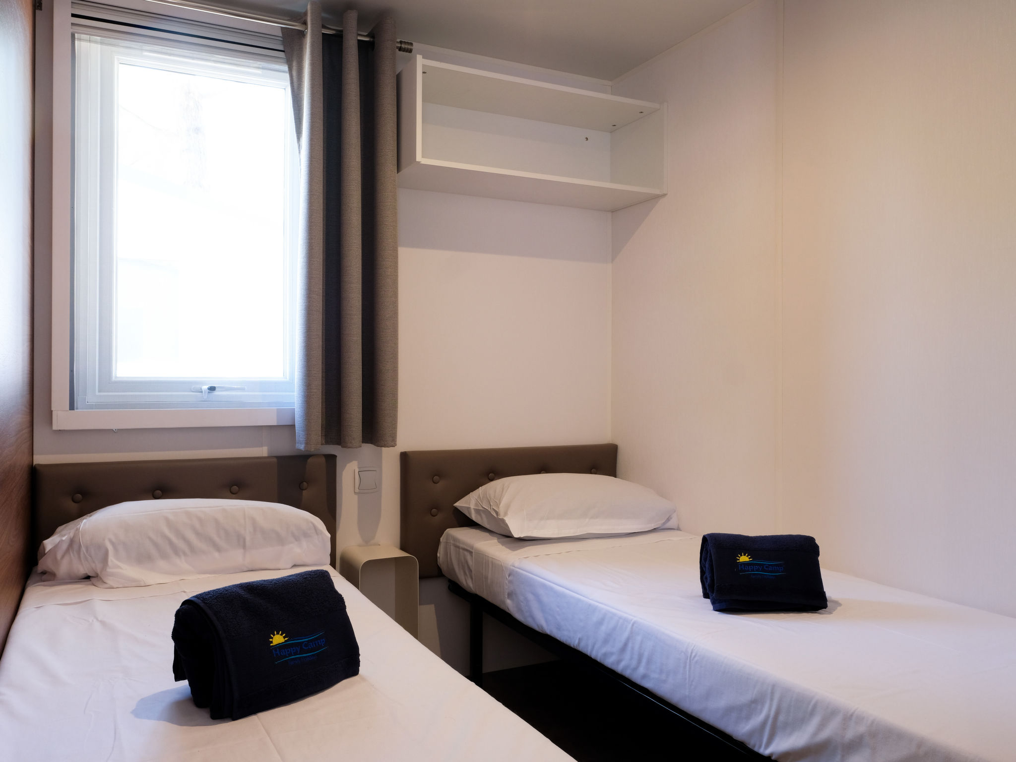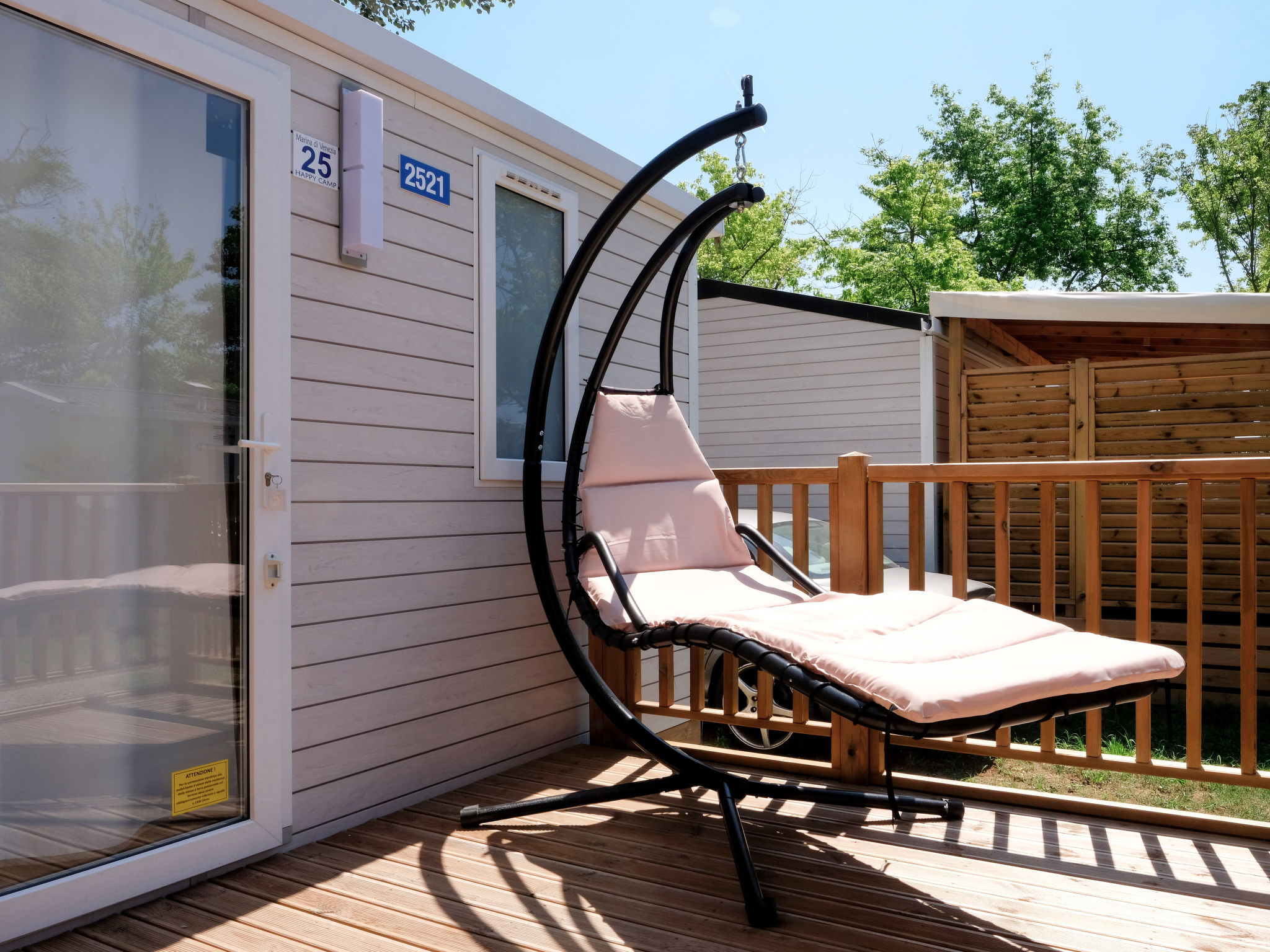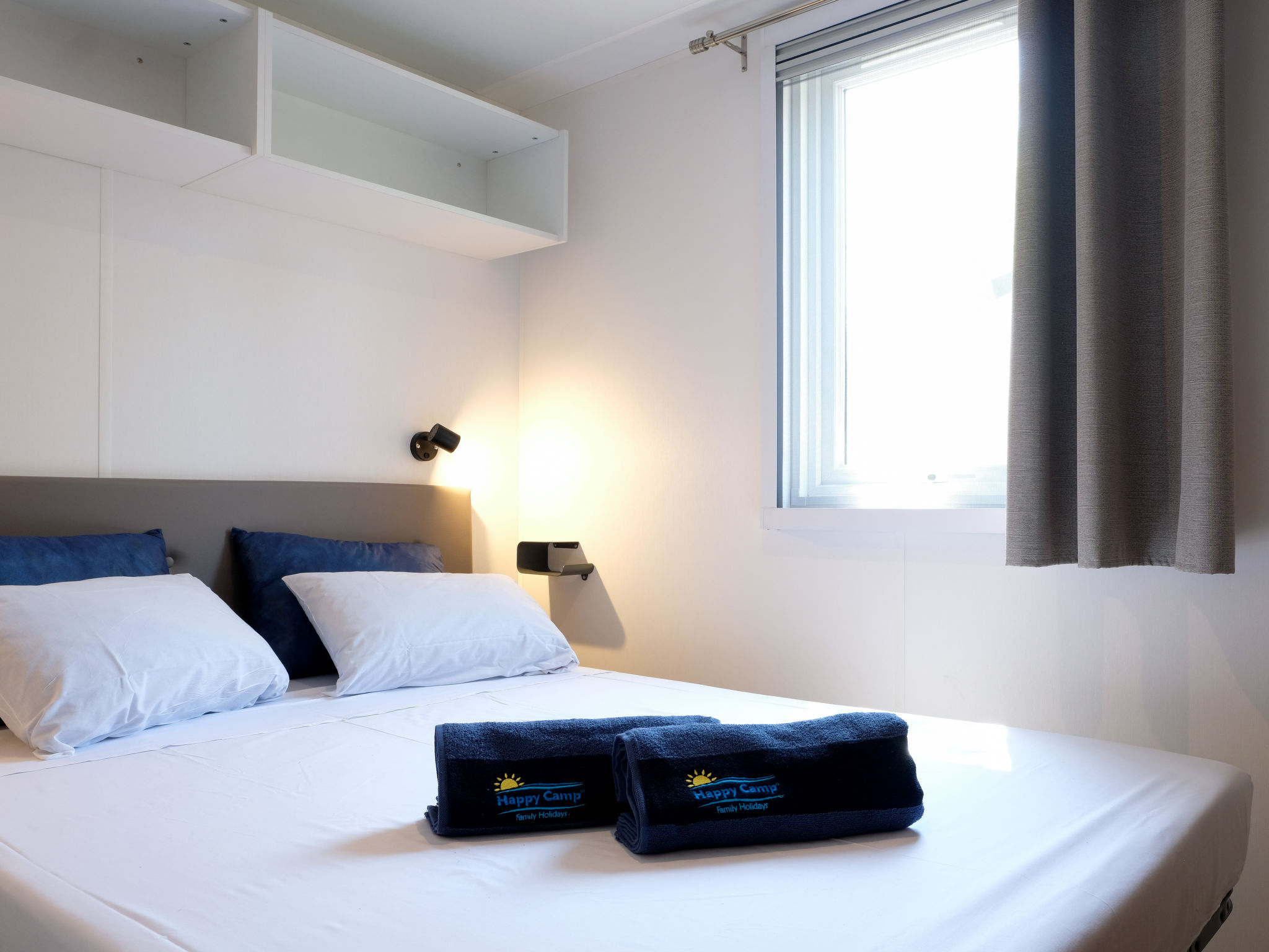 "Happy Premium Suite", 4-Zimmer-Mobilheim 30 m2. Komfortabel eingerichtet: Wohn-/Schlafzimmer mit 1 Diwanbett, Esstisch, E-Heizung und Klimaanlage. 1 Zimmer mit 1 franz. Bett (140 cm). 2 Zimmer, jedes Zimmer mit 2 Betten (70 cm). Offene Küche (4 Kochplatten, Mikrowelle, Tiefkühler, elektrische Kaffeemaschine). Dusche/WC. Terrasse teilweise überdacht. Terrassenmöbel, Gartengrill (mobil), Liegestühle (2). Zur Verfügung: Fliegengitter. Bitte beachten: Nichtraucher-Unterkunft.