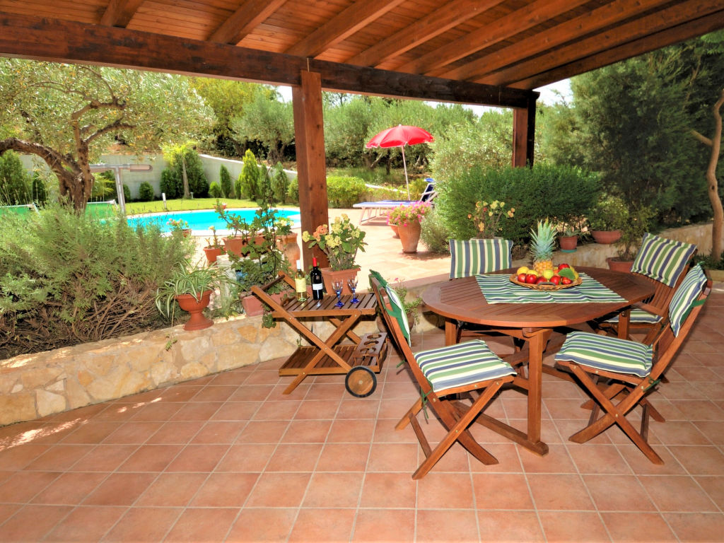 5-Zimmer-Villa 160 m2 auf 2 Stockwerken. Komfortabel und geschmackvoll eingerichtet: Wohn-/Esszimmer mit TV (Flachbildschirm). Ausgang zur Veranda, zum Schwimmbad. 2 Doppelzimmer, jedes Zimmer mit Klimaanlage und Warmluftheizung. Kochnische (4 Kochplatten, Backofen, Toaster, Wasserkocher, Mikrowelle, Tiefkühler). Dusche/Bidet/WC. Obergeschoss: (Wendeltreppe) 1 Zimmer mit 2 Betten, Klimaanlage und Warmluftheizung. 1 Zimmer mit 1 Bett, Klimaanlage und Warmluftheizung. Dusche/Bidet/WC. Grosser Balkon 12 m2, grosser Gartensitzplatz 20 m2, überdacht. Terrassenmöbel, Gartengrill, Liegestühle. Sicht auf das Schwimmbad und die Ortschaft. Zur Verfügung: Waschmaschine, Bügeleisen, Kinderhochstuhl, Babybett bis 2 Jahre (extra), Haartrockner. Internet (Wireless LAN, gratis). Parkplatz. Bitte beachten: Nichtraucher-Haus. Maximal 1 Haustier/Hund erlaubt.