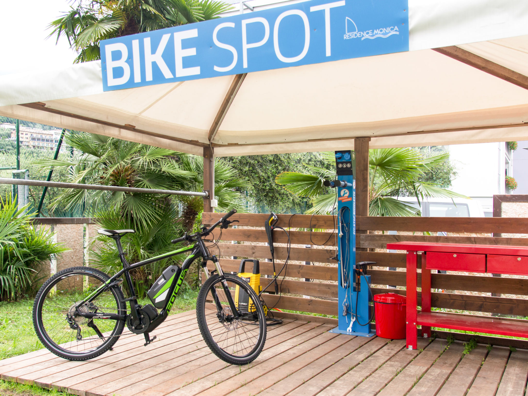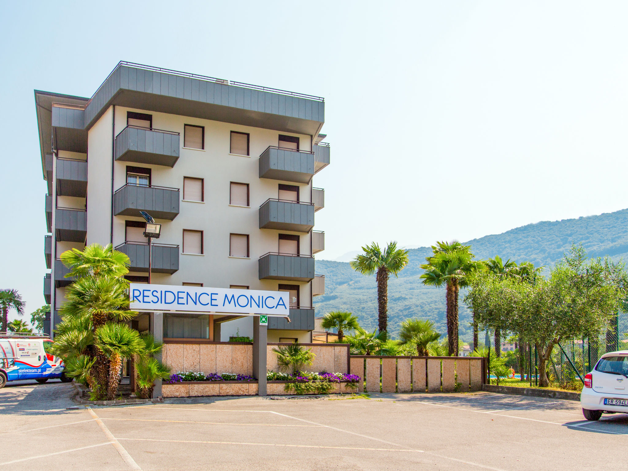 Residenz "Monica", auf 6 Stockwerken. 41 Wohnungen in der Residenz. Im Ort, 1.7 km vom Zentrum von Riva del Garda, 3 km vom Zentrum von Torbole, 450 m vom See, 450 m vom Strand. Zur Mitbenutzung: Grundstück, gepflegter Garten, Schwimmbad (25 x 12 m, 80 - 210 cm tief, saisonale Verfügbarkeit: 15.Mai.-15.Sep.). Aussendusche, Tischtennis, Basketball, Volleyball, Gartenmöbel, Grill, Kinderspielplatz. In der Anlage: Empfang, Bar, Frühstücksraum, Aufenthaltsraum, Fahrstuhl, Einstellraum für Fahrräder, Waschmaschine, Wäschetrockner (zur Mitbenutzung, extra), Fahrradverleih. Frühstück möglich (extra). Parkplatz auf dem Grundstück. Einkaufsgeschäft 300 m, Restaurant 200 m, Zentrum zu Fuss in 20 Minuten erreichbar, Bushaltestelle 200 m, Bahnstation "Rovereto" 23 km, Fähre 2 km, Kieselstrand 450 m. Sporthafen 450 m. Nahe gelegene Sehenswürdigkeiten: Malcesine 16 km, Trento 45 km. Bekannte Seen in der Umgebung sind gut erreichbar: Ledro 15 km. Wandergebiete: Strada del Ponale 4 km. Der Besitzer akzeptiert keine Gruppen.