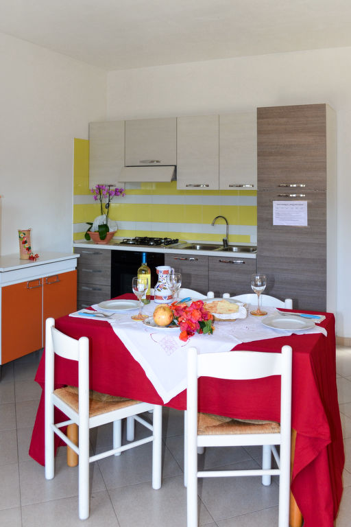 "Sole (TEO230)", 2-Zimmer-Wohnung 35 bis 40 m2. Zweckmässig eingerichtet: Wohn-/Schlafzimmer mit 1 Doppeldiwanbett, Esstisch und TV. 1 Zimmer mit 1 Doppelbett. Kochnische (Backofen, 4 Flammen). Dusche/WC. Keine Heizmöglichkeit. Balkon oder Terrasse. Terrassenmöbel, Balkonmöbel. Zur Verfügung: Waschmaschine, Kinderhochstuhl, Babybett. Maximal 1 kleines Haustier/Hund erlaubt. Beim Mietobjekt handelt es sich um ein Typenhaus bzw. Um eine Typenwohnung.