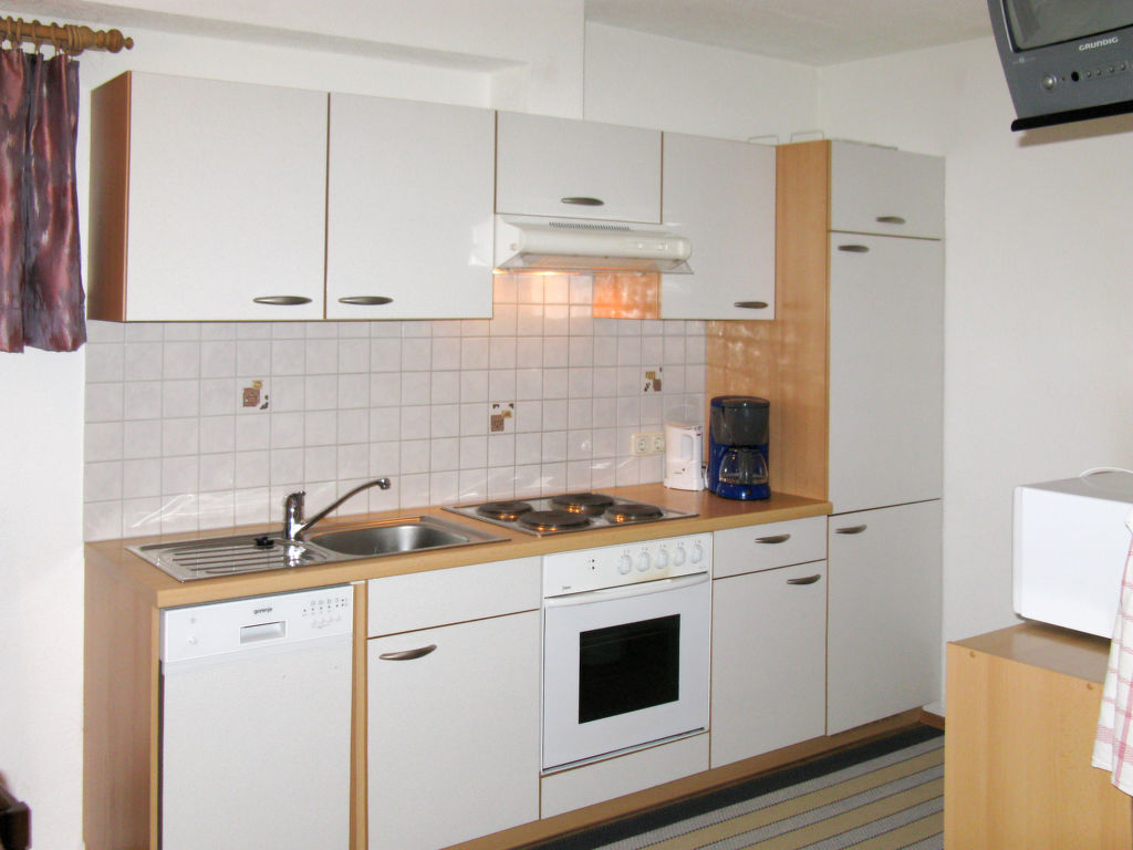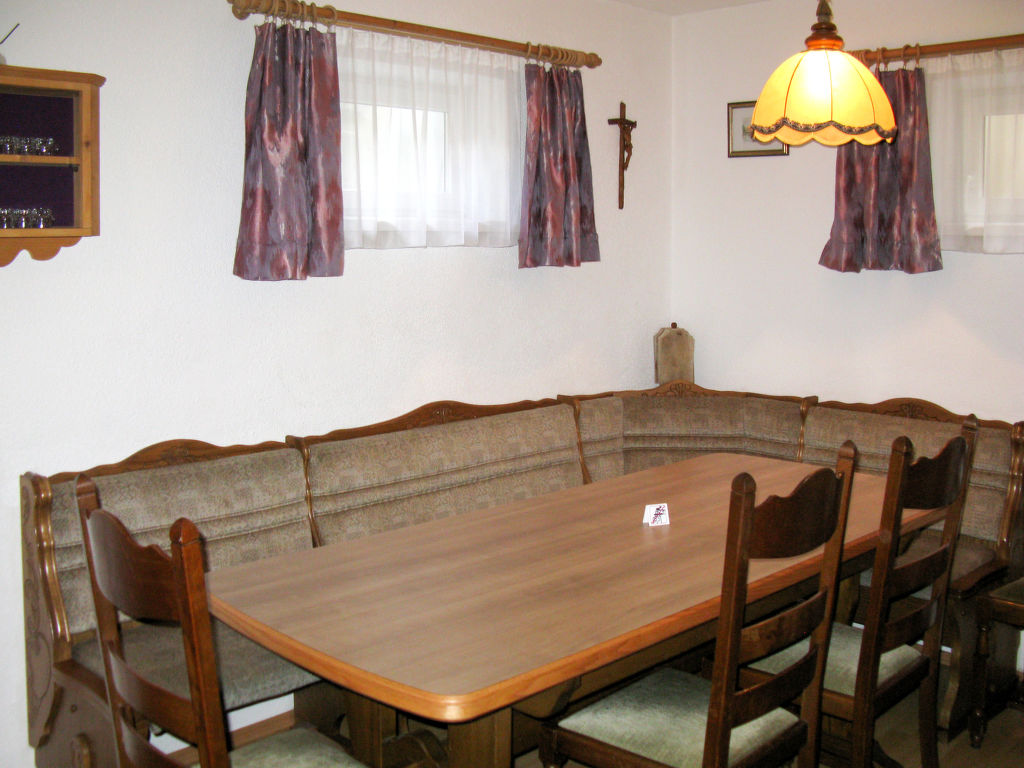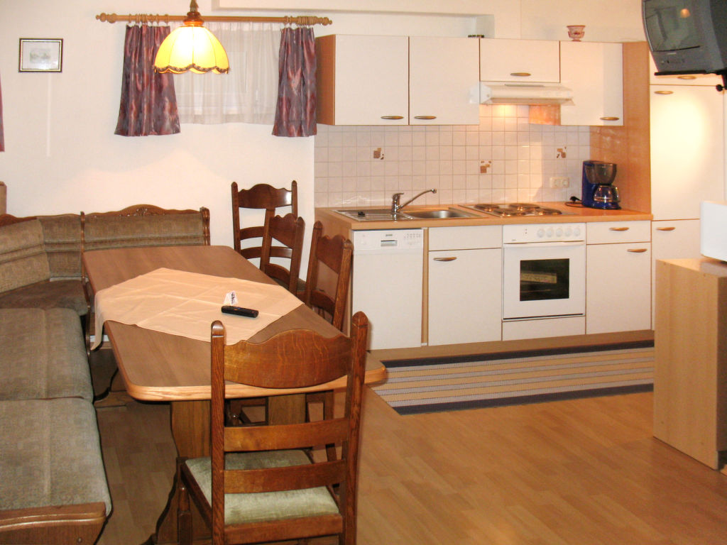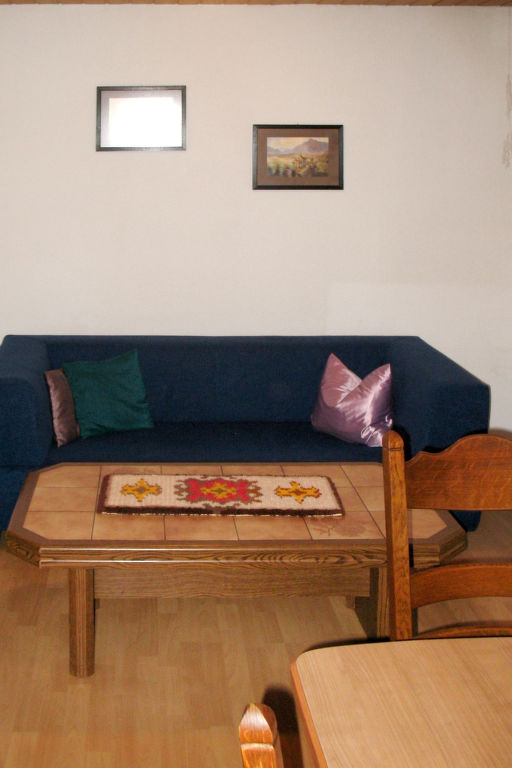 5-Zimmer-Wohnung, Untergeschoss (zum Tal freie Lage), ca. 120 m². Flur mit Garderobe. Wohnküche mit Oberlichtfenster (4 Platten, Backofen, Mikrowelle, Geschirrspüler, Kühlschrank, Kaffeemaschine, Wasserkocher, Toaster), Essplatz (Eckbank) für ca. 8 Personen, Sitzcouch und Couchtisch. 2 Doppelzimmer, jeweils mit Dusche/WC. 2 Schlafzimmer, jeweils mit Doppelbett, Bettcouch und Dusche/WC. Empfohlene Belegung: 8 Personen.
