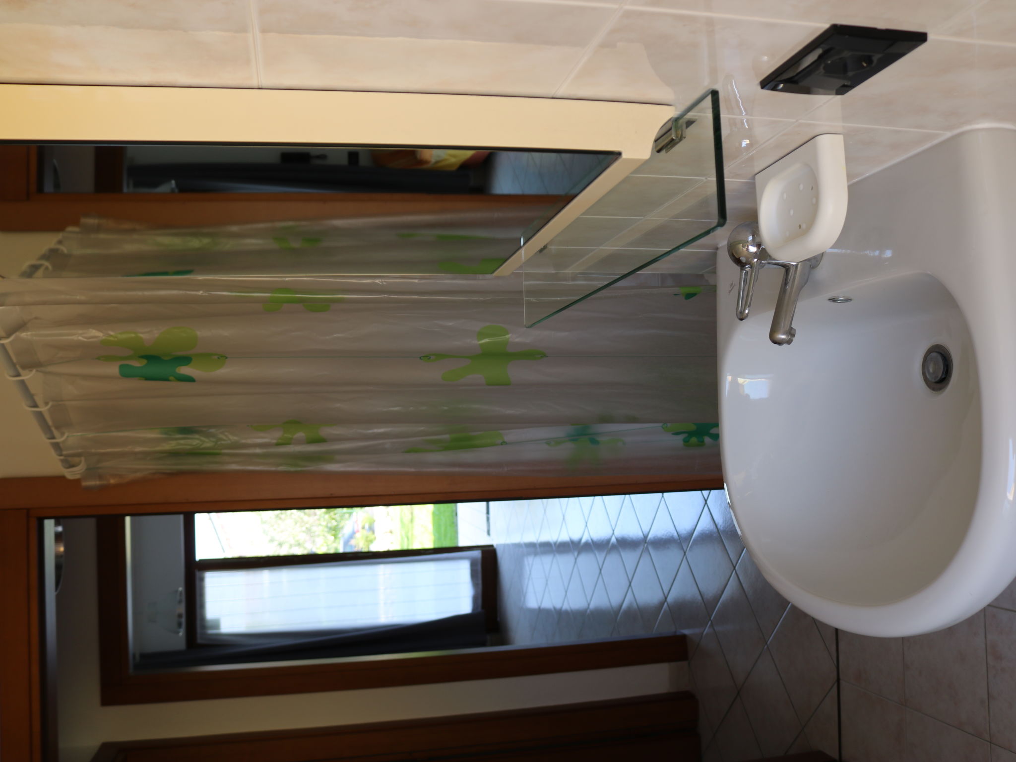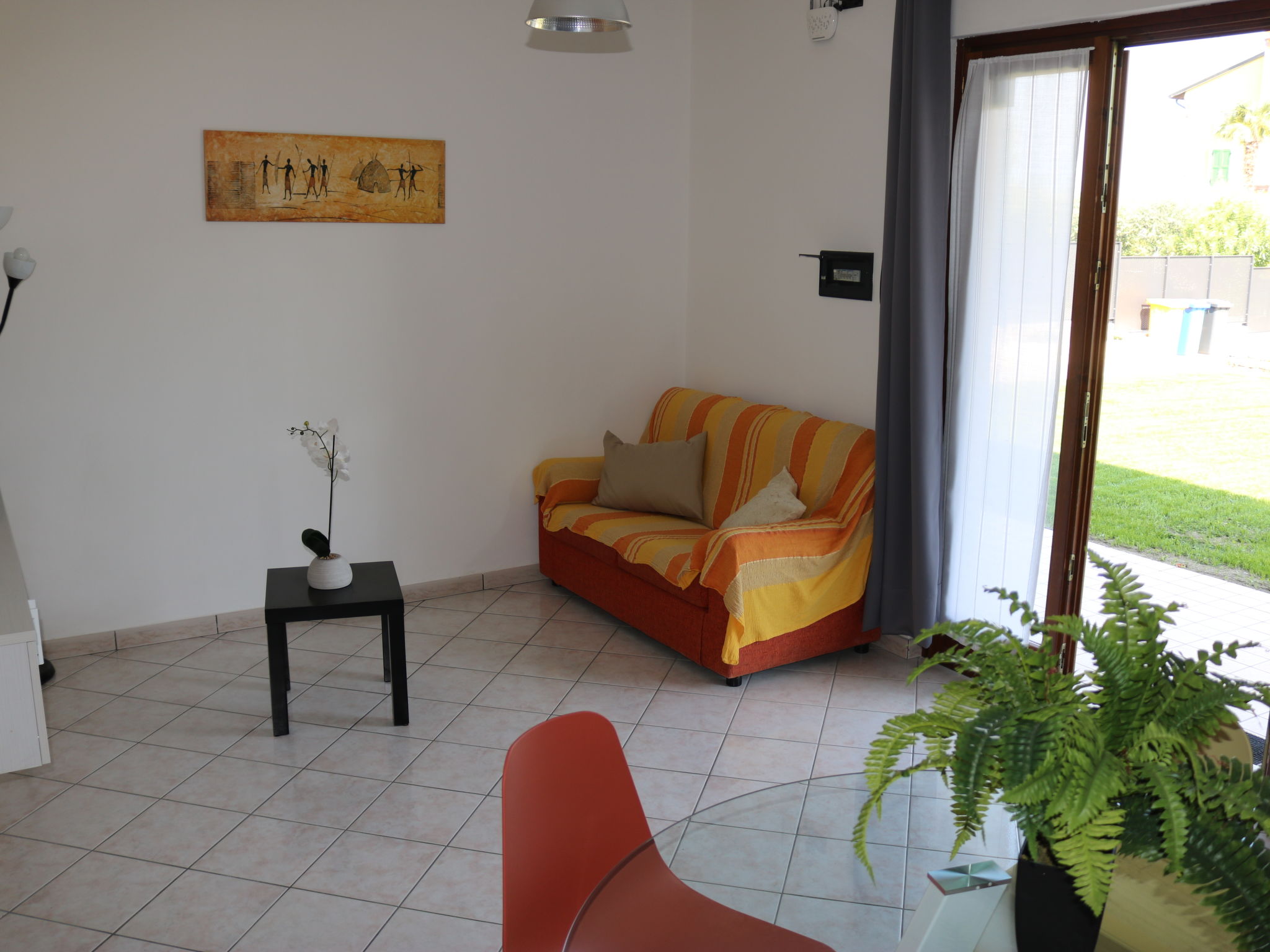 3-Zimmer-Wohnung, Erdgeschoss, ca. 45 m². Wohnraum mit Sitzcouch, Essplatz und Küchenzeile (4 Flammen, Mikrowelle, Kühl-/Gefrierkombination), Terrassenausgang. Doppelzimmer. Zweibettzimmer. Dusche/WC. CIR:M0230430574