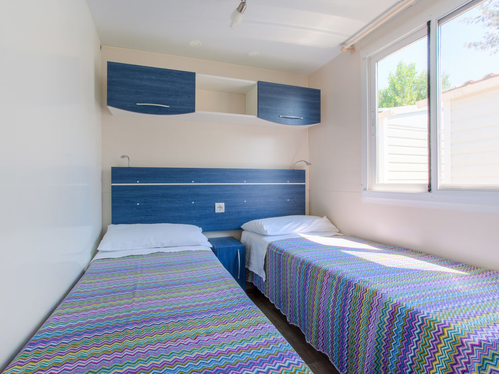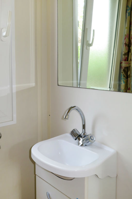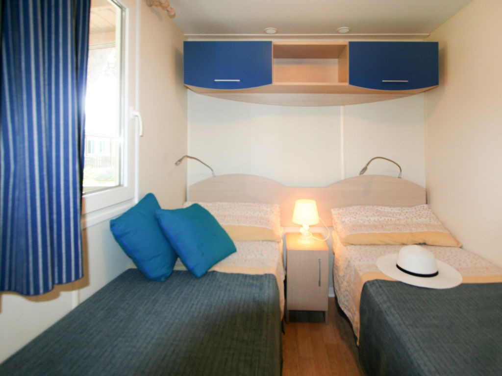 4-Zimmer-Mobilhome, ca. 34 m². Wohnküche (4 Flammen, Mikrowelle, Kühl-/Gefrierkombination) mit Essplatz. Doppelzimmer. 2 Zweibettzimmer. Dusche/WC. Sep.WC.