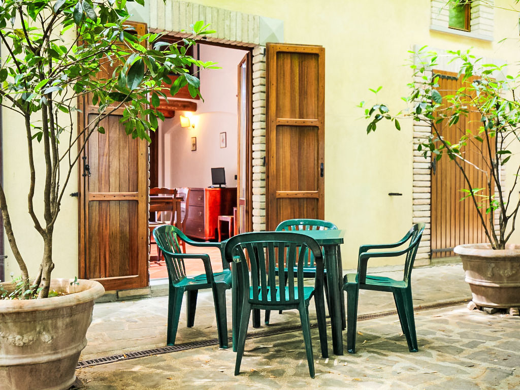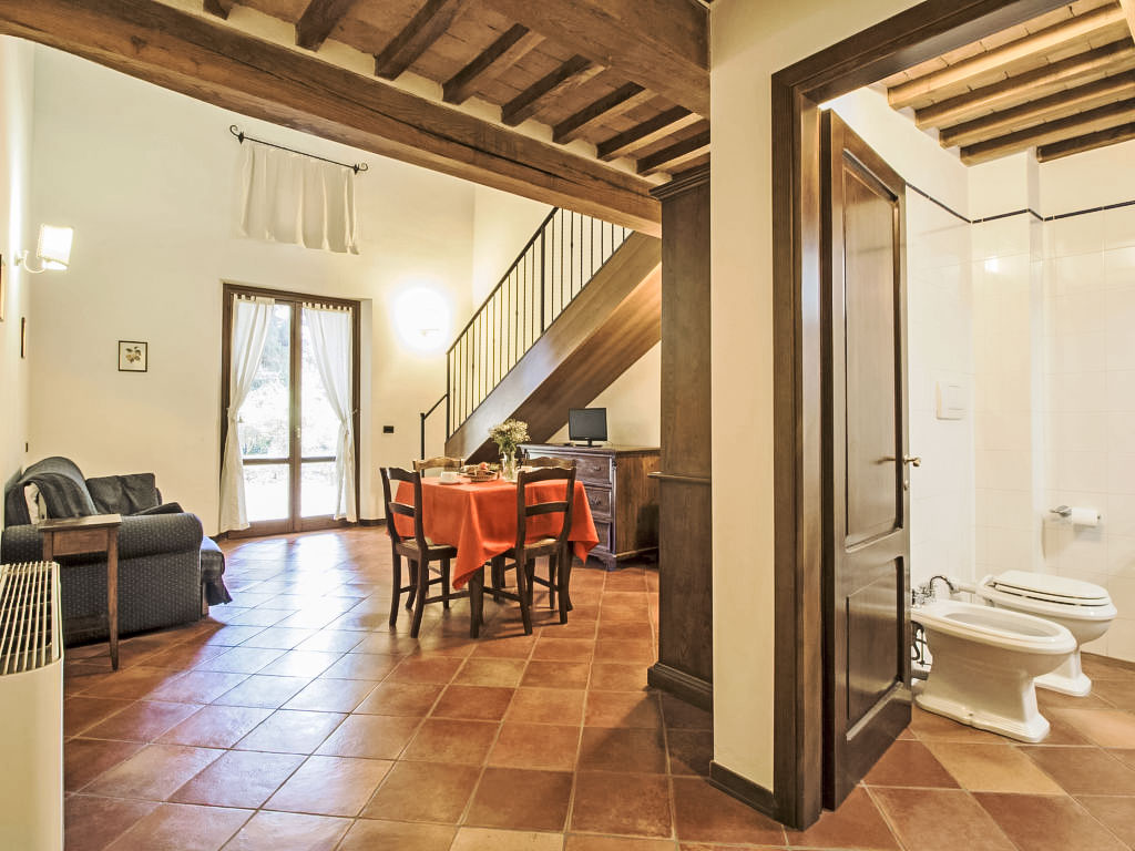 Landsitz "Montecorneo", umgeben von Bäumen. 14 Wohnungen im Ferienhaus. 5 km vom Zentrum von Perugia. Zur Mitbenutzung: Park 500 m2, Schwimmbad nicht einsehbar (15 x 7 m, saisonale Verfügbarkeit: 15.Mai.-30.Sep.). Aussendusche, Kinderspielplatz. Im Hause: Empfang, Frühstücksraum, Wireless LAN, Sauna, Fitnessraum, Tischtennis, Tischfussball, Waschmaschine (zur Mitbenutzung, extra), Heizung nur verfügbar von 15.10. bis 15.04. (extra). Parkplatz auf dem Grundstück. Lebensmittelgeschäft 1 km, Supermarkt 2 km, Restaurant 200 m, Bahnstation "Perugia Ponte San Giovanni" 3 km. Tennis 3 km, Reitstall 5 km. Nahe gelegene Sehenswürdigkeiten: Assisi 20 km, San Feliciano 30 km, Panicale 35 km, Todi 35 km, Città Della Pieve 42 km, Cortona 53 km. Bekannte Seen in der Umgebung sind gut erreichbar: Trasimeno 30 km.
