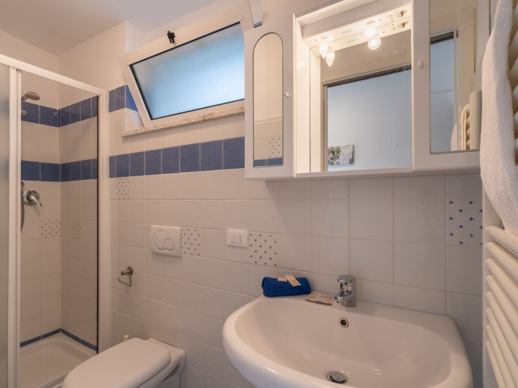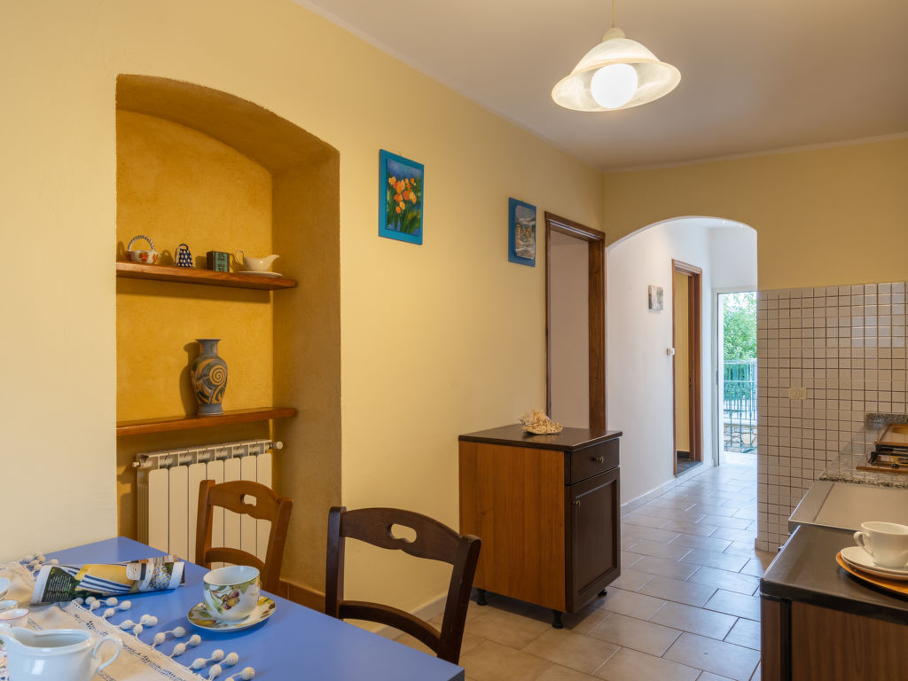3-Zimmer-Wohnung 'Rosa', Erdgeschoss (Hanglage), ca. 50 m². Kleine Küche (4 Flammen, Geschirrspüler, Kühlschrank, Kaffeemaschine, Wasserkocher, Toaster) mit Essplatz und Terrassenausgang. Doppelzimmer (Bett 1,60 m breit) mit Terrassenausgang. Schlafzimmer mit Etagenbett (0,80 m breit). Dusche/WC. Im Eingangsbereich der Wohnung runde, zur Poolseite gelegene Terrasse mit Sonnenschirm und Rundblick über die Berge bis zum Meer. CITR: 008047-AGR-0005