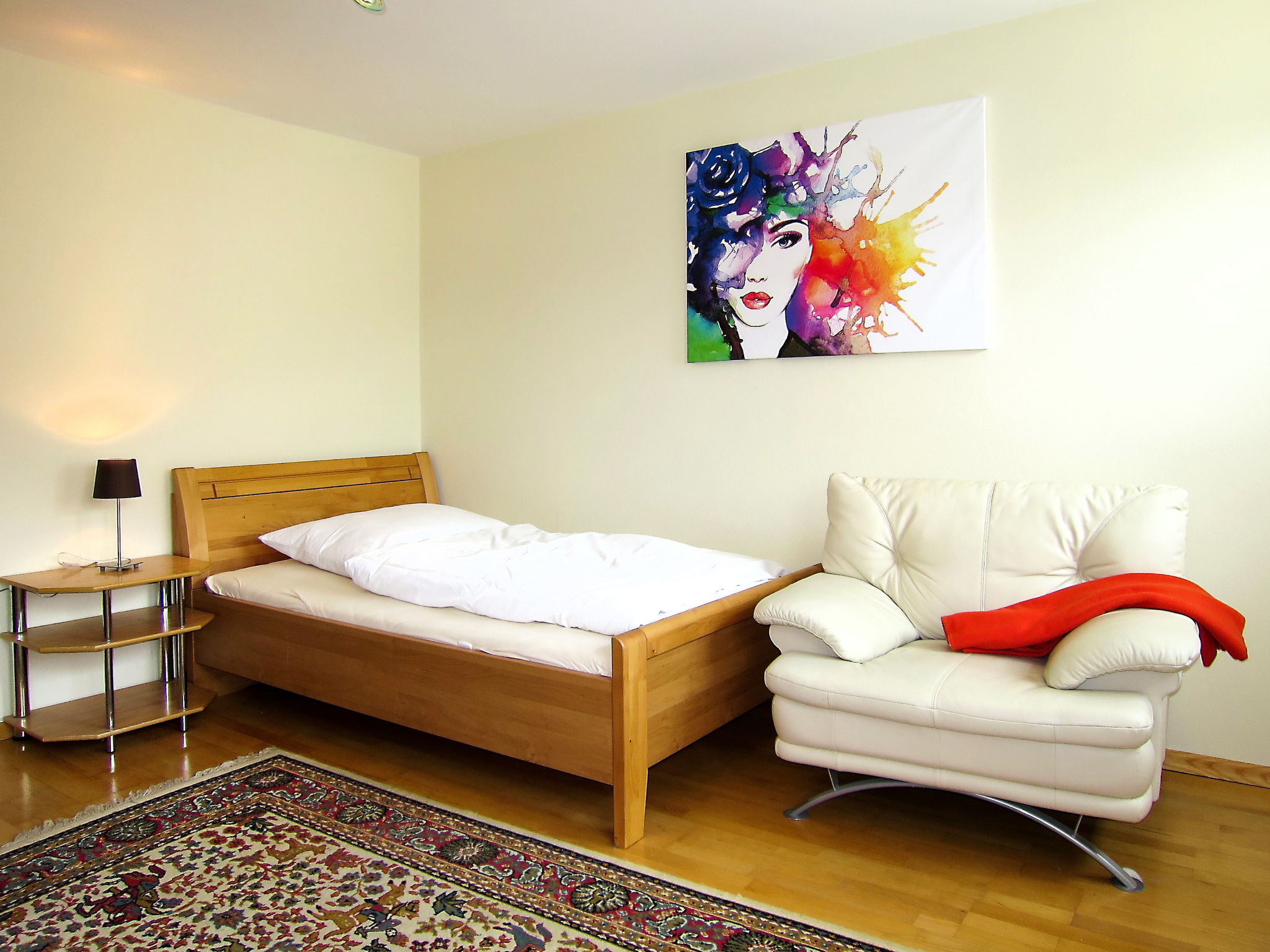 3-Zimmer-Wohnung, 2. Etage, ca. 92 m². Wohnraum (leichte Dachschräge) mit Sitzgruppe. Küche (4 Ceranfelder, Backofen, Geschirrspüler, Kühlschrank, Kaffeemaschine, Wasserkocher, leichte Dachschräge) mit Essplatz (Eckbank). Doppelzimmer. Zweibettzimmer (eines der Betten 1,20 m breit) mit Sessel. Bad/Dusche. Sep.WC. Bei Belegung mit weniger Personen als der maximalen Personenzahl stehen nicht alle Wohneinheiten zur Verfügung.