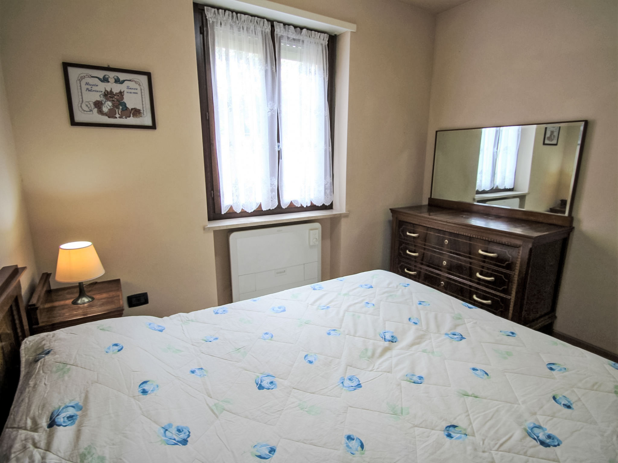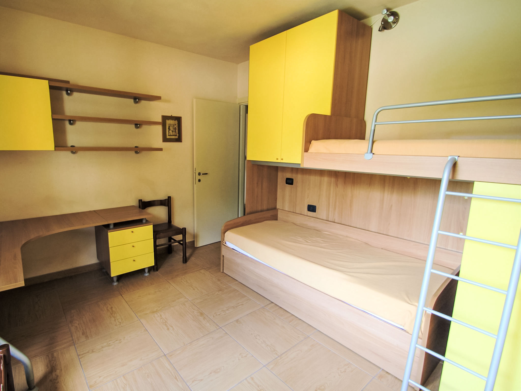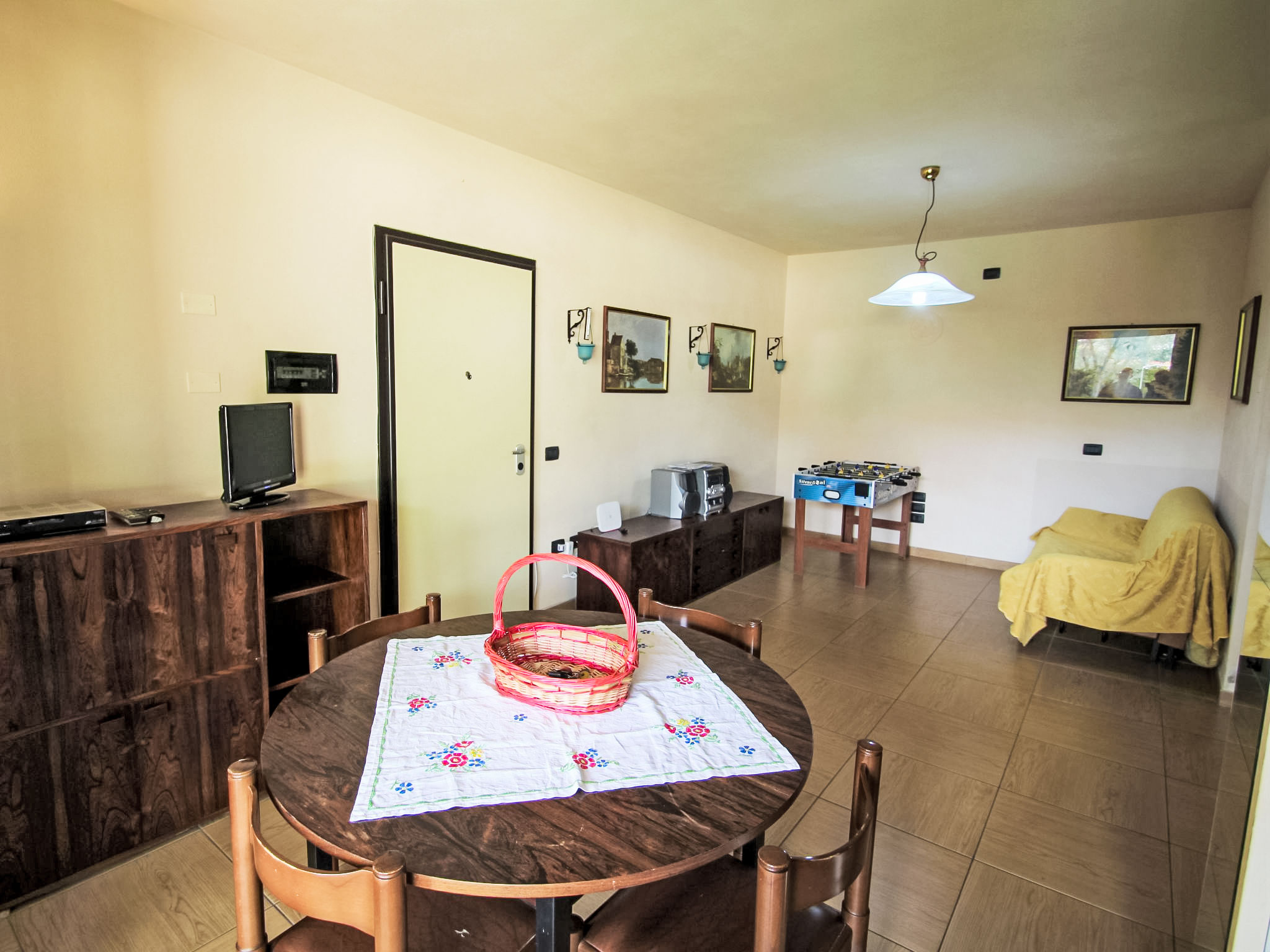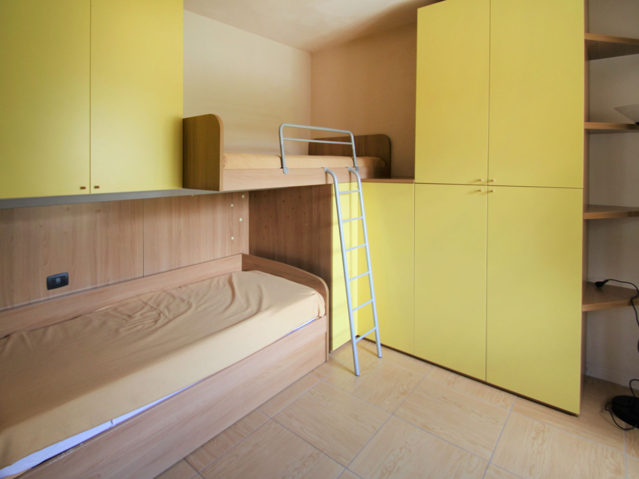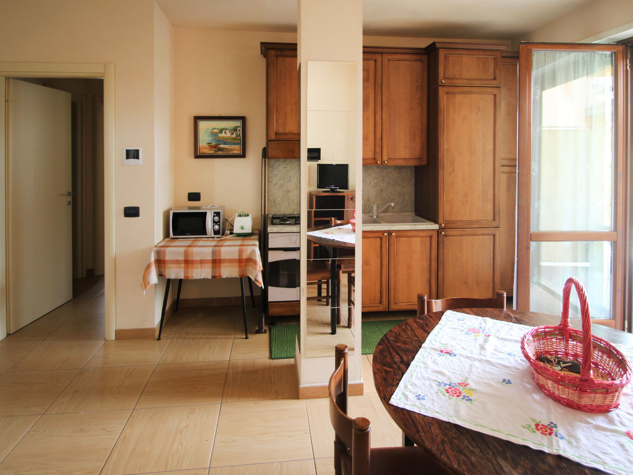 3-Zimmer-Wohnung 60 m2, im Erdgeschoss. Zweckmässig eingerichtet: grosses Wohn-/Esszimmer mit 1 Diwanbett (140 cm), Sat-TV. Ausgang zum Gartensitzplatz. 1 Doppelzimmer. 1 Zimmer mit 1 x 2 Etagenbetten. Kochnische (4 Kochplatten, Backofen, Mikrowelle, Tiefkühler, elektrische Kaffeemaschine). Dusche/Bidet/WC. G-Heizung, Klimaanlage. Heizung nur verfügbar von 01.10. bis 30.04. Gartensitzplatz 15 m2, überdacht. Terrassenmöbel. Sicht auf das Schwimmbad. Zur Verfügung: Waschmaschine, Babybett bis 3 Jahre. Internet (Wireless LAN, gratis). Garage, Höhe 200 cm. CIR: 017187-CNI-00139