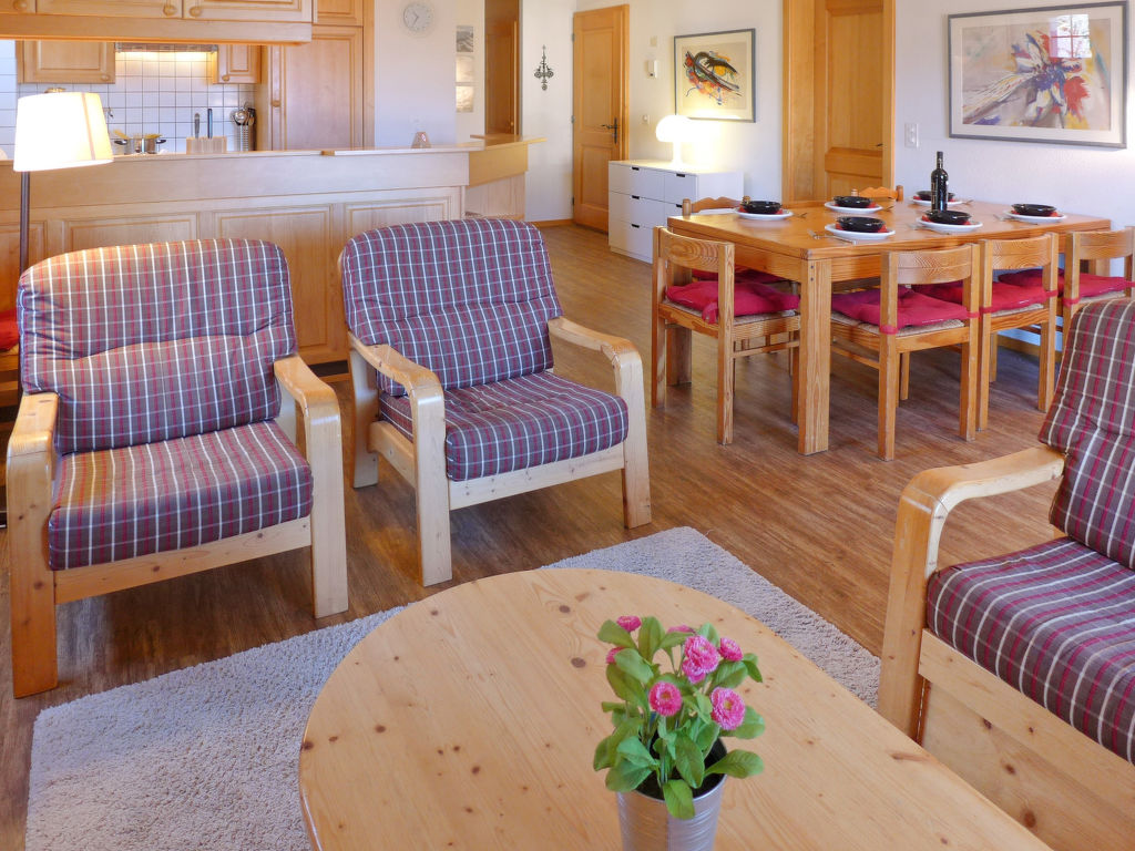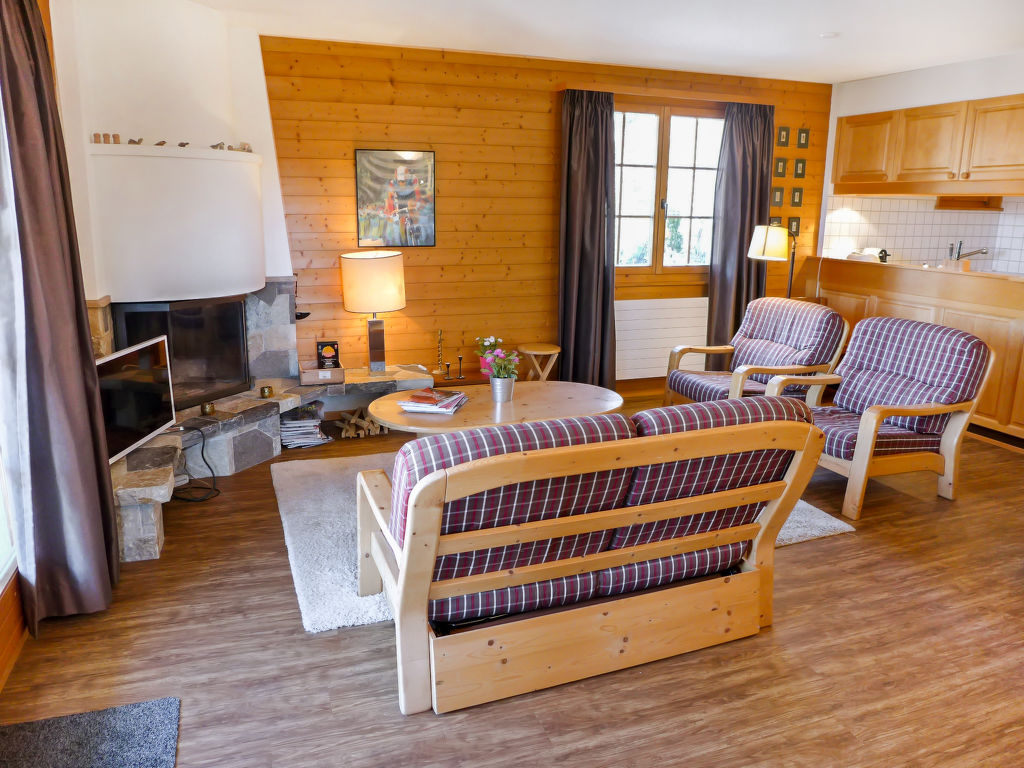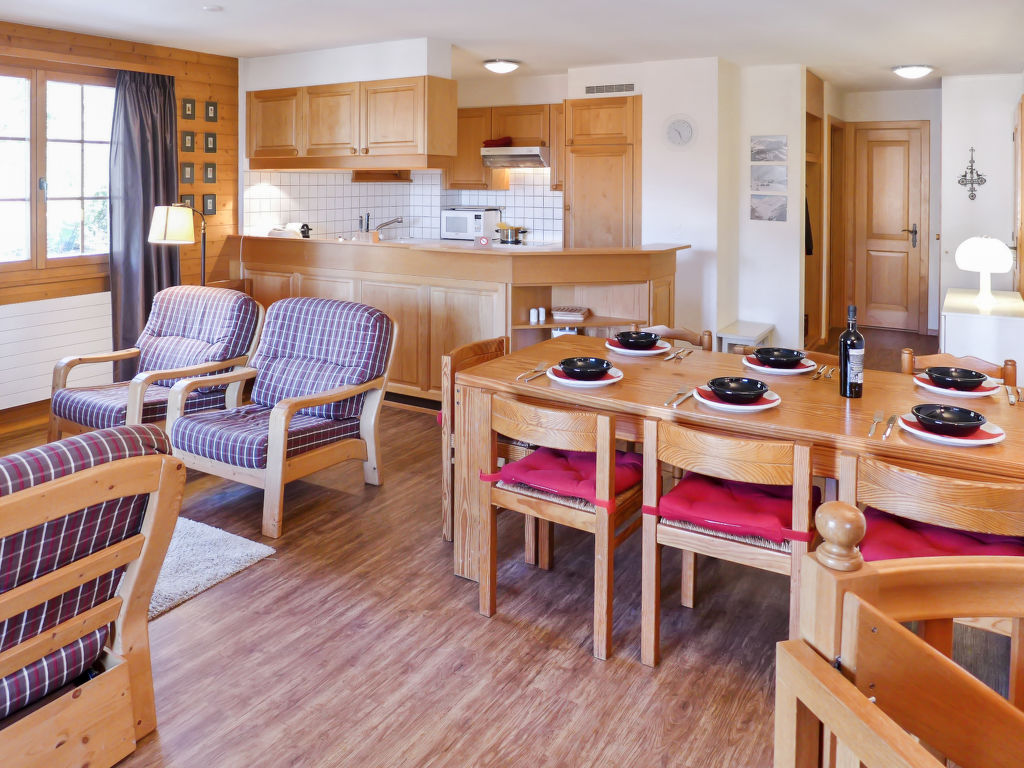 "Le Miclivier B1", 5-Zimmer-Maisonette-Wohnung 120 m2, im Erdgeschoss. Hell, zweckmässig und komfortabel eingerichtet: Wohn-/Esszimmer 58 m2 mit offenem Kamin, Esstisch und TV. Ausgang zum Garten. 1 Zimmer mit 2 Betten (90 cm), Bad/WC. Ausgang zum Garten, Richtung Süden. 1 Zimmer mit 2 Betten (90 cm, Länge 200 cm). Offene Küche (Backofen, Geschirrspüler, 4 Glaskeramikherd Platten, Mikrowelle, Tiefkühler, elektrische Kaffeemaschine, Kapseln für die Kaffeemaschine (Nespresso) extra, Fondue Set (Käse)). Dusche/WC. Unteres Geschoss: (Wendeltreppe) 1 kleines Zimmer, ohne Schrank mit 2 Betten (90 cm, Länge 190 cm). 1 kleines Zimmer, ohne Schrank mit 2 Betten (90 cm). Grosse Terrasse 36 m2, Garten. Terrassenmöbel, Gartengrill. Schöne Panoramasicht auf die Berge. Zur Verfügung: Internet (Wireless LAN, gratis). Garage Nr. B1. Bitte beachten: Nichtraucher-Unterkunft.