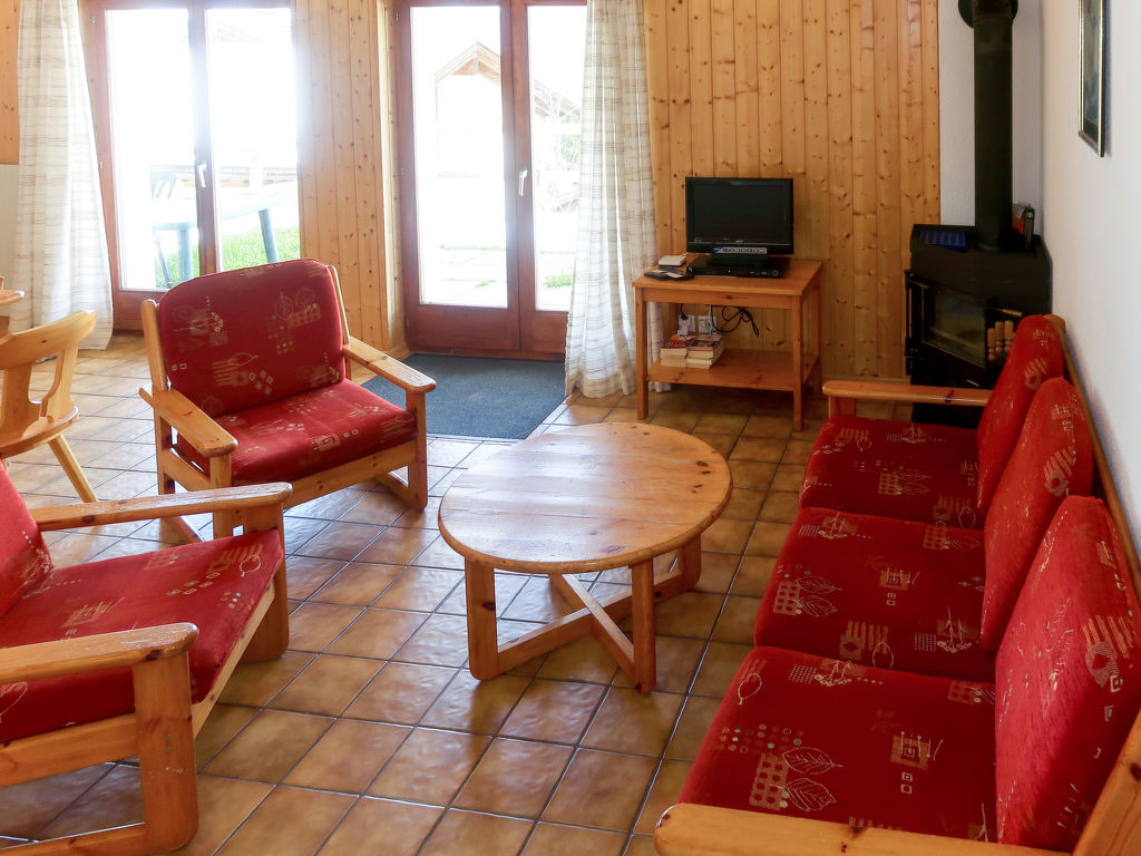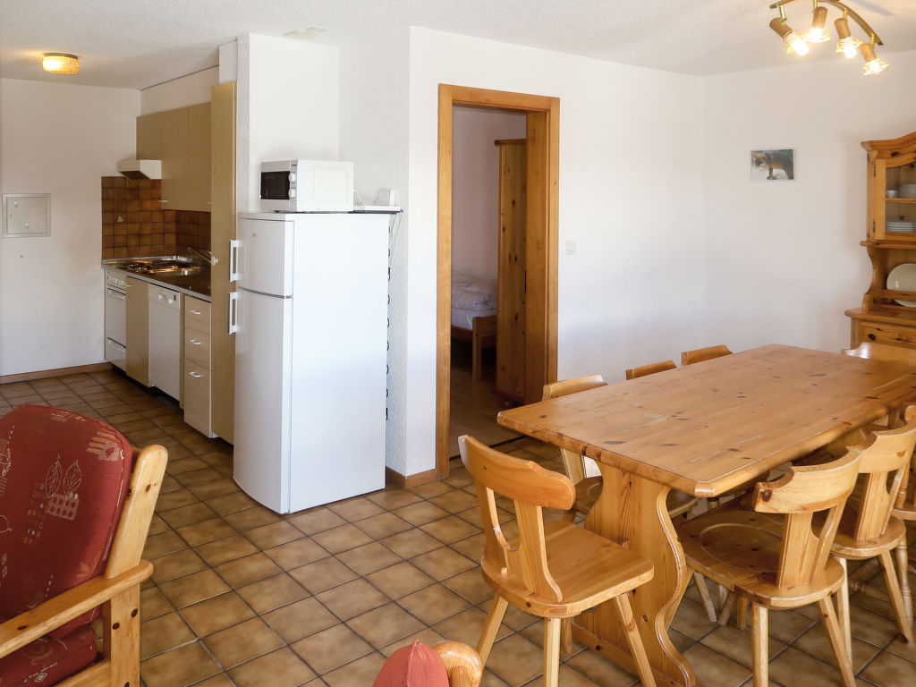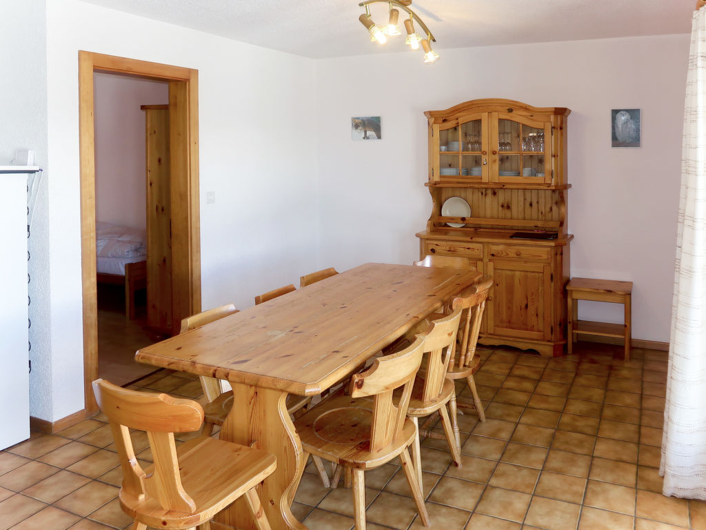 "Basilic", 5-Zimmer-Reihenhaus 100 m2 auf 2 Stockwerken. Zweckmässig und komfortabel eingerichtet: Wohn-/Esszimmer mit Schwedenofen, Sat-TV, Internationale TV-Sender und DVD. Ausgang zur Terrasse. 1 kleines Zimmer mit 2 Betten. Offene Küche (4 Kochplatten, Backofen, Geschirrspüler, Mikrowelle, elektrische Kaffeemaschine, Fondue Set (Käse)). Dusche/WC. Ölheizung. Obergeschoss: 1 Zimmer mit 2 Betten. Ausgang zum Balkon. 1 Zimmer mit 2 Betten. 1 Zimmer mit 1 x 2 Etagenbetten. Bad/WC. Ölheizung. Balkon, Terrasse. Terrassenmöbel. Panoramasicht. Zur Verfügung: Internet (Wireless LAN). Bitte beachten: Nichtraucher-Unterkunft. ein Schlitten wird für das Gespäck zur Verfügung gestellt.