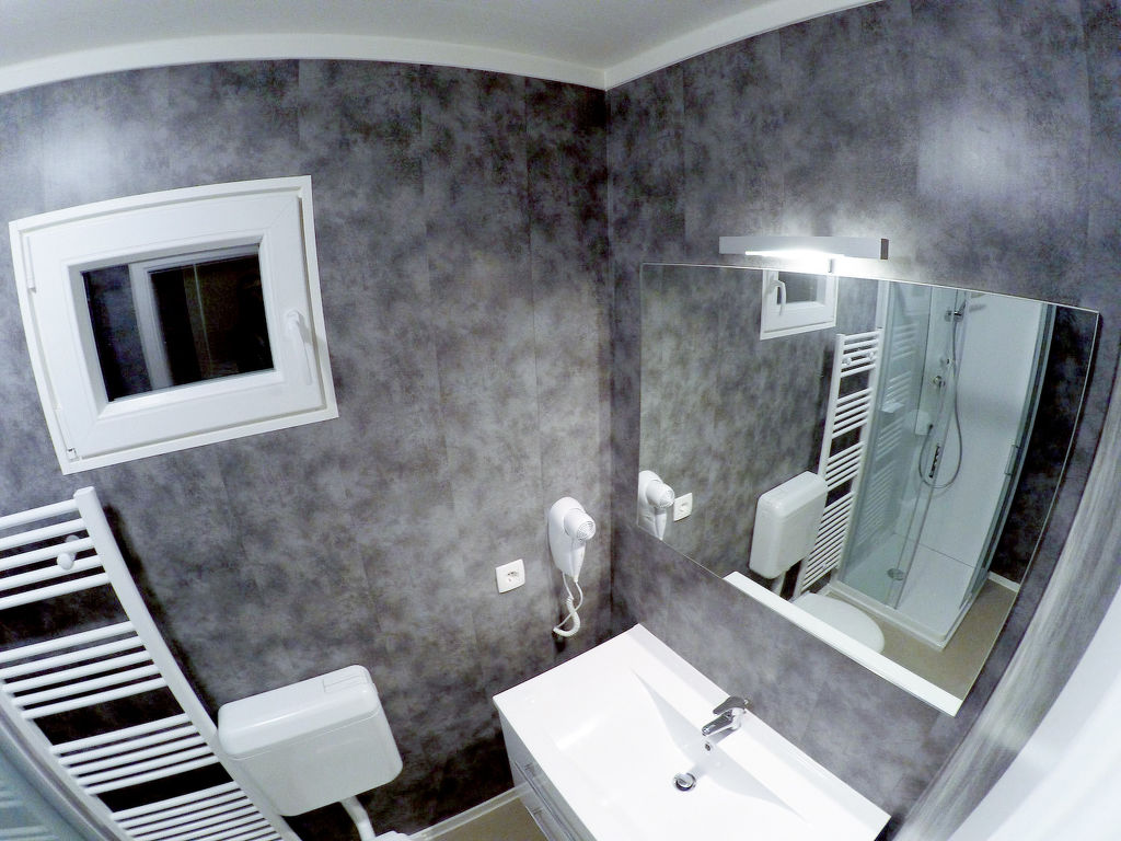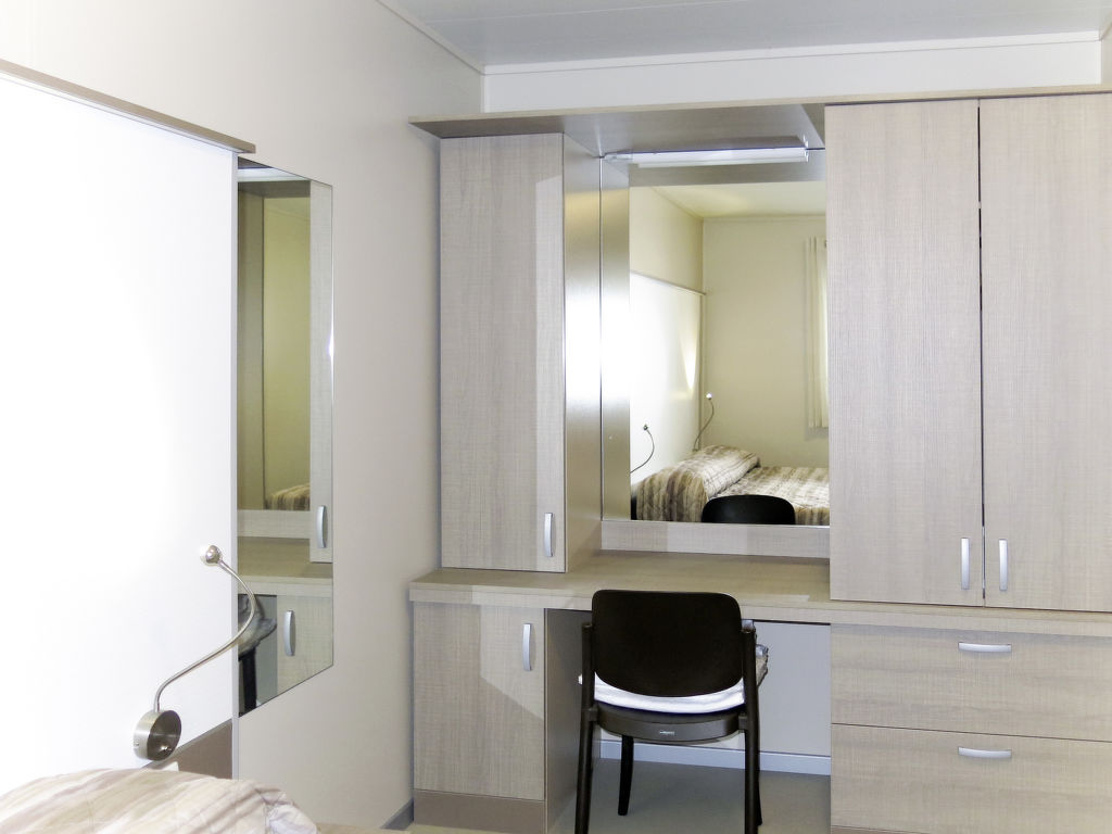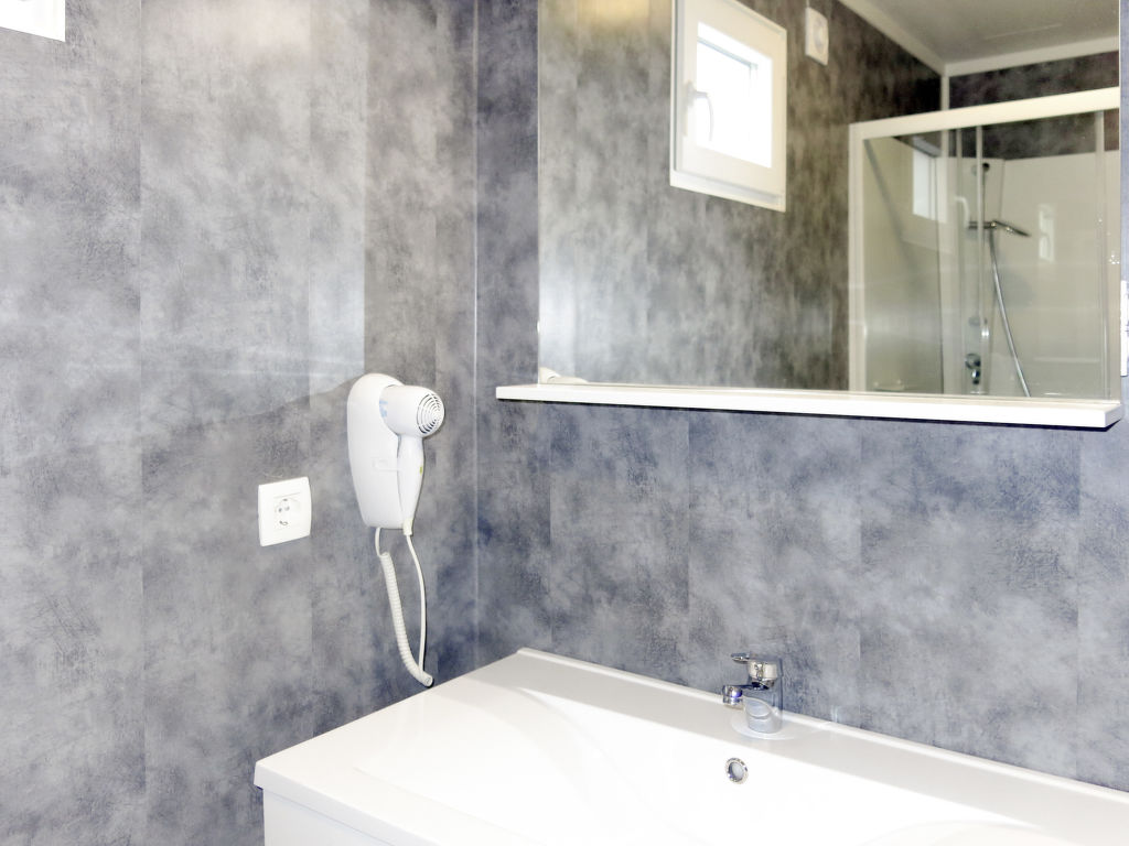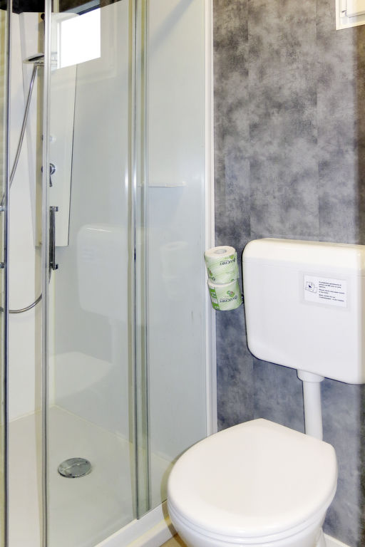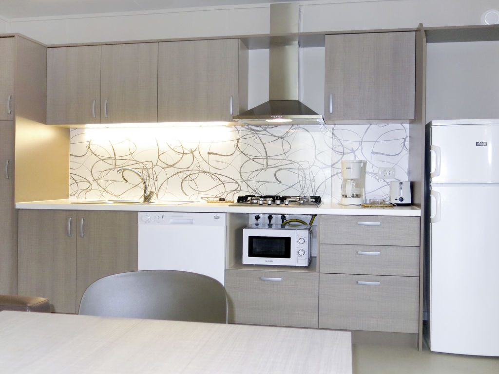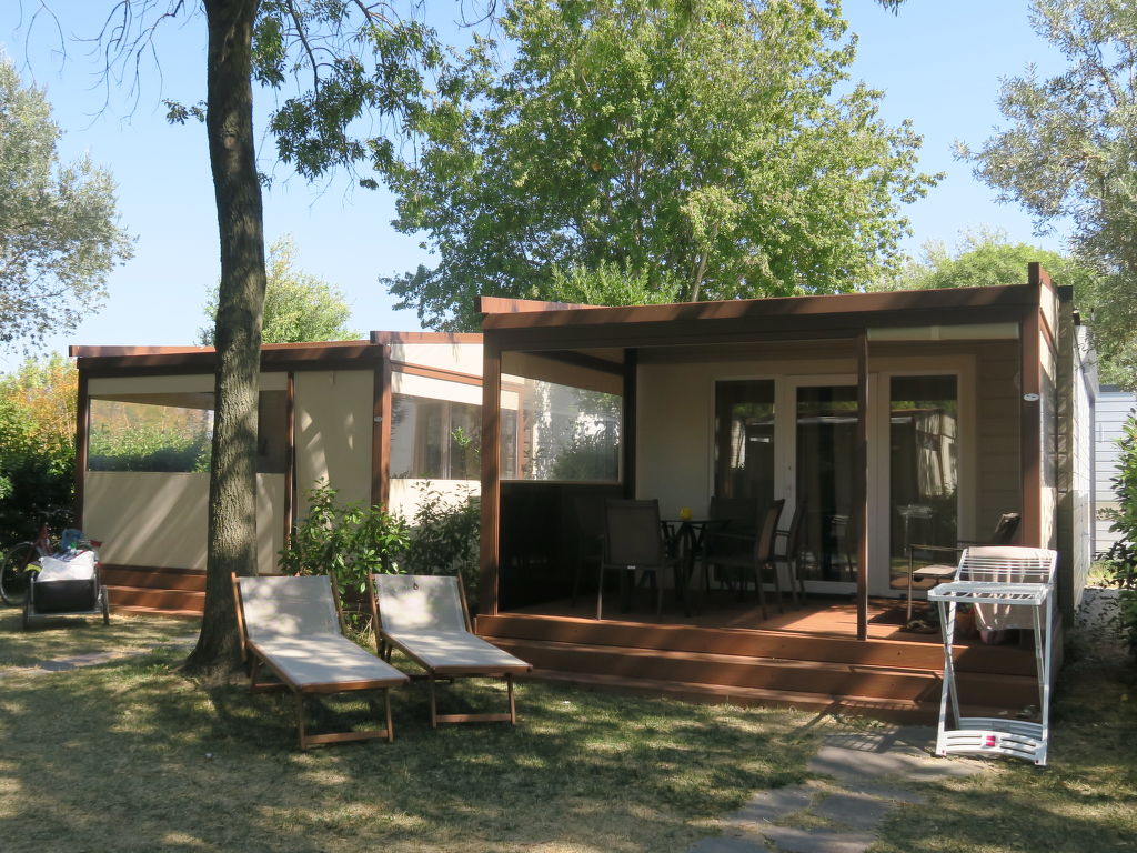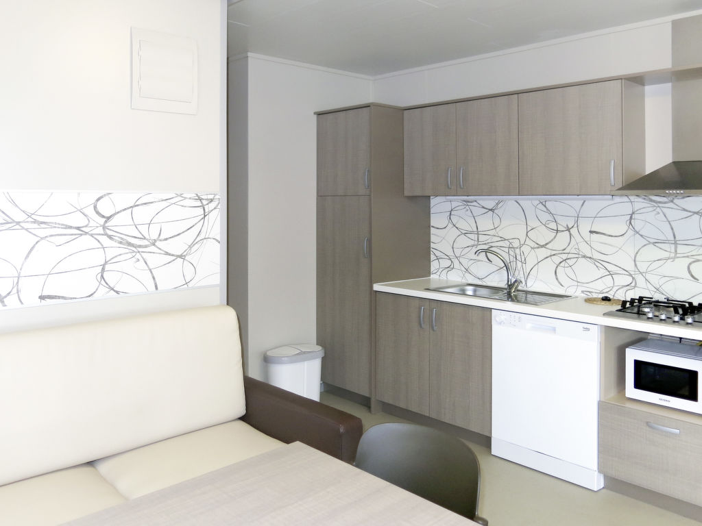 3-Zimmer-Mobilhome, ca. 40 m², zzgl. ca. 12 m² komplett verschließbare, überdachte Terrasse. Über 3 Stufen in Wohnraum mit Sitzcouch, Essplatz, Küchenzeile (4 Flammen, Mikrowelle, Geschirrspüler, Kühl-/Gefrierkombination, Toaster, Kaffeemaschine). Doppelzimmer. Schlafzimmer mit 2 Einzelbetten und zusätzlichem obenliegendem Bett. Dusche/WC. Strandentfernung ca. 100-300 m.
