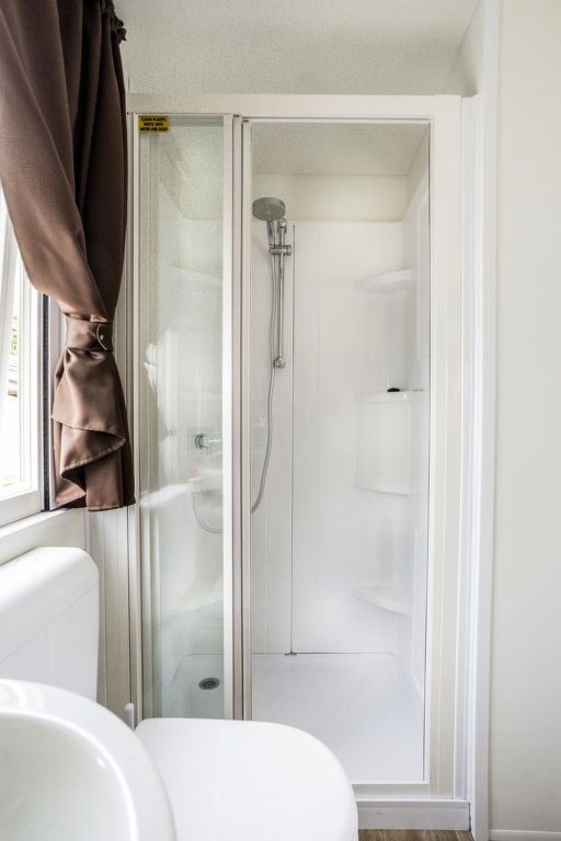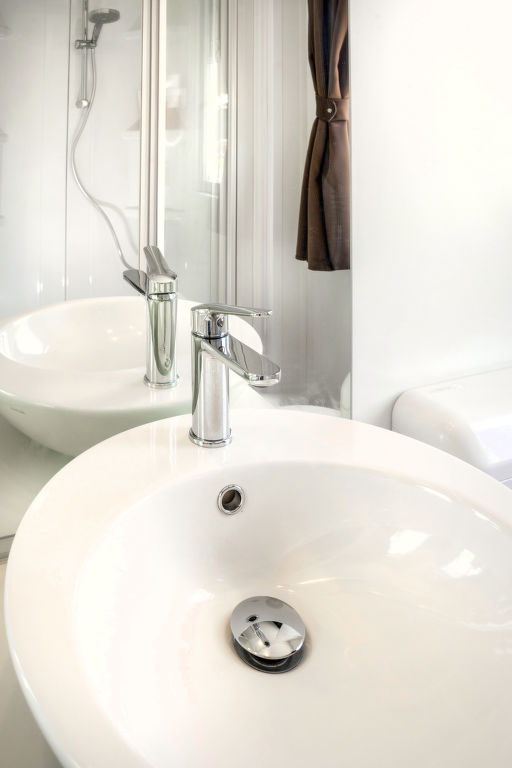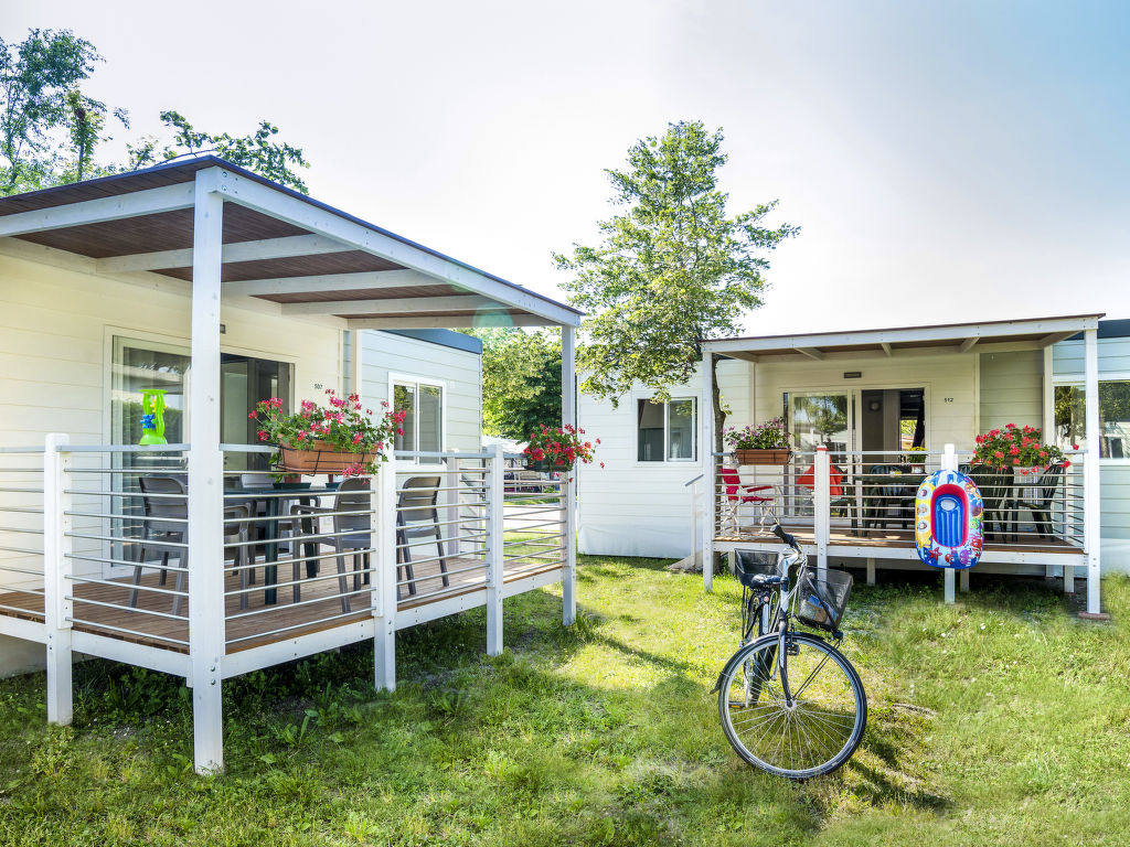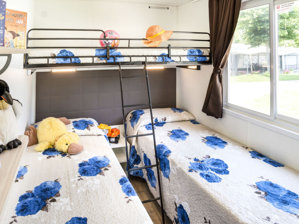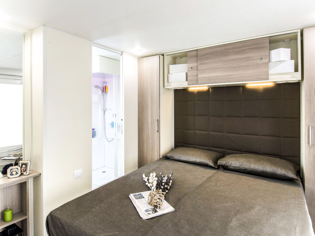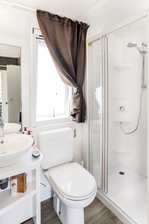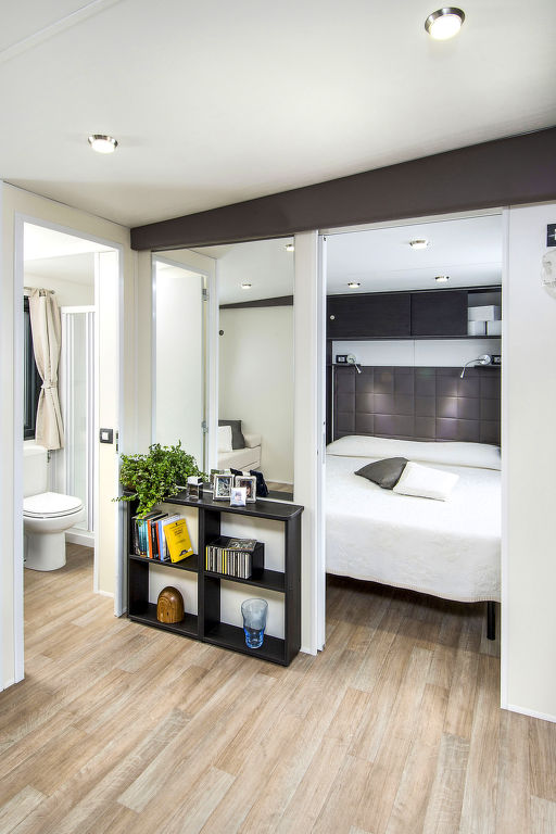 3-Zimmer-Mobilhome, ca. 34 m². Über 5 Stufen und Terrasse Zugang zu: Wohnraum mit Sitzcouch, Essplatz, Küchenzeile (4 Flammen, Mikrowelle, Kühl-/Gefrierkombination, Kaffeemaschine). Schlafzimmer mit franz. Bett (1,60 m breit), Dusche/WC. Schlafzimmer mit 2 Einzelbetten und zusätzlich obenliegendem Bett (Bettenbreite jeweils 70 cm). Dusche/WC.Maximale Belegung: 4 Erwachsene und 1 Kind bis 10 Jahre.
