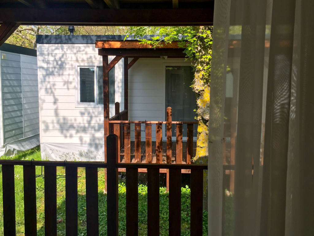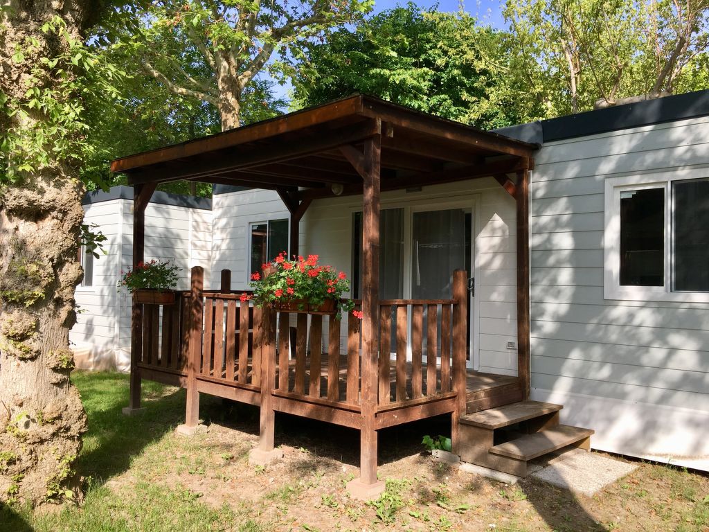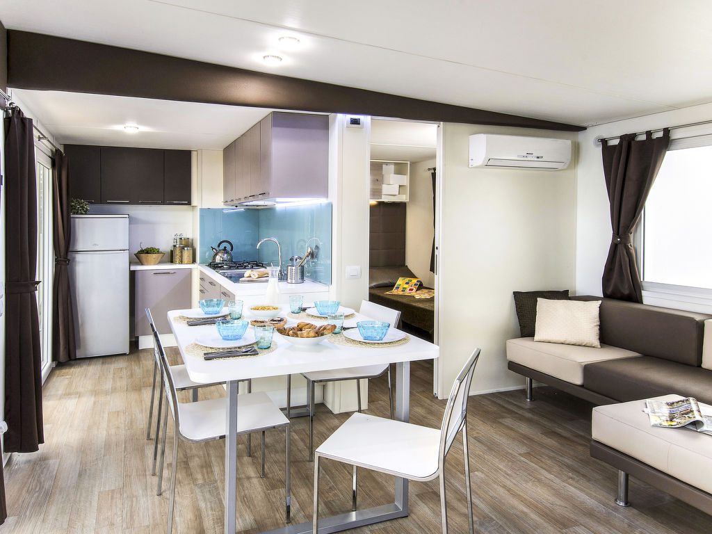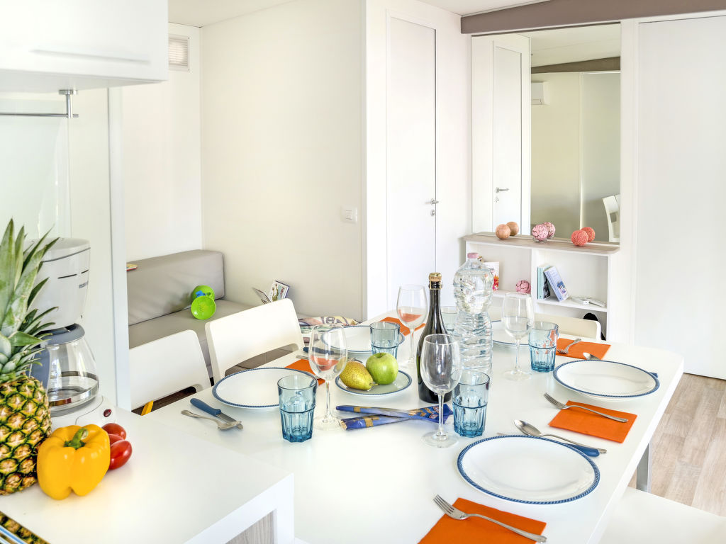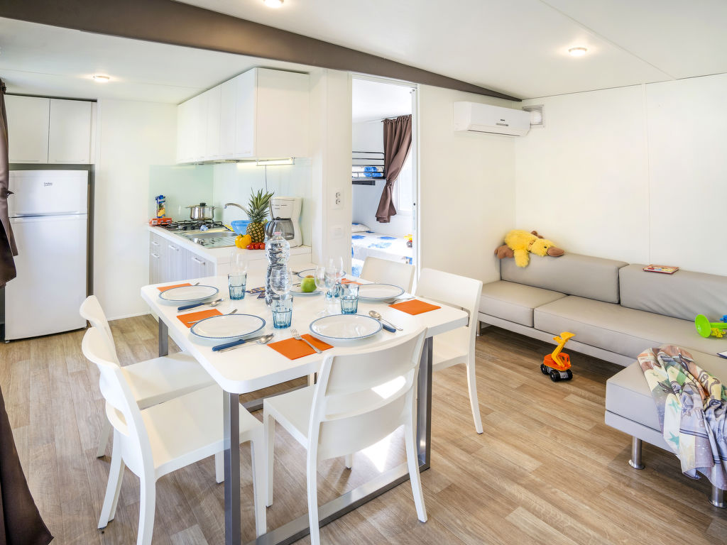 3-Zimmer-Mobilhome, ca. 34 m². Über 5 Stufen und Terrasse Zugang zu: Wohnraum mit Sitzcouch, Essplatz, Küchenzeile (4 Flammen, Mikrowelle, Kühl-/Gefrierkombination, Kaffeemaschine). Schlafzimmer mit franz. Bett (1,60 m breit), Dusche/WC. Schlafzimmer mit 2 Einzelbetten und zusätzlich obenliegendem Bett (Bettenbreite jeweils 70 cm). Dusche/WC.Maximale Belegung: 4 Erwachsene und 1 Kind bis 10 Jahre.