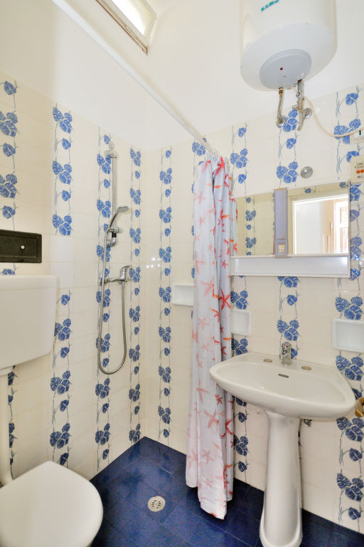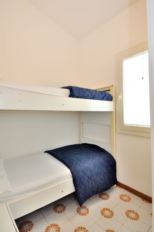 3-Zimmer-Reihenhaus, ca. 28 m². Küche (3 Flammen, Kühlschrank, Kaffeemaschine) mit Essplatz. Zweibettzimmer. Schlafzimmer mit Etagenbett. Einfache Dusche/WC.