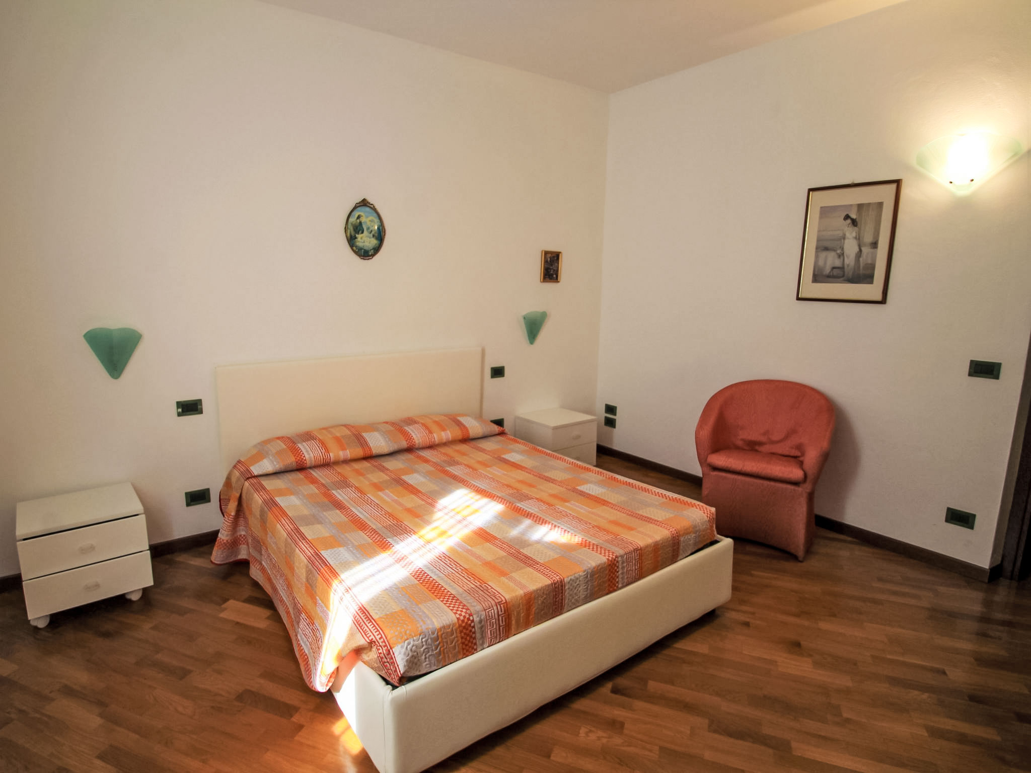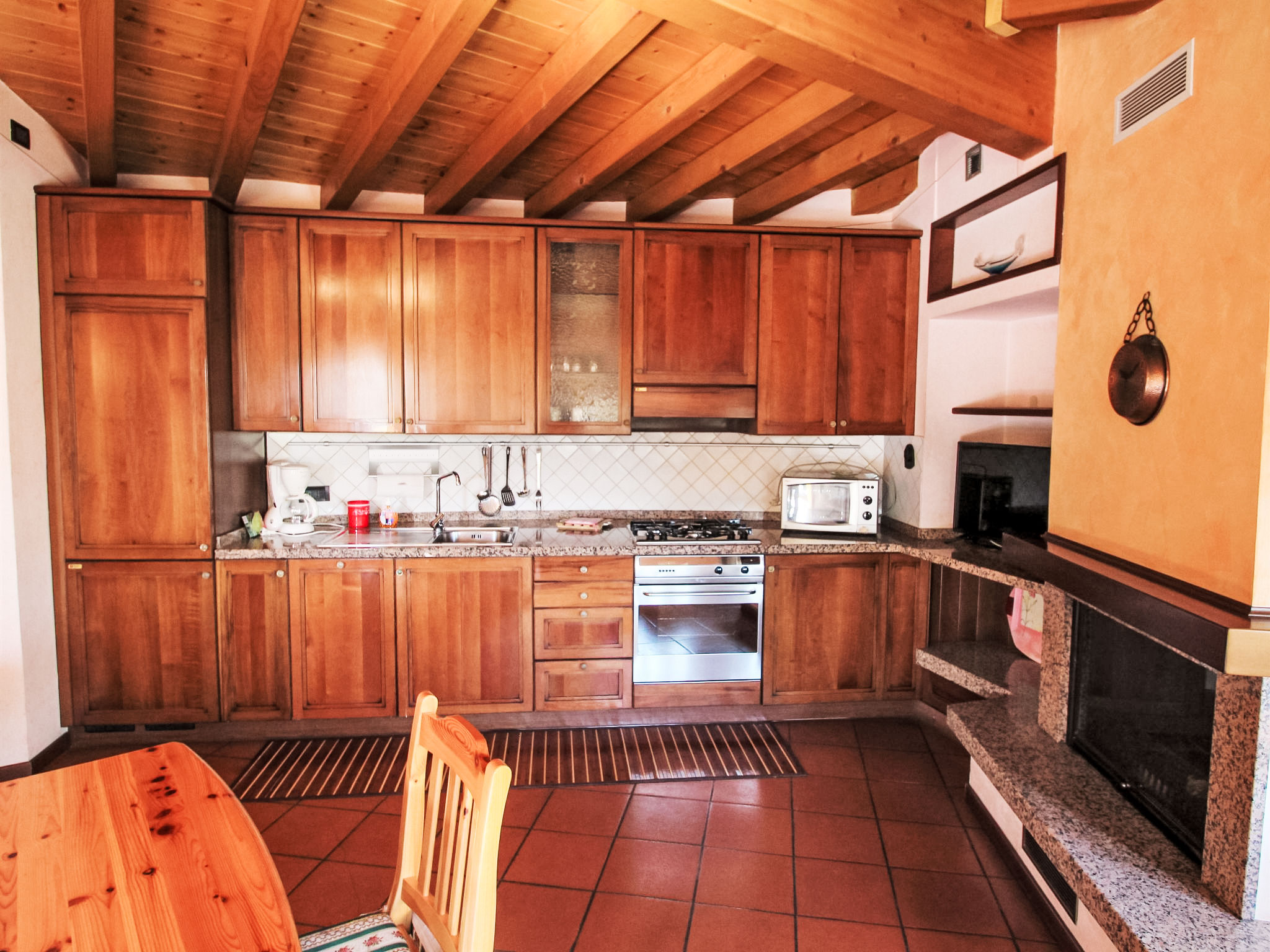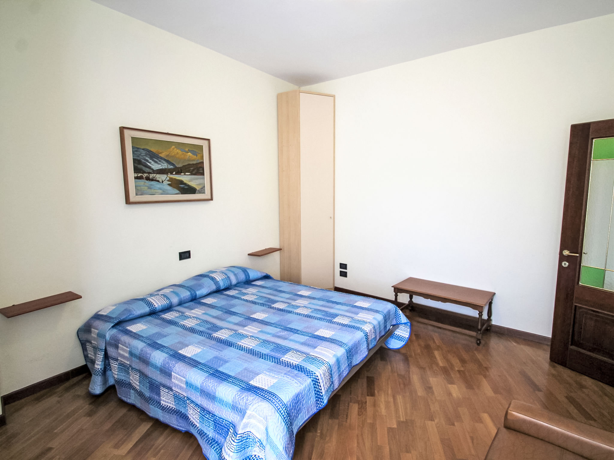 4-Zimmer-Wohnung 100 m2, im erhöhten Erdgeschoss. Zweckmässig eingerichtet: grosses Wohn-/Esszimmer mit offenem Kamin und TV. Ausgang zur Terrasse. 2 Doppelzimmer. 1 Zimmer mit 1 Bett. Kochnische (4 Kochplatten, Geschirrspüler, Mikrowelle, Tiefkühler, elektrische Kaffeemaschine). Dusche/Bidet/WC, sep. WC. Ölheizung (extra). Heizung nur verfügbar von 15.10. bis 15.04. Terrasse 30 m2. Terrassenmöbel. Zur Verfügung: Waschmaschine. CIR: 017076-CNI-00081