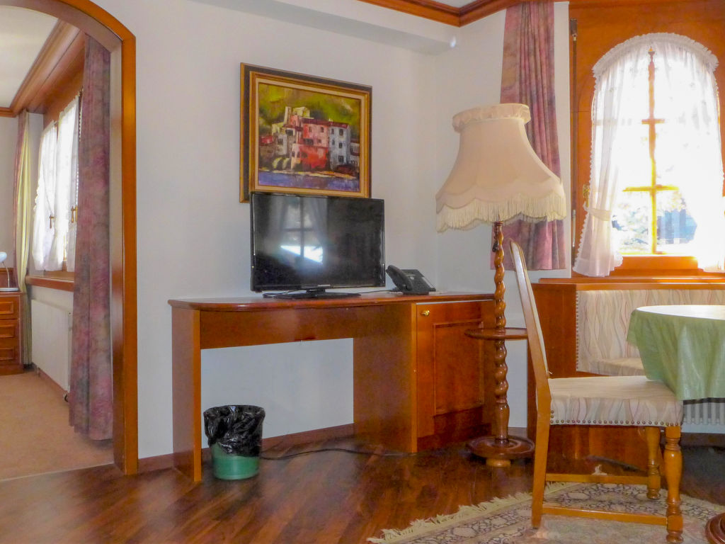 2-Zimmer-Wohnung 32 m2, unteres Geschoss, Südwestlage. Einfach und rustikal eingerichtet: Wohn-/Schlafzimmer mit 2 Wandschrankbetten (80 cm, Länge 190 cm), TV. 1 Zimmer mit 1 Doppelbett (1 x 160 cm, Länge 200 cm). Küche (Backofen, 4 Glaskeramikherd Platten, Toaster, Wasserkocher, Tiefkühler, elektrische Kaffeemaschine, Fondue Set (Käse)). Dusche/WC. Sicht auf das Matterhorn. Zur Verfügung: Haartrockner. Internet (Wireless LAN, gratis). Bitte beachten: Nichtraucher-Unterkunft.