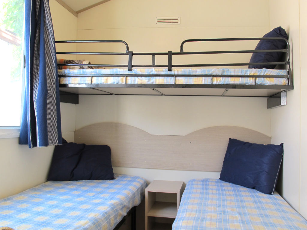 "Happy Standard", 3-Zimmer-Mobilheim 25 m2. Objekt geeignet für 5 Erwachsene + 1 Kind. Zweckmässig eingerichtet: Wohn-/Schlafzimmer mit 1 Diwanbett, Esstisch, E-Heizung und Klimaanlage. 1 Zimmer mit 1 franz. Bett (140 cm). 1 Zimmer mit 2 Betten (70 cm), 1 x 1 Etagenbetten (Länge 150 cm). Offene Küche (4 Kochplatten). Dusche/WC. Terrasse teilweise überdacht. Terrassenmöbel, Elektrogrill (mobil), Liegestühle (2). Zur Verfügung: Fliegengitter. Bitte beachten: Nichtraucher-Unterkunft.