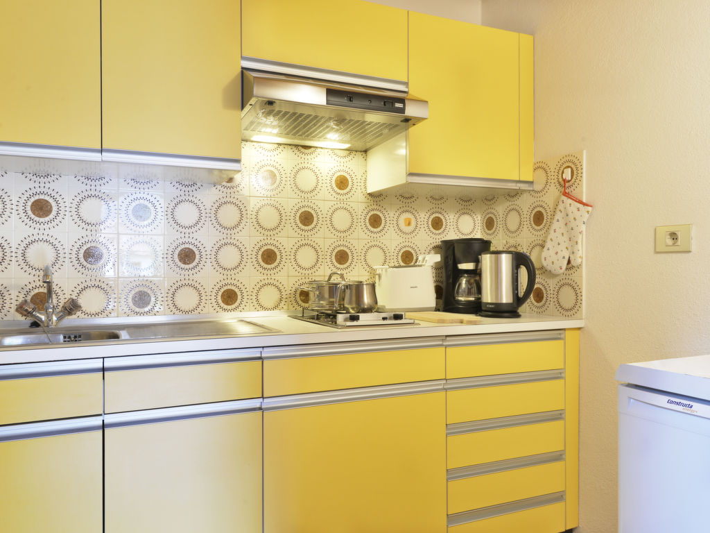 1-Zimmer-Wohnung, 2. Etage (Dachschräge, teils eingeschränkte Stehhöhe), ca. 27 m². Wohn-/Schlafraum mit 2 Einzelbetten (Betten zusammenstellbar), Essplatz (Eckbank) und Balkonausgang. Kleine Küche (2 Flammen, Kühlschrank, Kaffeemaschine, Wasserkocher, Toaster). Dusche/WC.