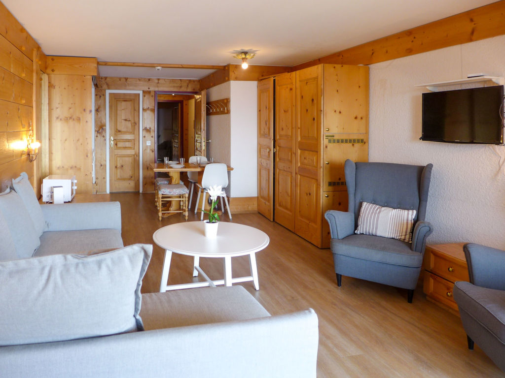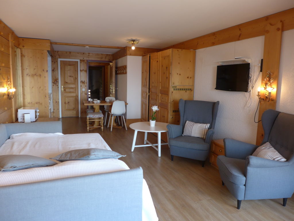 "Le Bristol B42", 2-Zimmer-Wohnung 55 m2 im 4. Stock. Hell, teilweise renoviert im Jahre 2021, komfortabel und schön eingerichtet: grosses Wohn-/Schlafzimmer mit 1 Diwanbett (140 cm, Länge 200 cm), Esstisch, Dusche/WC und TV (Flachbildschirm). Ausgang zum Balkon, Richtung Süden und Richtung Westen. 1 Doppelzimmer mit 2 Betten (90 cm), Bad/WC. Ausgang zum Balkon, Richtung Norden und Richtung Osten. Kochnische (2 Kochplatten, Mikrowelle, elektrische Kaffeemaschine). Parkettböden. 2 kleine Balkone 10 m2. Balkonmöbel. Sehr schöne Panoramasicht auf die Berge und das Tal. Zur Verfügung: Internet (Wireless LAN, gratis). Parkplatz Nr. 14 (überdacht). Bitte beachten: Nichtraucher-Unterkunft. Rauchmelder.