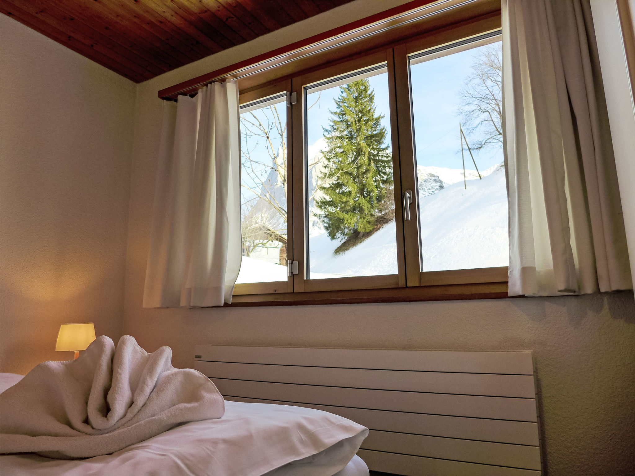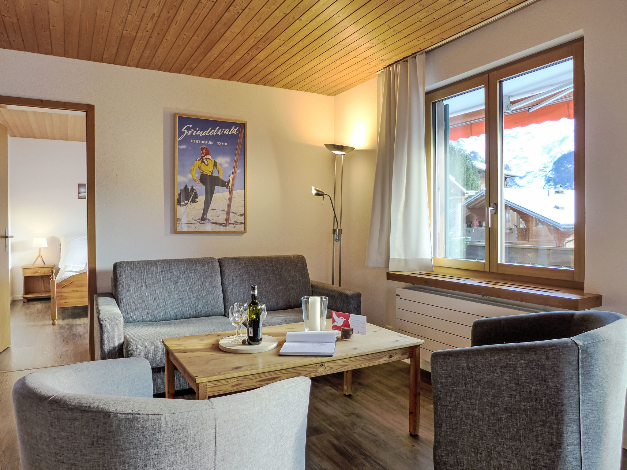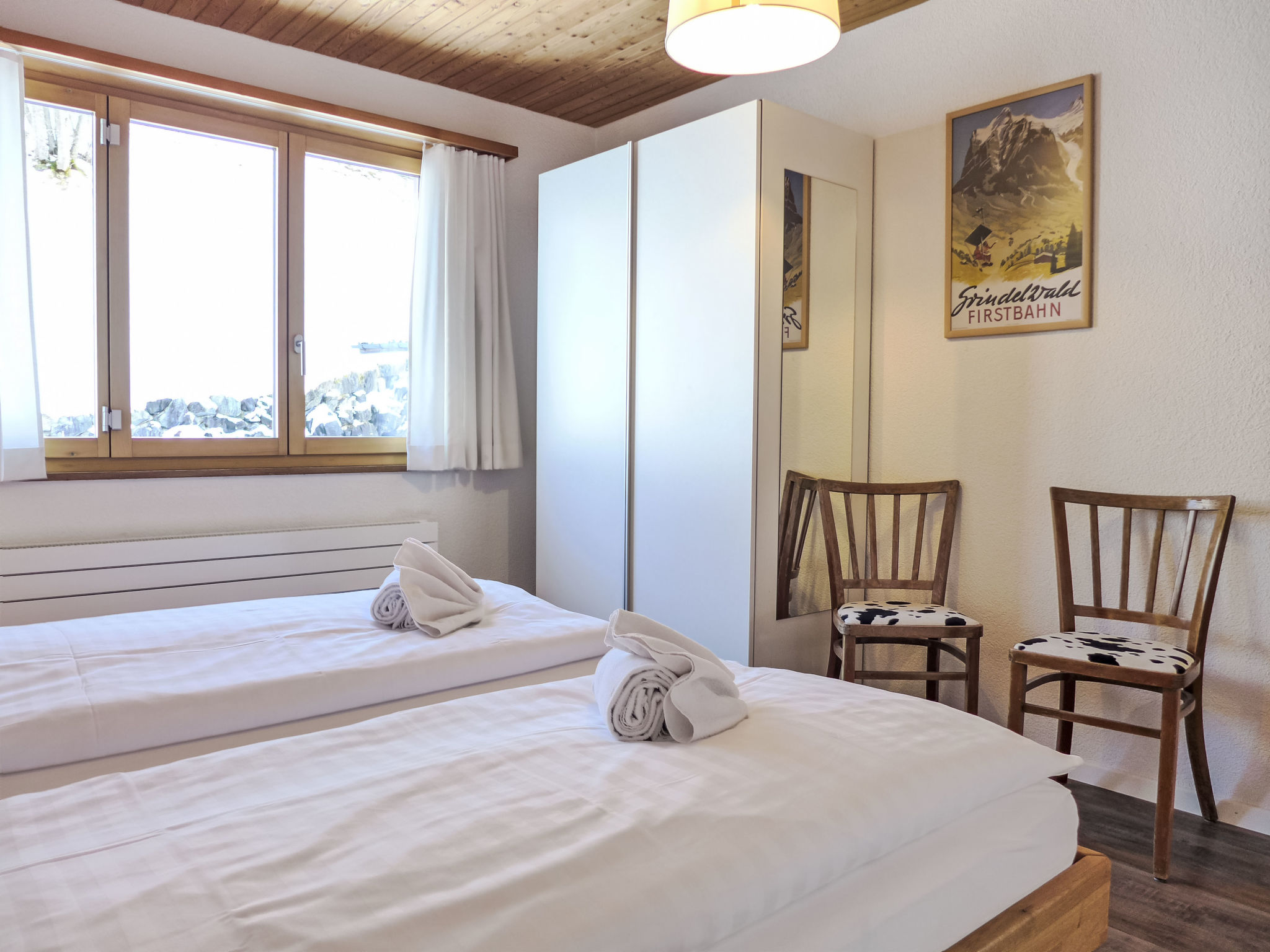 3-Zimmer-Wohnung 80 m2 im 1. Stock, Südlage. Vollständig renoviert im Jahre 2014, gemütlich eingerichtet: Wohn-/Schlafzimmer mit 1 Doppeldiwanbett (160 cm, Länge 200 cm), Esstisch und Kabel-TV (Flachbildschirm), Radio. Ausgang zum Balkon, Richtung Süden. 1 Zimmer mit 1 Doppelbett (2 x 80 cm, Länge 200 cm). Ausgang zum Balkon, Richtung Süden. 1 Zimmer mit 2 Betten (90 cm, Länge 200 cm). Offene Küche (Backofen, Geschirrspüler, 4 Glaskeramikherd Platten, Mikrowelle, elektrische Kaffeemaschine, Racletteofen, Fondue Set (Käse)). Bad/WC. Parkettböden. Balkon 18 m2, Südlage. Balkonmöbel. Herrliche Panoramasicht auf die Berge und Eigernordwand und Fiescherwand. Zur Verfügung: Haartrockner. Internet (Wireless LAN, gratis). Parkplatz, Garage Nr. Bienli in 50 m. Bitte beachten: Nichtraucher-Unterkunft. Feuerlöscher. Bei Belegung mit weniger Personen als der maximalen Personenzahl stehen nicht alle Schlafzimmer zur Verfügung.