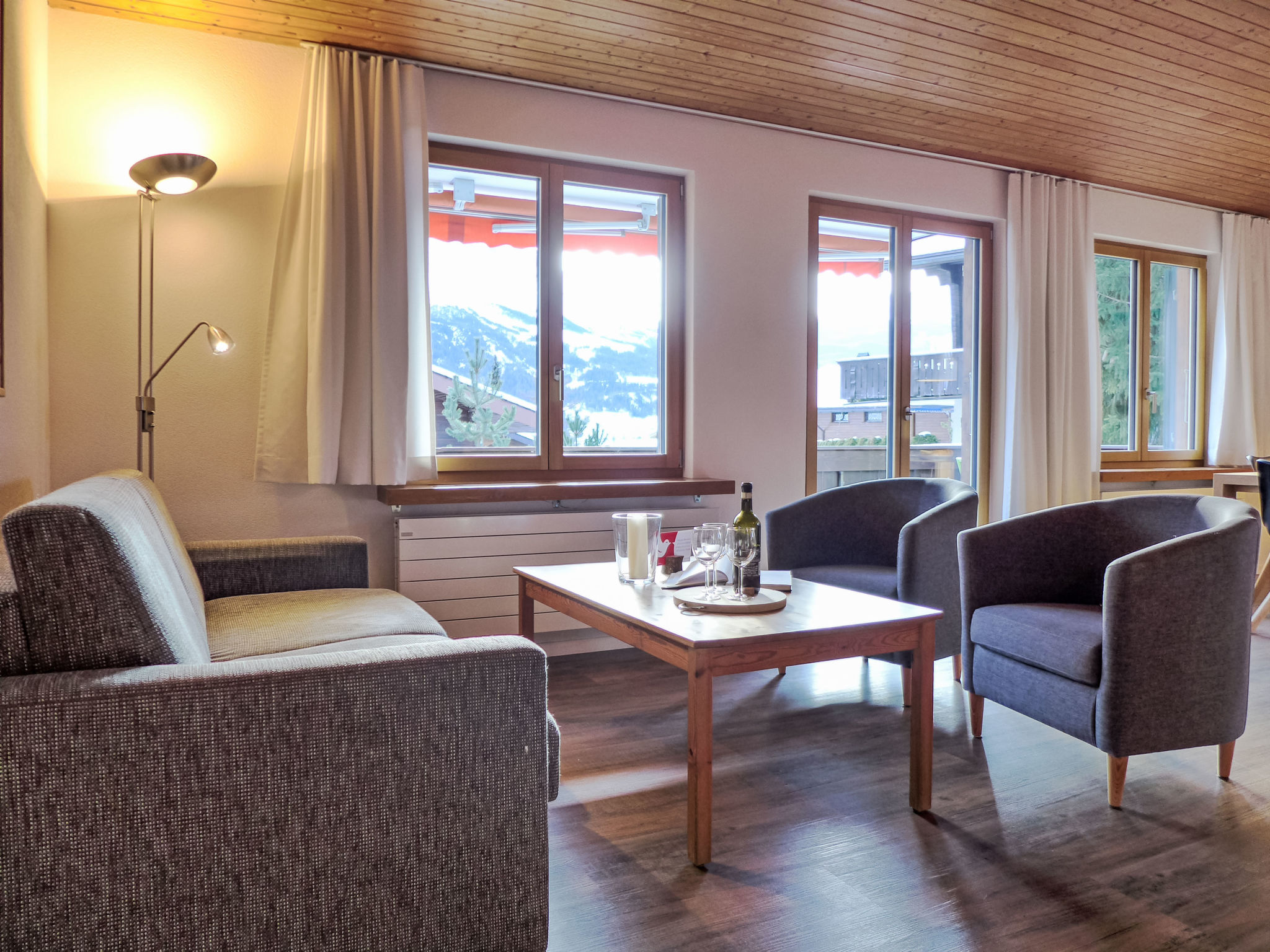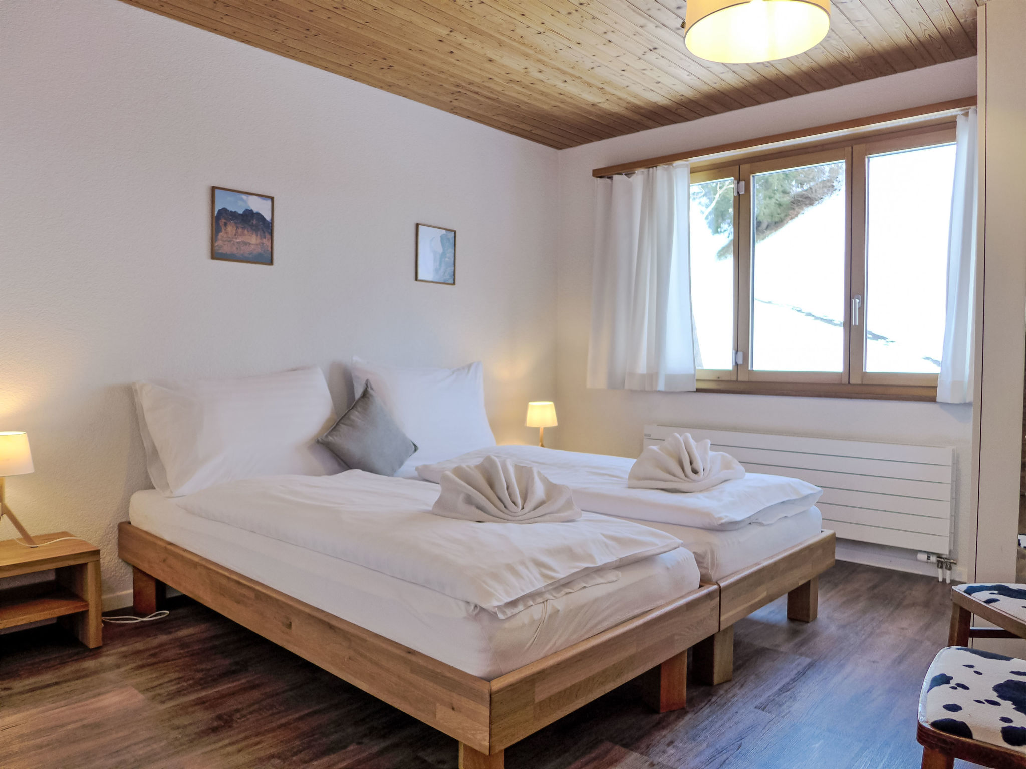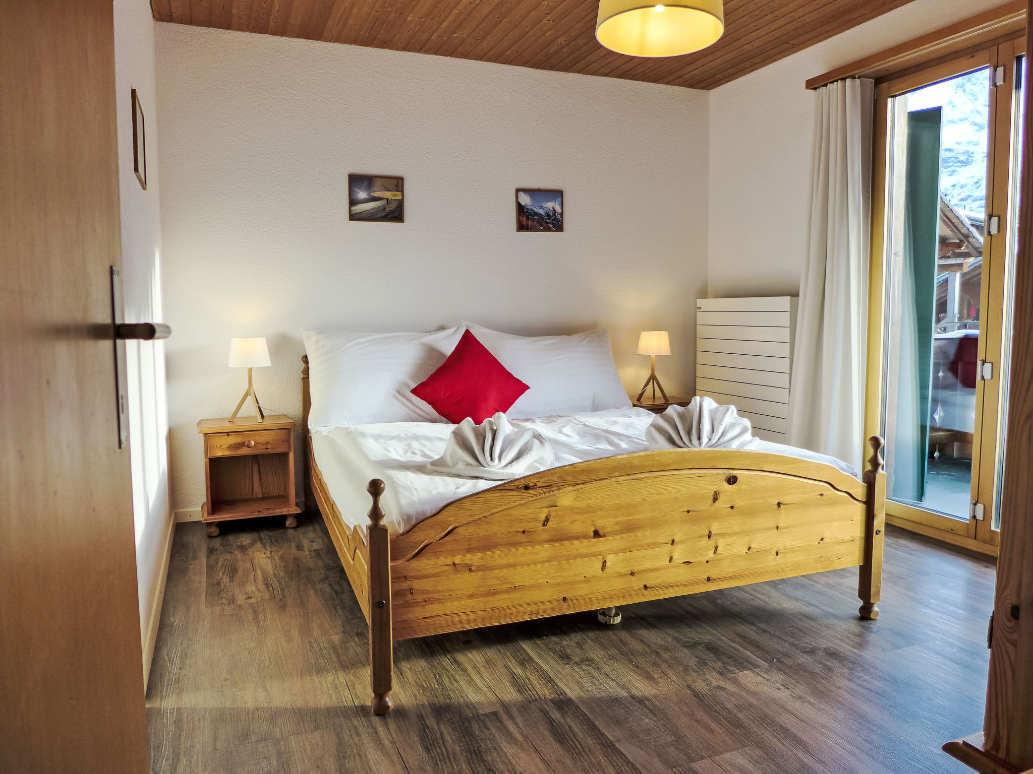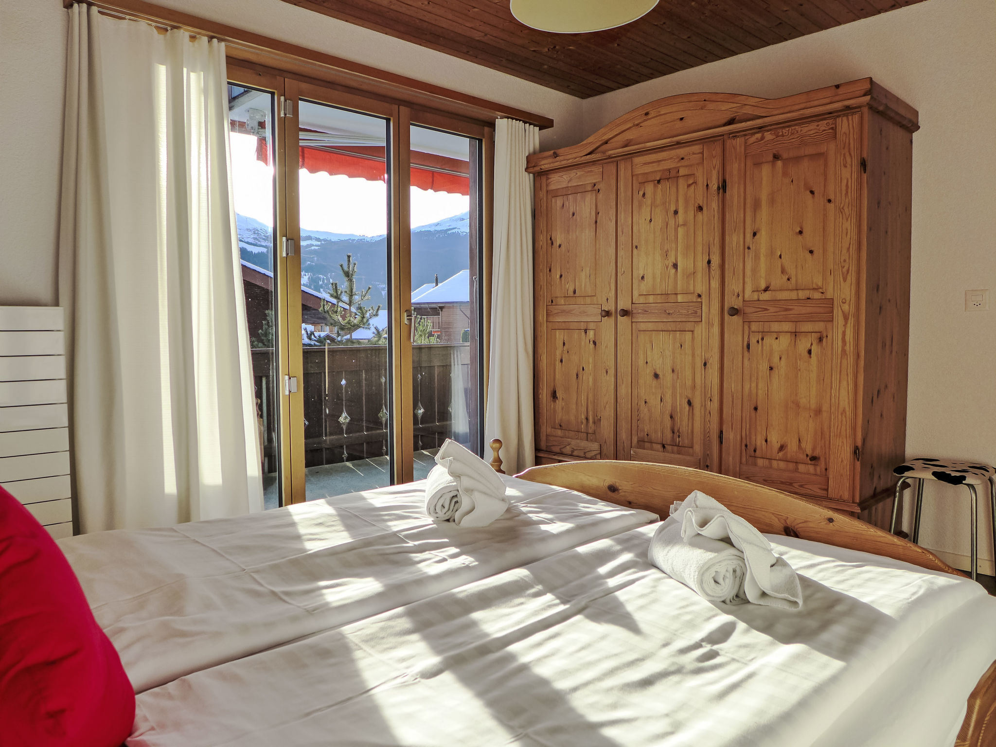 3-Zimmer-Wohnung 80 m2 im 1. Stock, Südlage. Vollständig renoviert im Jahre 2014, gemütlich eingerichtet: Wohn-/Schlafzimmer mit 1 Doppeldiwanbett (160 cm, Länge 200 cm), Esstisch und Kabel-TV (Flachbildschirm), Radio. Ausgang zum Balkon, Richtung Süden. 1 Zimmer mit 1 Doppelbett (2 x 80 cm, Länge 200 cm). Ausgang zum Balkon, Richtung Süden. 1 Zimmer mit 2 Betten (90 cm, Länge 200 cm). Offene Küche (Backofen, Geschirrspüler, 4 Glaskeramikherd Platten, Mikrowelle, elektrische Kaffeemaschine, Racletteofen, Fondue Set (Käse)). Bad/WC. Parkettböden. Balkon 18 m2, Südlage. Balkonmöbel. Herrliche Panoramasicht auf die Berge und Eigernordwand und Fiescherwand. Zur Verfügung: Haartrockner. Internet (Wireless LAN, gratis). Parkplatz, Garage Nr. Bienli in 50 m. Bitte beachten: Nichtraucher-Unterkunft. Feuerlöscher. Bei Belegung mit weniger Personen als der maximalen Personenzahl stehen nicht alle Schlafzimmer zur Verfügung.