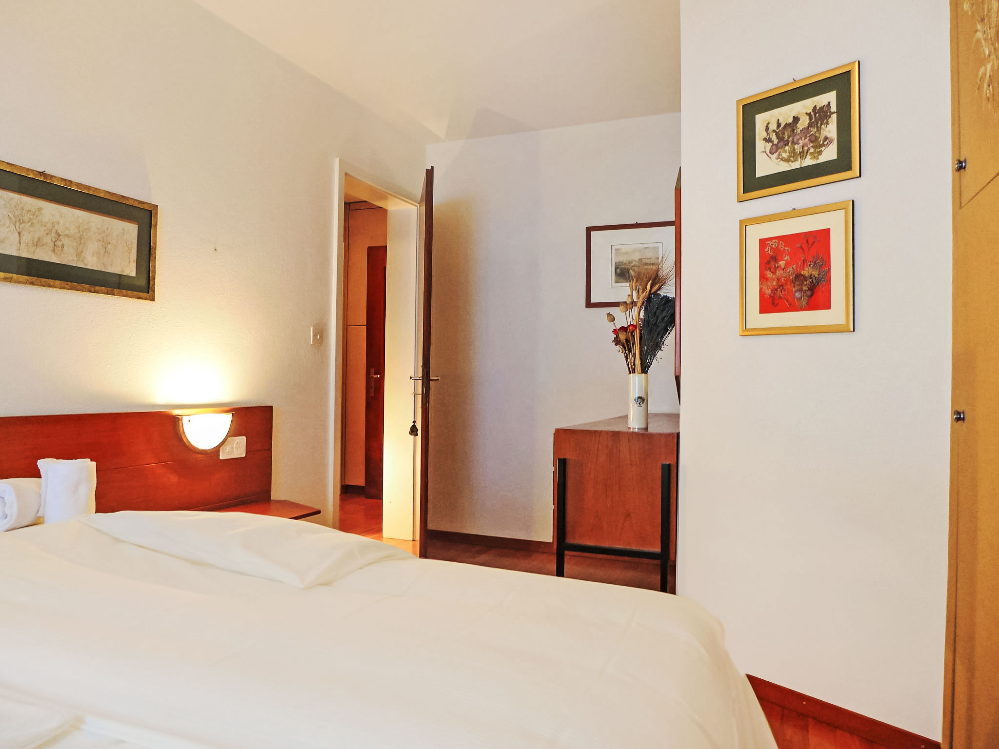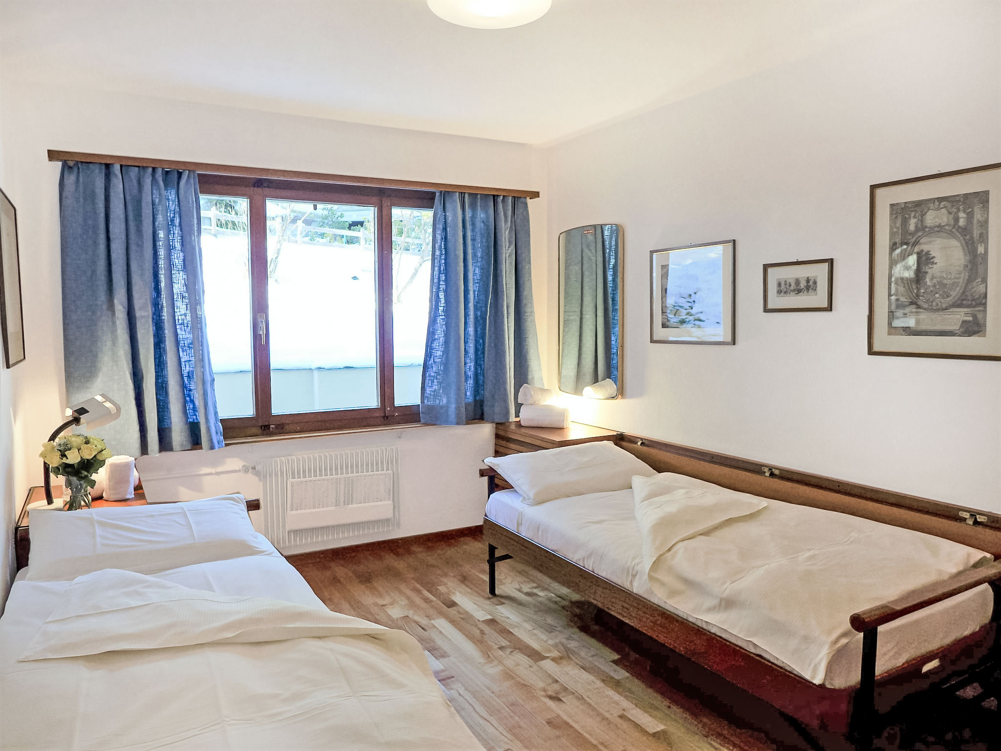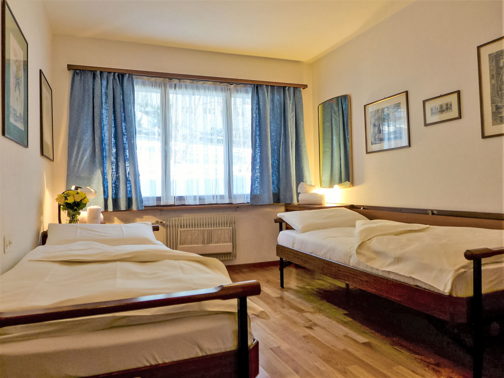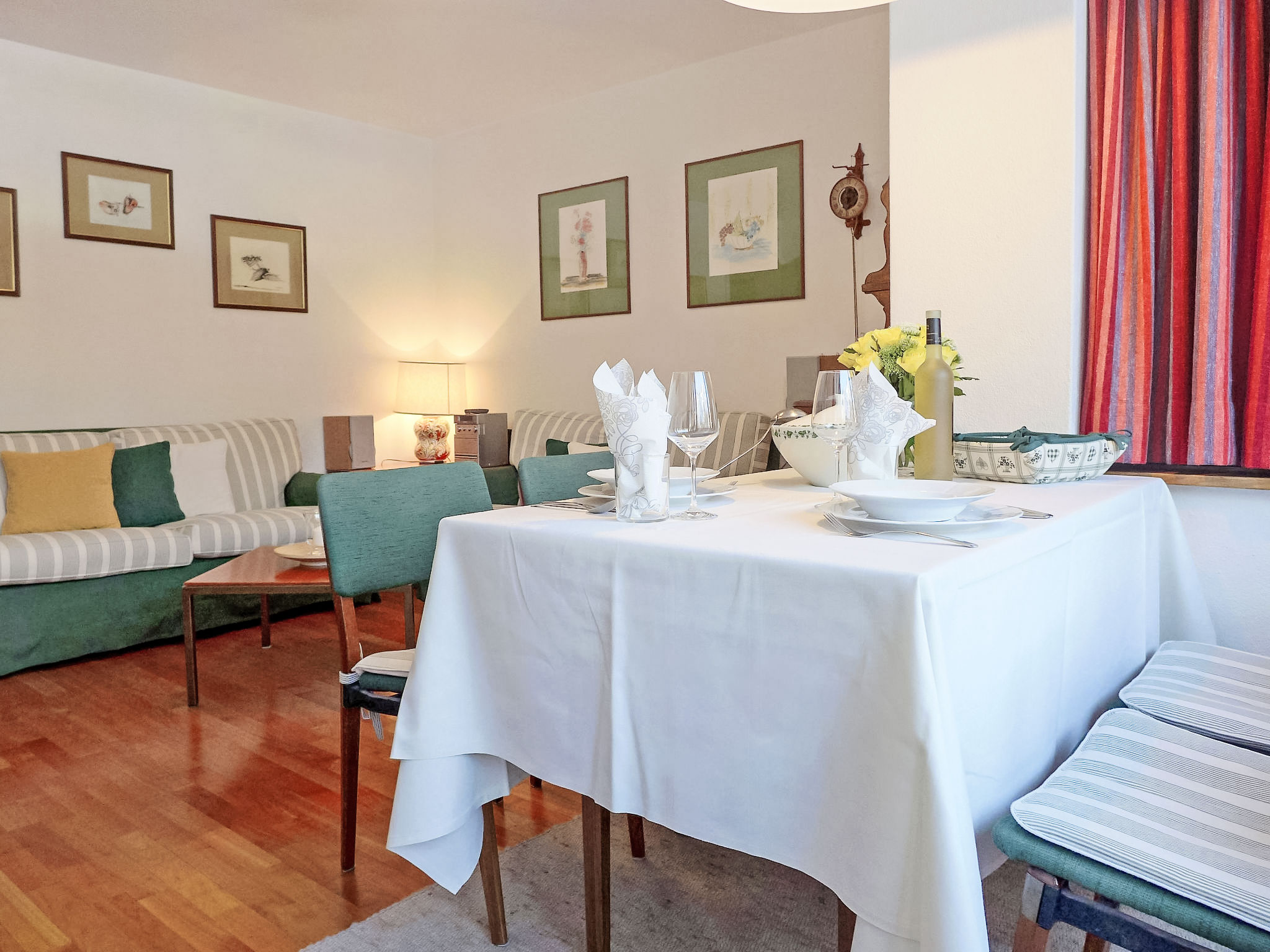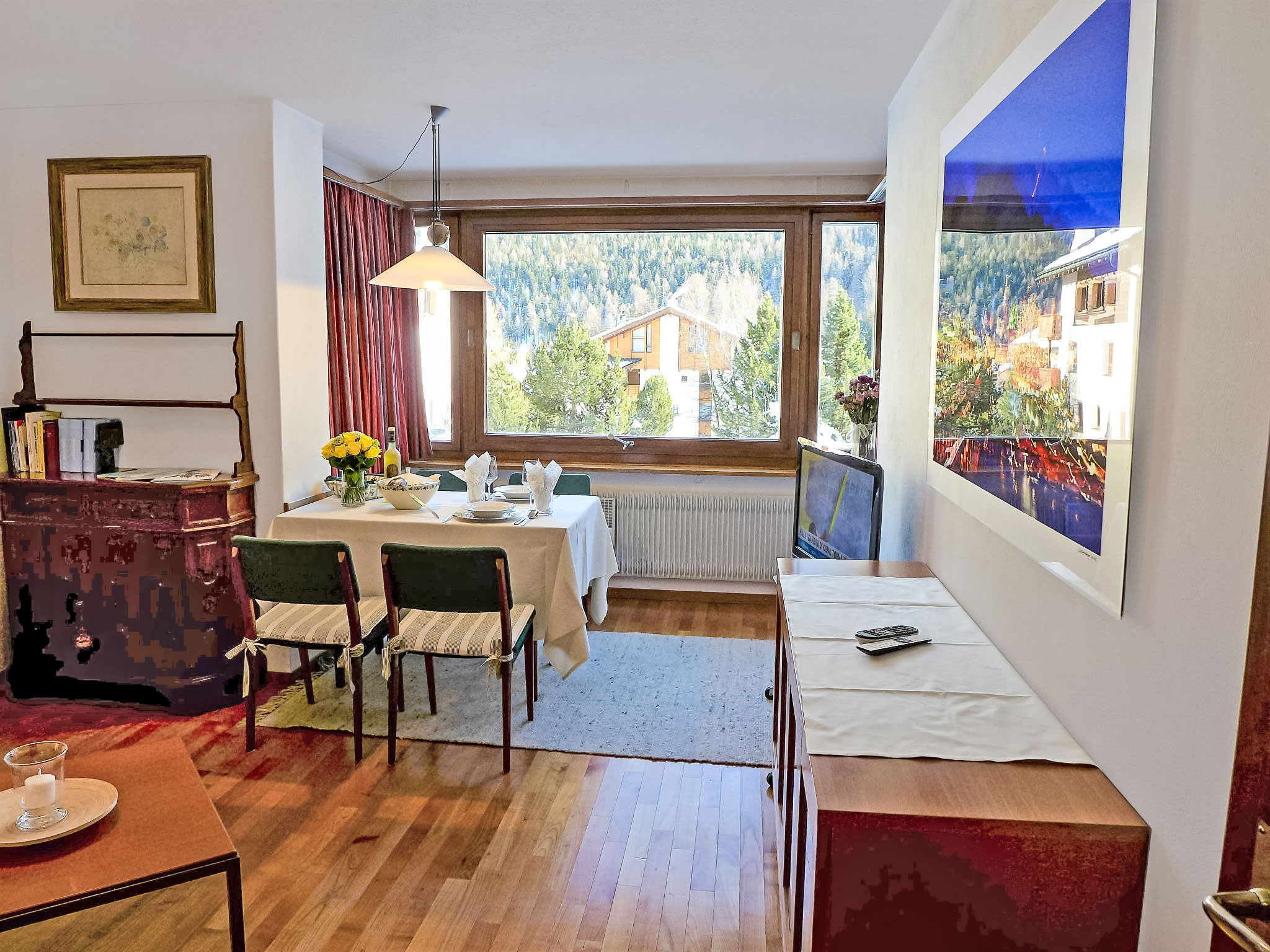 "Chesa Arlas A1", 3-Zimmer-Wohnung 70 m2 im 1. Stock. Zweckmässig und gemütlich eingerichtet: Wohn-/Esszimmer mit TV (Flachbildschirm), Stereoanlage. Ausgang zum Balkon. 1 Zimmer, Fenster zum Hof mit 1 Doppelbett (2 x 90 cm, Länge 200 cm). 1 Zimmer, Fenster zum Hof mit 2 Betten (90 cm, Länge 200 cm). Kleine Küche (Backofen, Geschirrspüler, 4 Glaskeramikherd Platten, Toaster, Wasserkocher, elektrische Kaffeemaschine, Kapseln für die Kaffeemaschine (Nespresso) extra). Bad/WC. Parkettböden. Balkonmöbel (2). Sehr schöne Panoramasicht auf die Berge und die Landschaft. Zur Verfügung: Bügeleisen, Haartrockner. Internet (Wireless LAN, gratis). Garage Nr. A1 auf dem Grundstück, Höhe 190 cm, Breite 210 cm. Bitte beachten: geeignet für Familien. Nichtraucher-Unterkunft, Parkplatz nur für kleine Wagen. 1 kleines Haustier/Hund erlaubt.