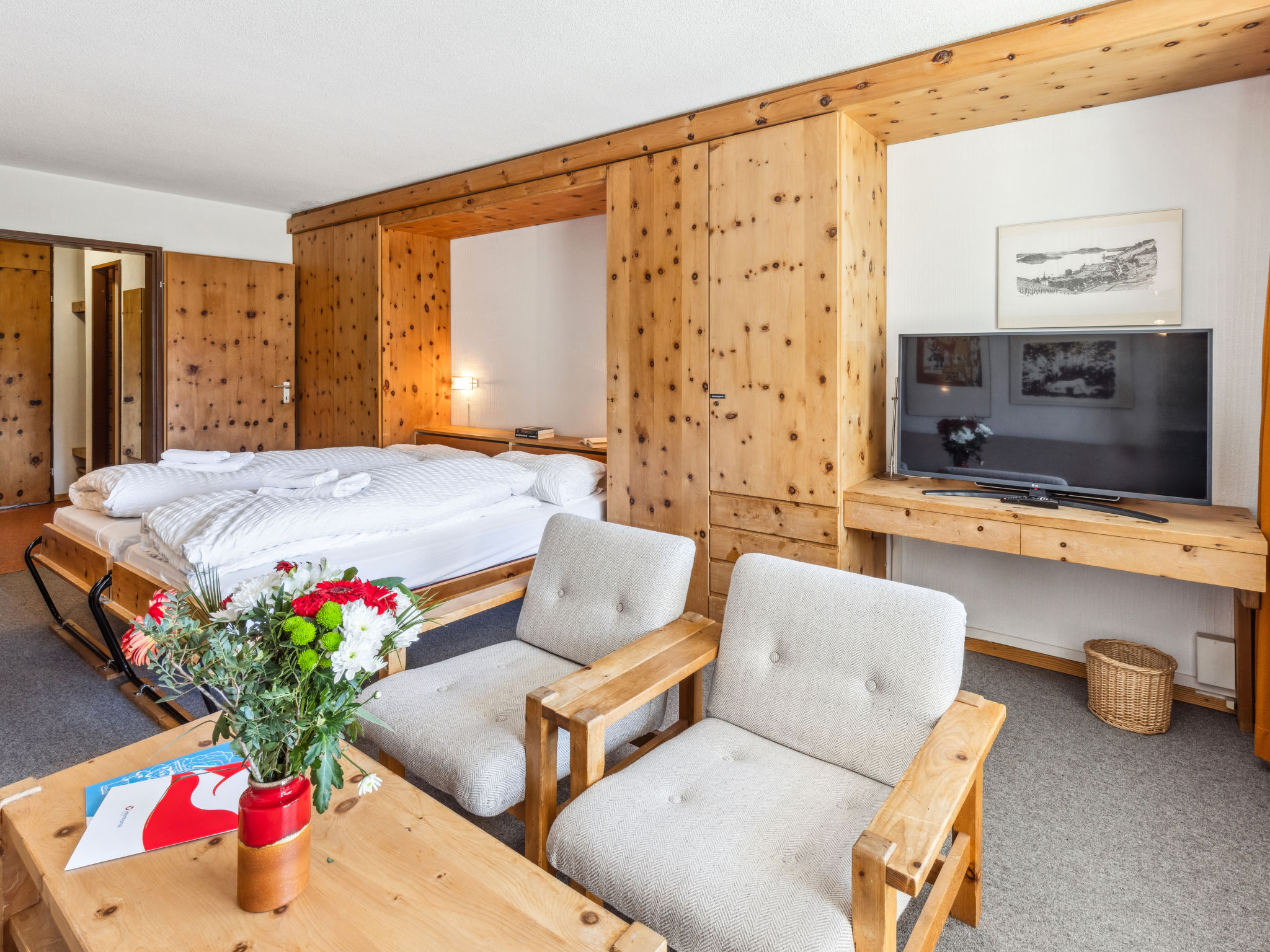 1-Zimmer-Wohnung 38 m2 im 3. Stock. Komfortabel und rustikal eingerichtet: Wohn-/Esszimmer mit 2 Wandschrankbetten und Kabel-TV (Flachbildschirm), Radio. Ausgang zum Balkon. Kochnische (2 Kochplatten, Backofen). Dusche/WC. Balkon 7 m2, Südlage. Schöne Sicht auf die Berge, die Landschaft und die Ortschaft. Zur Verfügung: Internet (Wireless LAN, gratis). Parkplatz. Bitte beachten: Nichtraucher-Unterkunft.