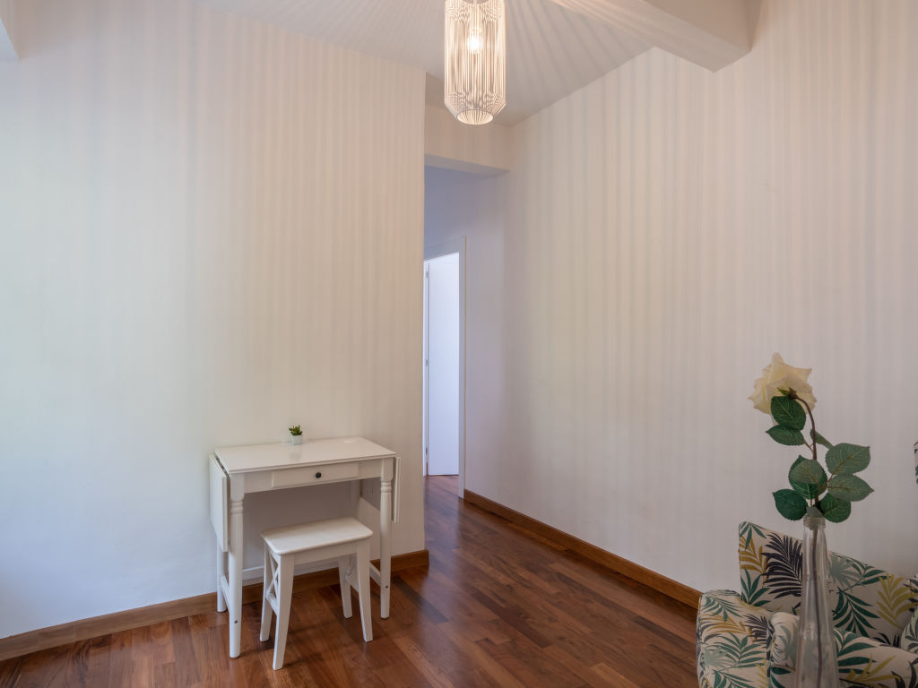 "Mare Largo", 3-Zimmer-Wohnung 80 m2 im 1. Stock. Hell, modern eingerichtet: Wohn-/Schlafzimmer mit Panoramafenster mit 1 Doppeldiwanbett (160 cm), Esstisch und TV. Ausgang zur Terrasse. 1 offenes Zimmer (160 cm). 1 offenes Zimmer mit 1 x 2 Etagenbetten (80 cm). Offene Küche (4 Kochplatten, Backofen, Tiefkühler). Dusche/WC. G-Heizung. Terrasse 50 m2, Südlage. Terrassenmöbel, Elektrogrill (mobil), Liegestühle (3), Abstellkammer. Herrliche Panoramasicht auf das Meer und die Bucht. Zur Verfügung: Waschmaschine, Kinderhochstuhl, Babybett. Internet (Wireless LAN, gratis). CITRA: 008065-LT-0191