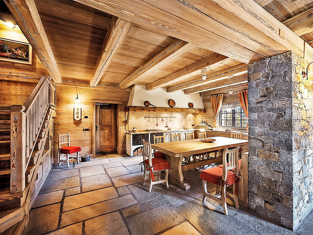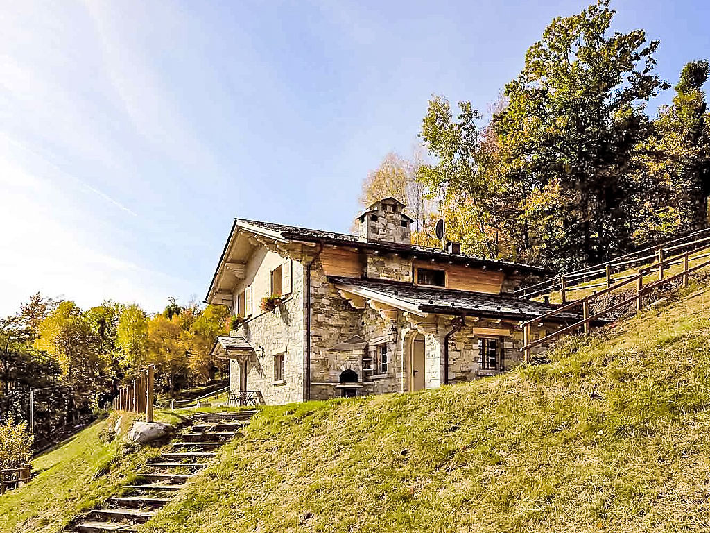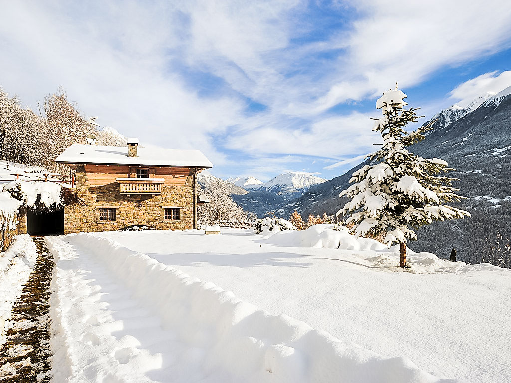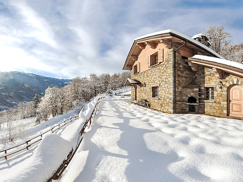 5-Zimmer-Chalet 300 m2 auf 2 Stockwerken. Geräumig und hell, teilweise abgeschrägt, schön und stilvoll eingerichtet: offenes grosses Wohnzimmer mit offenem Kamin und Kabel-TV (Flachbildschirm). Ausgang zum Garten. Grosse Wohnküche (4 Kochplatten, Backofen, Geschirrspüler, Toaster, Mikrowelle, Tiefkühler, elektrische Kaffeemaschine, Kapseln für die Kaffeemaschine (Nescafè Dolce Gusto)) mit Esstisch, Essecke und Holzofen. Dusche/Bidet/WC. Obergeschoss: 1 Zimmer mit 1 Bett und 1 x 2 Etagenbetten, TV. 1 Zimmer mit 1 franz. Bett und TV. 1 Zimmer mit 1 franz. Bett und Dusche/Bidet/WC. Ausgang zum Balkon. Dusche/Bidet/WC. Holzböden, Natursteinböden. Kleiner Balkon. Liegestühle (4). Sehr schöne Panoramasicht auf die Berge, das Tal und den Garten. Zur Verfügung: Waschmaschine, Haartrockner, Holz (extra). Internet (Wireless LAN, gratis). Bitte beachten: Nichtraucher-Haus. 1 Haustier/Hund erlaubt. 014034-CNI-00002