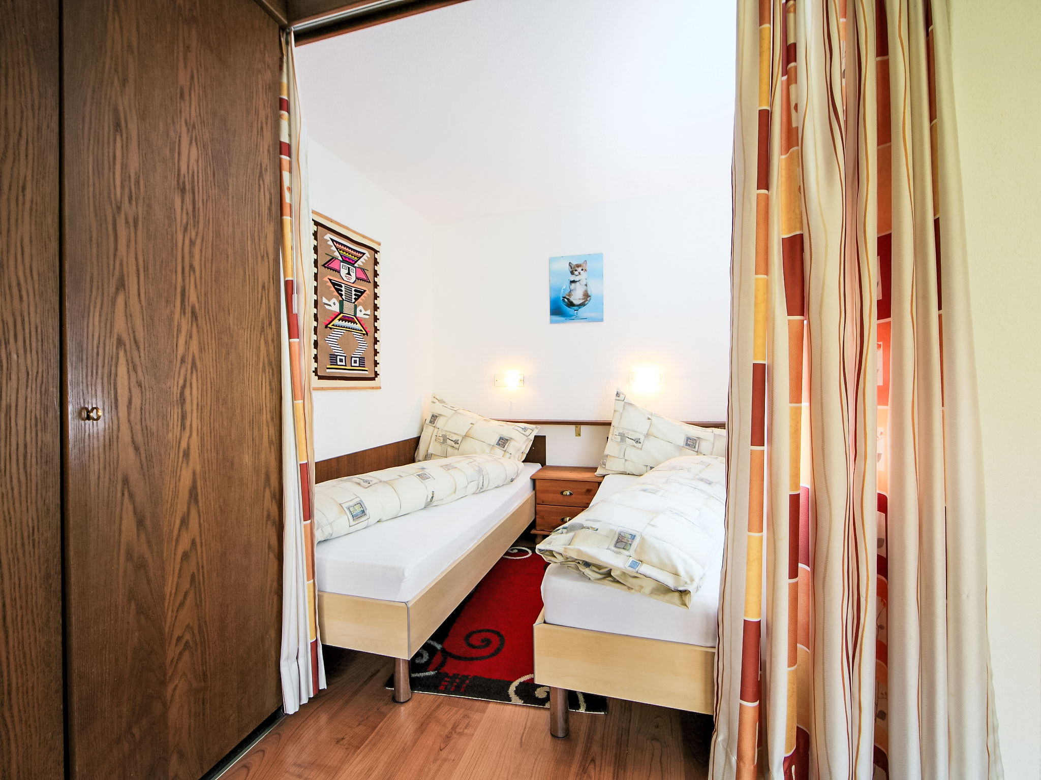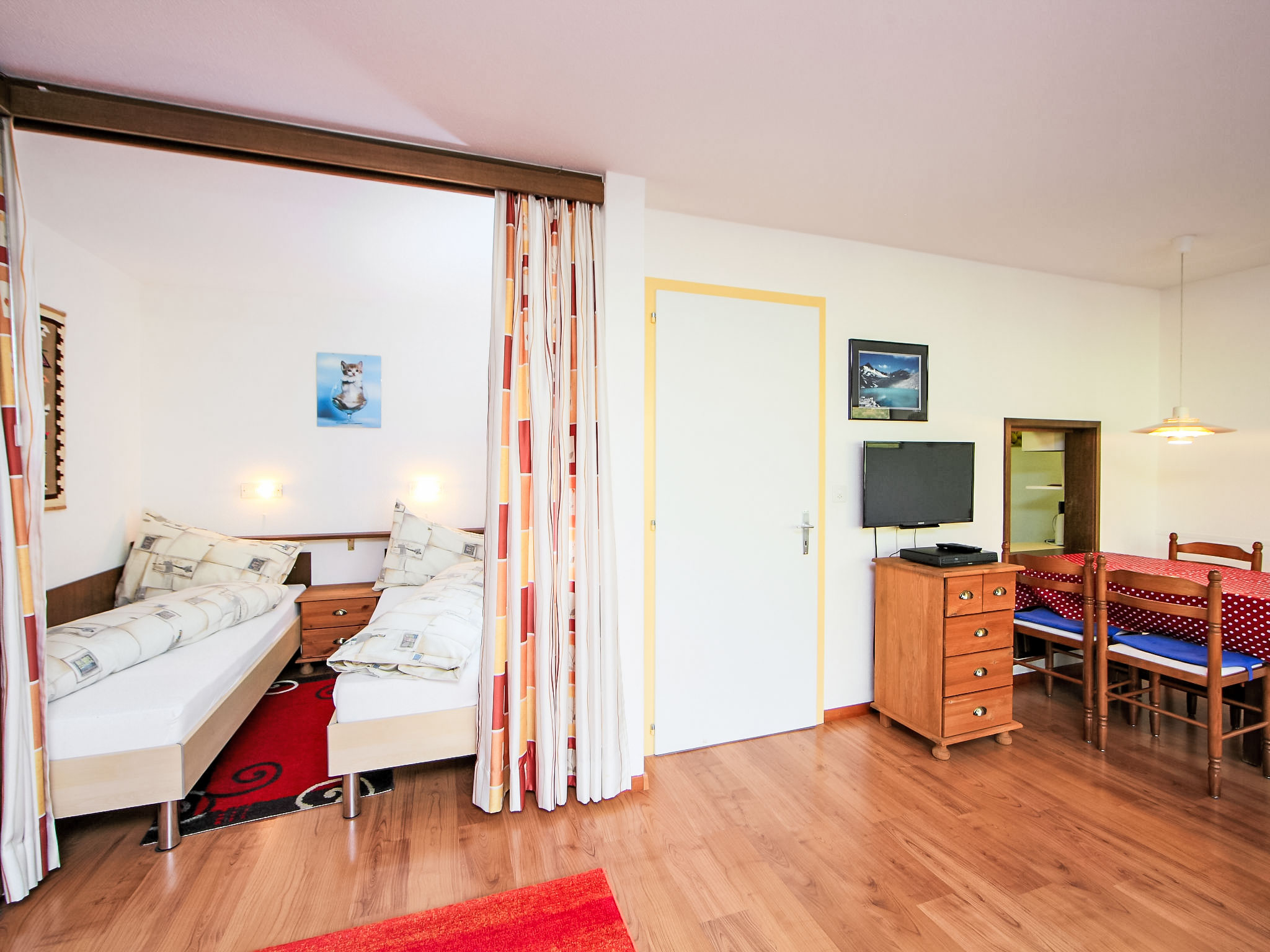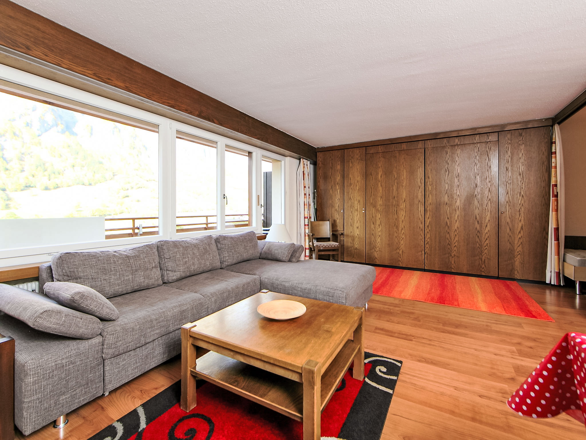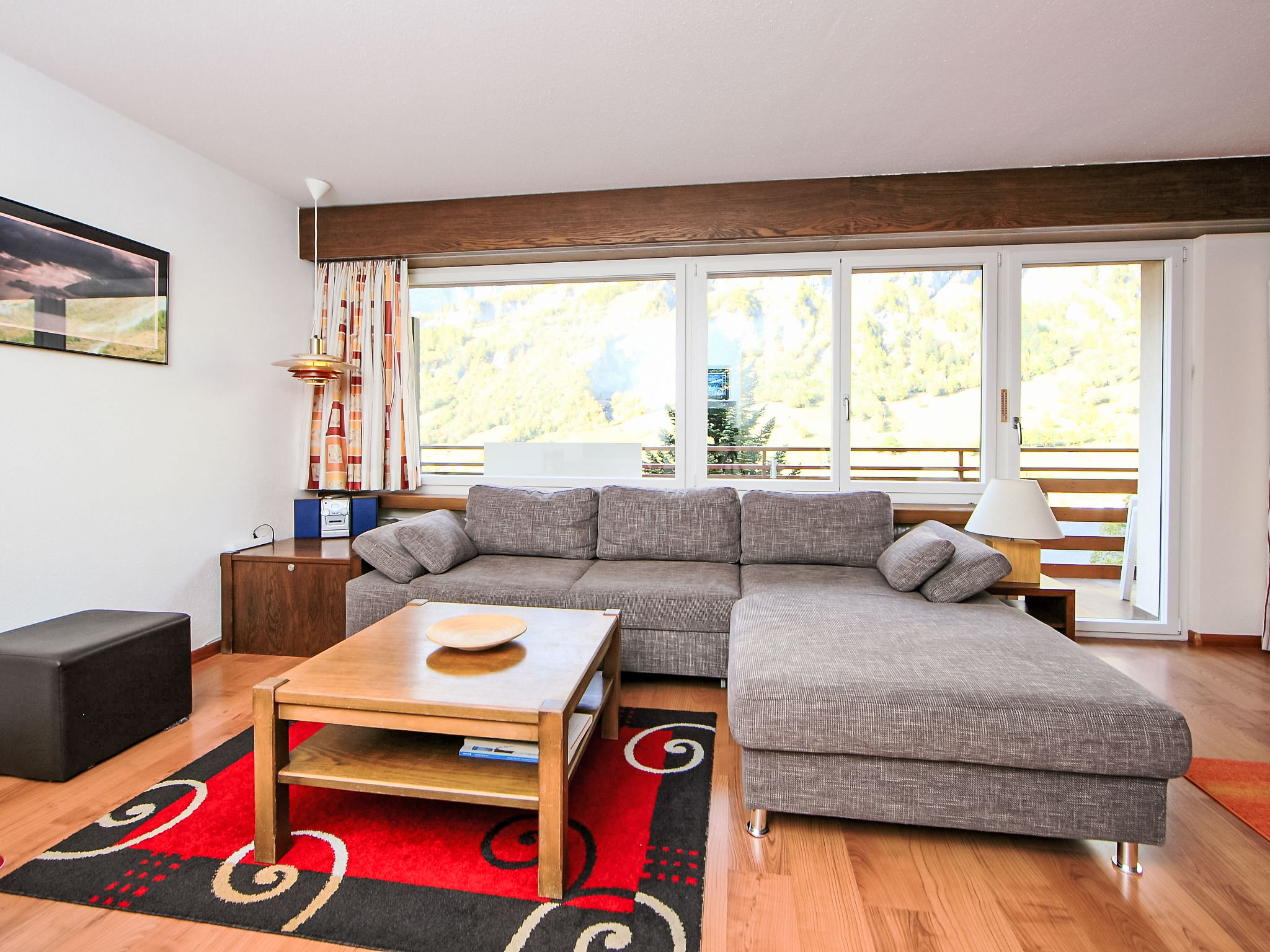 1-Zimmer-Wohnung 50 m2 im 3. Stock. Zweckmässig eingerichtet: Wohn-/Esszimmer mit 2 Wandschrankbetten und Kabel-TV (Flachbildschirm), Stereoanlage. Schlafnische mit Vorhang mit 2 Betten. Küche (3 Kochplatten, Backofen, elektrische Kaffeemaschine, Kapseln für die Kaffeemaschine (Nespresso) extra). Bad/WC. Balkon. Terrassenmöbel. Sicht auf die Berge und das Tal. Zur Verfügung: Telefon. Internet (Wireless LAN, gratis). Bitte beachten: Nichtraucher-Unterkunft. Maximal 1 Haustier/Hund erlaubt.