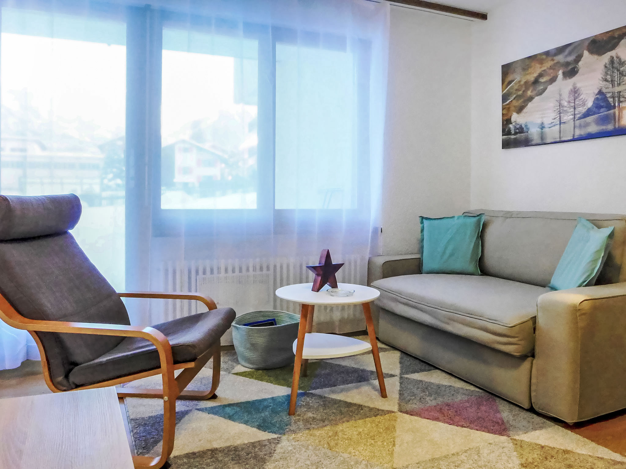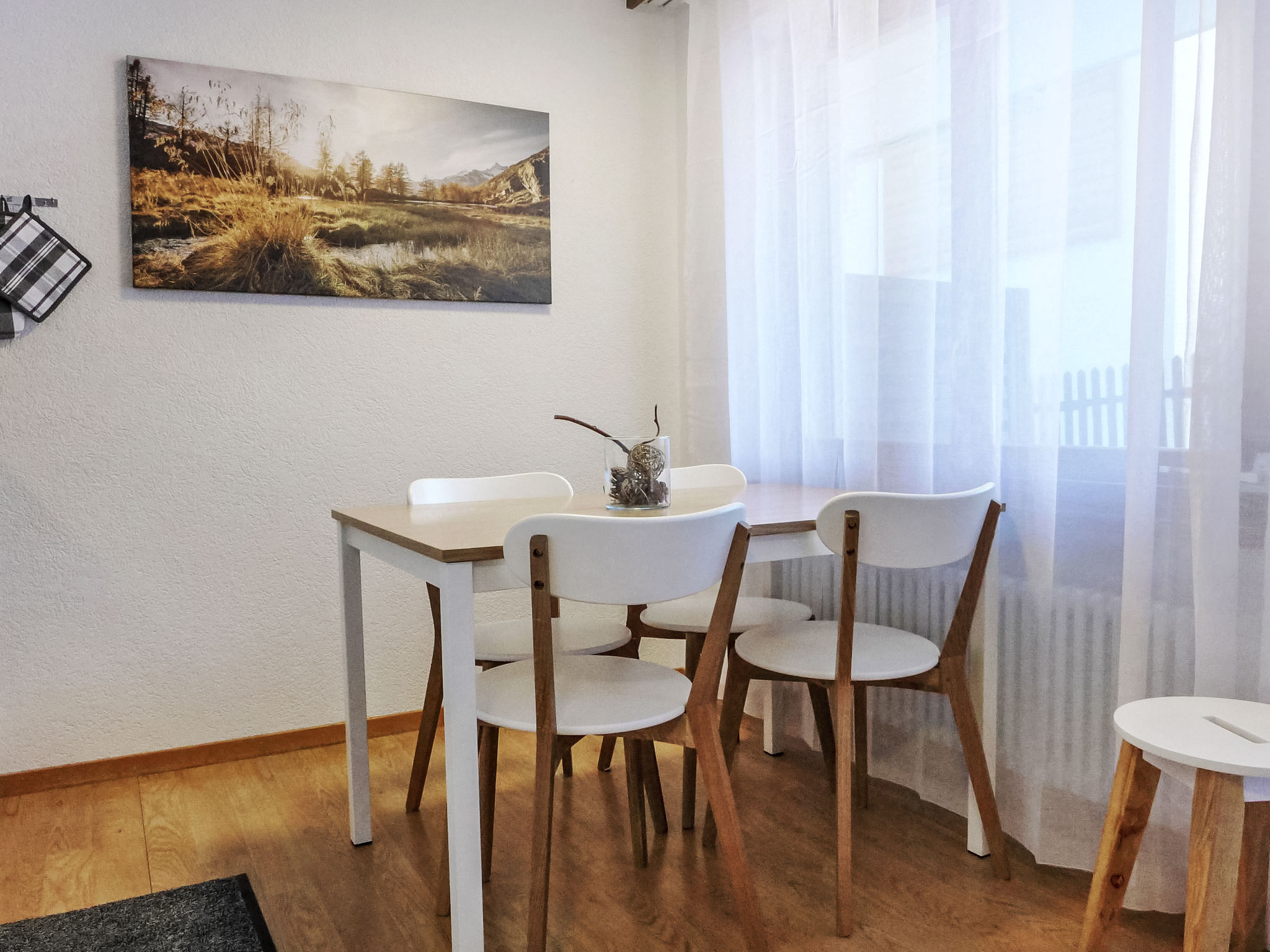 1-Zimmer-Wohnung 30 m2, im Erdgeschoss, Südlage. Hell, teilweise im Jahre 2017, einfach und gemütlich eingerichtet: Wohn-/Schlafzimmer mit 2 Doppelwandklappbetten (2 x 90 cm, Länge 200 cm), TV. Ausgang zum Garten, zur Terrasse. Offene Küche (3 Kochplatten, Backofen, Toaster, Wasserkocher, Tiefkühler, elektrische Kaffeemaschine, Fondue Set (Käse)) mit Esstisch. Dusche/WC. Heizung. Terrasse, Südlage. Terrassenmöbel. Schöne Sicht auf die Berge. Zur Verfügung: Haartrockner. Internet (Wireless LAN, gratis). Bitte beachten: Nichtraucher-Unterkunft.