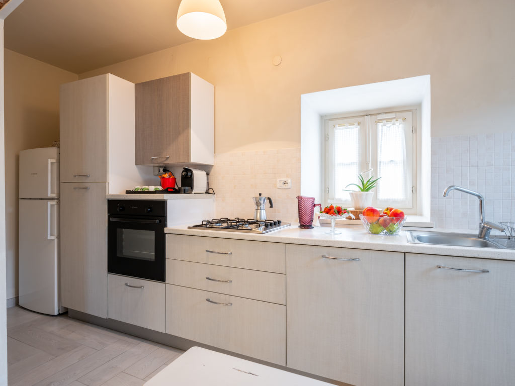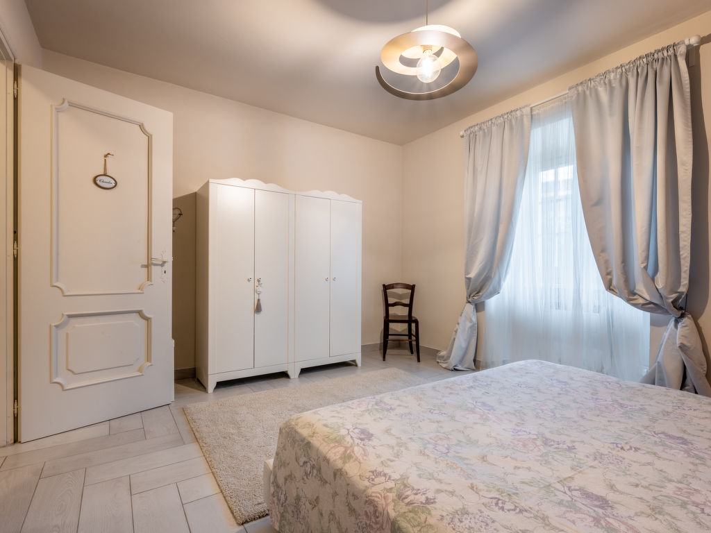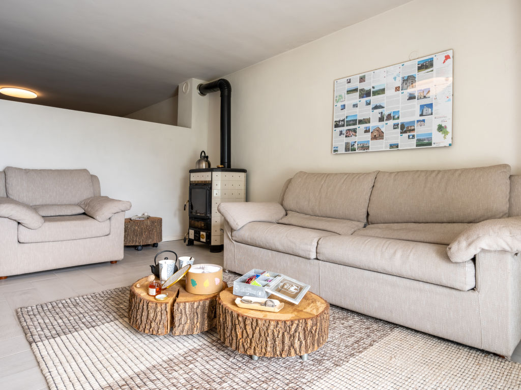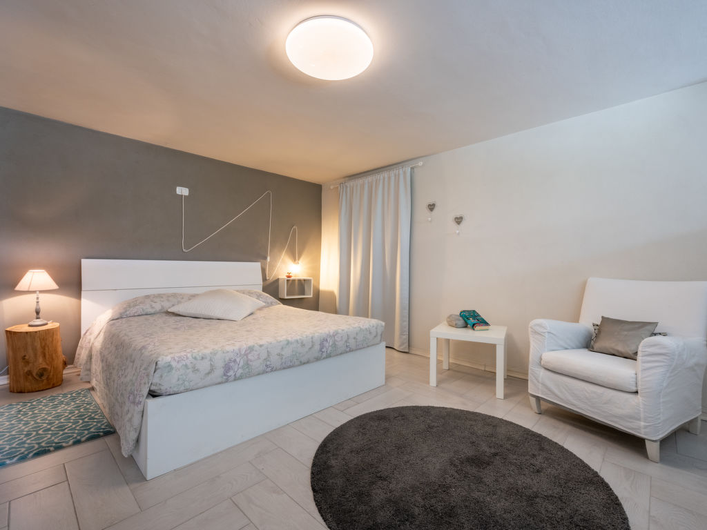 3-Zimmer-Wohnung, Erdgeschoss, ca. 90 m². Separater Zugang in Wohnküche mit Sitzcouch, Essplatz, Küchenzeile (4 Flammen, Backofen, Kühl-/Gefrierkombination, Kaffeekapselmaschine, Wasserkocher, Toaster). Doppelzimmer. Schlafzimmer mit Doppelbett, durch Raumteiler abgetrennter Wohnbereich mit Sitzgruppe, Gasofen, Terrassenausgang. Bad/Dusche/WC. CIR: 005091-BEB-00002
