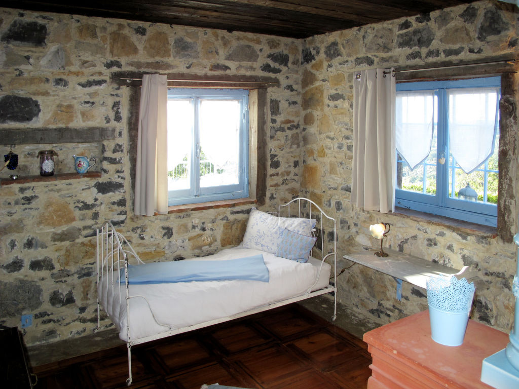 3-Zimmer-Haus, 2 Etagen, ca. 60 m². Erdgeschoss (Hanglage): Wohn-/Schlafraum mit Kaminofen und antikem Einzelbett, über einige Stufen zur Küche (4 Flammen, Backofen, Geschirrspüler, Kühl-/Gefrierkombination, Kaffeemaschine, Wasserkocher, Toaster) mit Essplatz. Dusche/WC. Vom Eingangsbereich Wendeltreppe ins Obergeschoss: Doppelzimmer (Bett 1,60 m breit, Raum nicht durch Tür abgeschlossen). Schlafzimmer mit franz. Bett (1,60 m breit, Verbindungstür zu anderem Schlafzimmer) und Terrassenausgang. Dusche/WC. CITRA: 008041-LT-0009