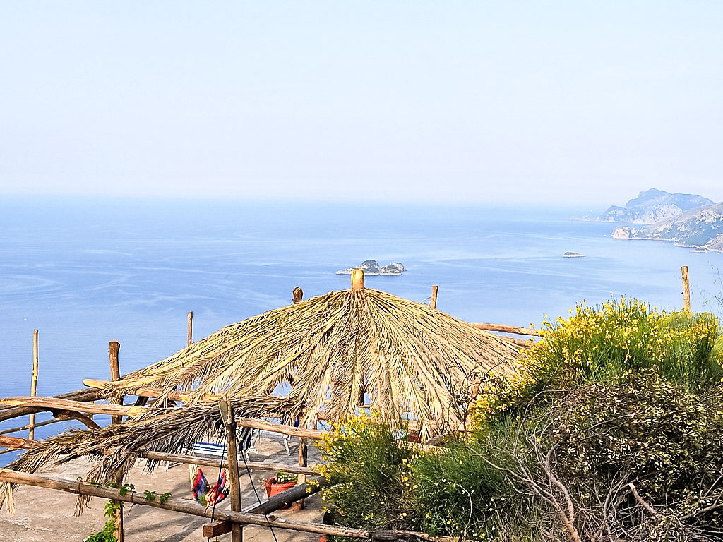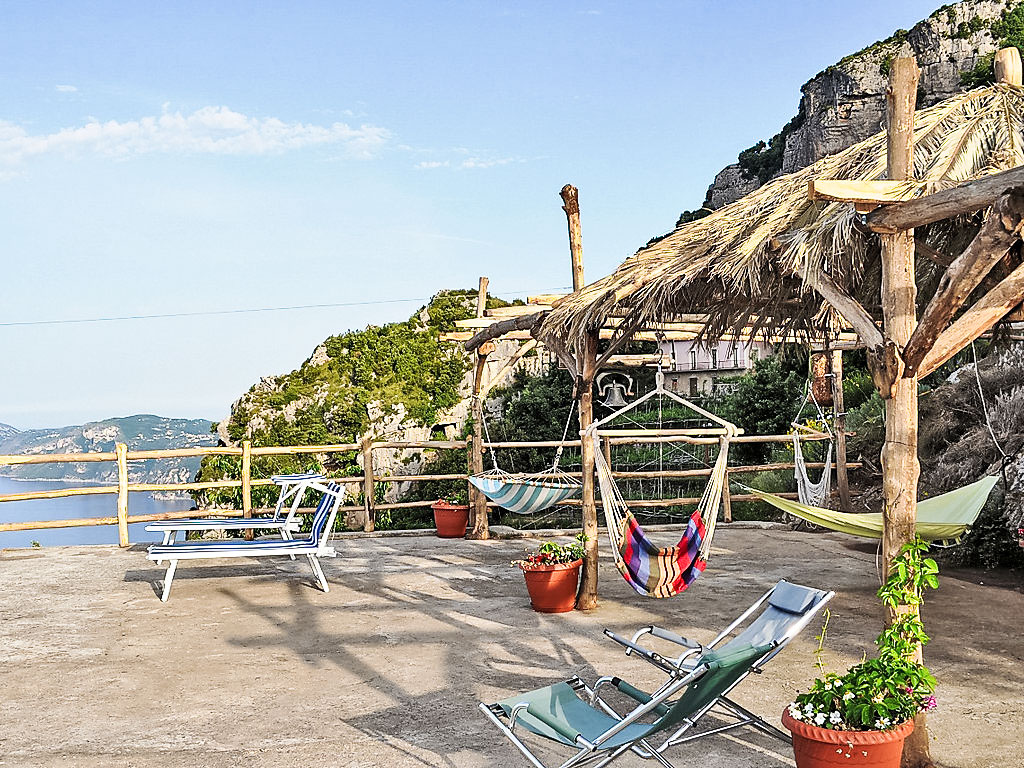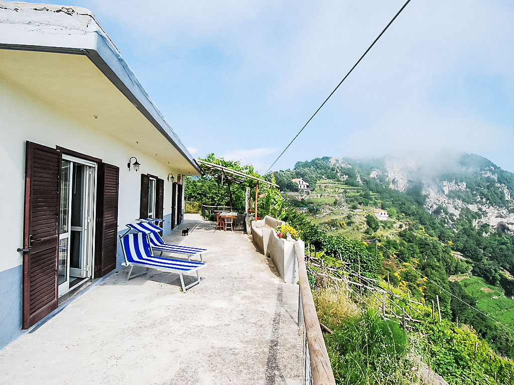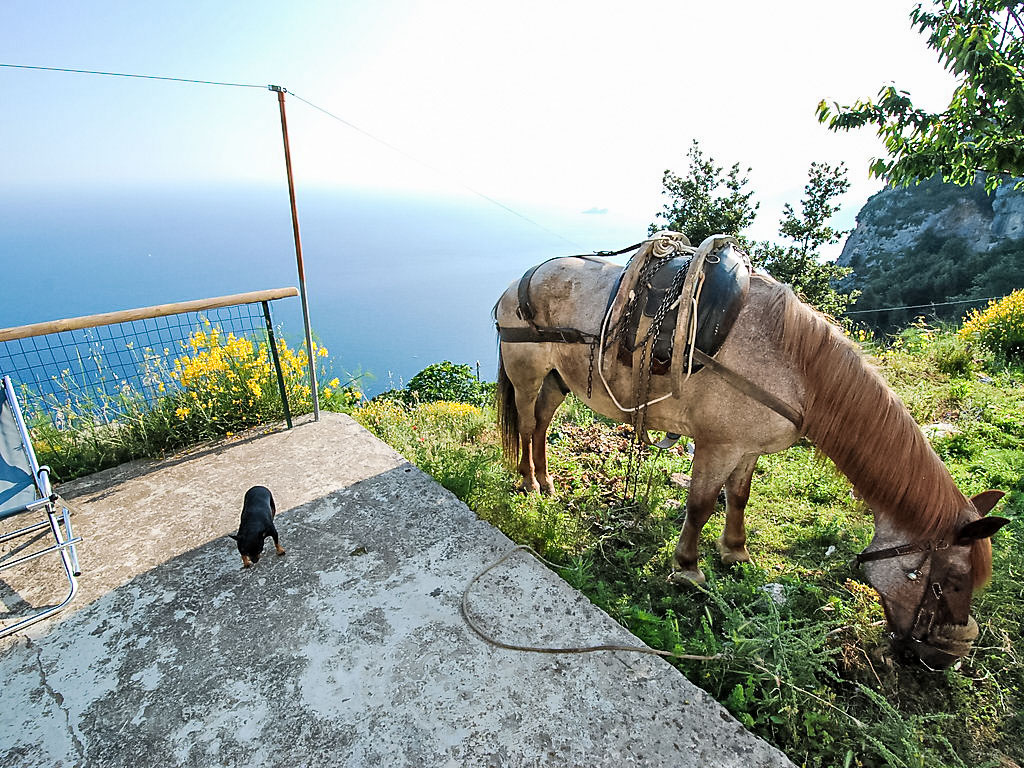 3-Zimmer-Haus 80 m2, Südwestlage. Hell, einfach und zweckmässig eingerichtet: 1 Zimmer mit Panoramafenster mit 3 Betten und Klimaanlage. Ausgang zur Terrasse. 1 Zimmer mit 3 Betten und Klimaanlage. Ausgang zur Terrasse. Offenes Esszimmer mit offenem Kamin und TV. Ausgang zum Garten, zur Terrasse. Kochnische (4 Kochplatten, Backofen, Geschirrspüler, Tiefkühler). Dusche/Bidet/WC. Klimaanlage. 2 grosse Terrassen, Gartensitzplatz, Garten. Terrassenmöbel, Gartengrill, Liegestühle. Herrliche Panoramasicht auf das Meer, das Tal, die Landschaft und die Ortschaft. Zur Verfügung: Waschmaschine, Haartrockner. Maximal 1 kleines Haustier/Hund erlaubt. Ideal für Wanderer und Naturfreunde. Die Wohnung kann nur zu Fuss erreicht werden (ca. 1 km, 15 min Gehweg), auf dem berühmten Sentiero degli Dei. Für den Gepäcktransport (hin und zurück, inbegriffen) werden Pferde benutzt. Der Weg ist unbeleuchtet. Den Gästen steht Gemüse und Obst aus dem Garten zur Verfügung. Herrliches Panorama auf das Meer und nach Capri.