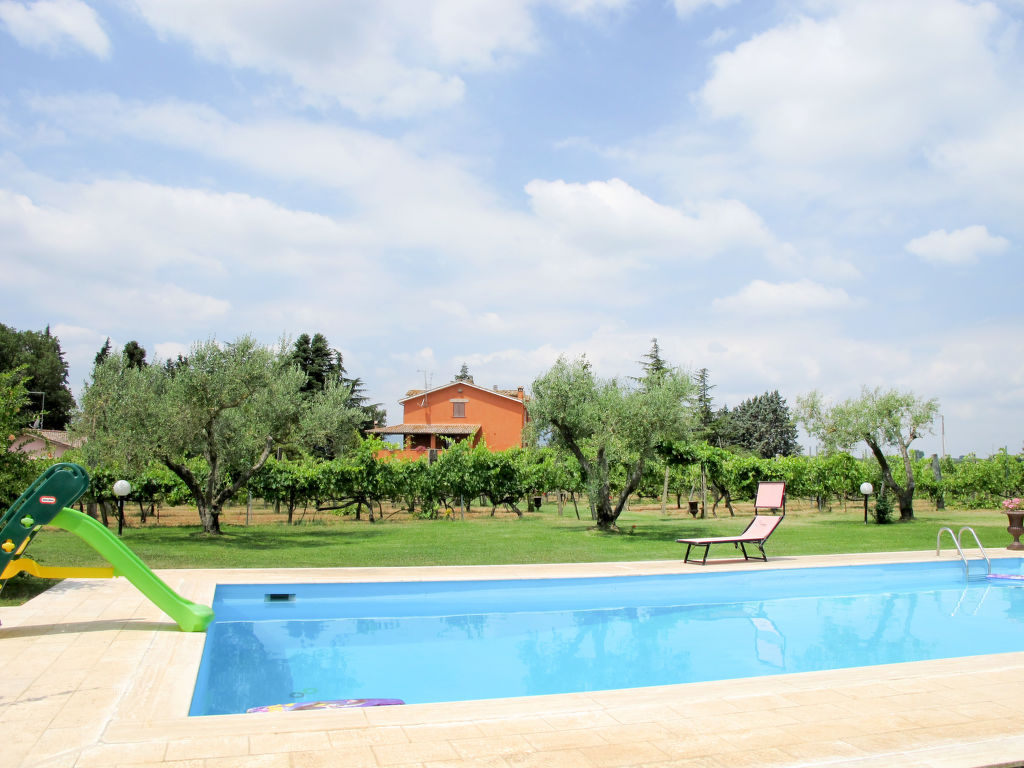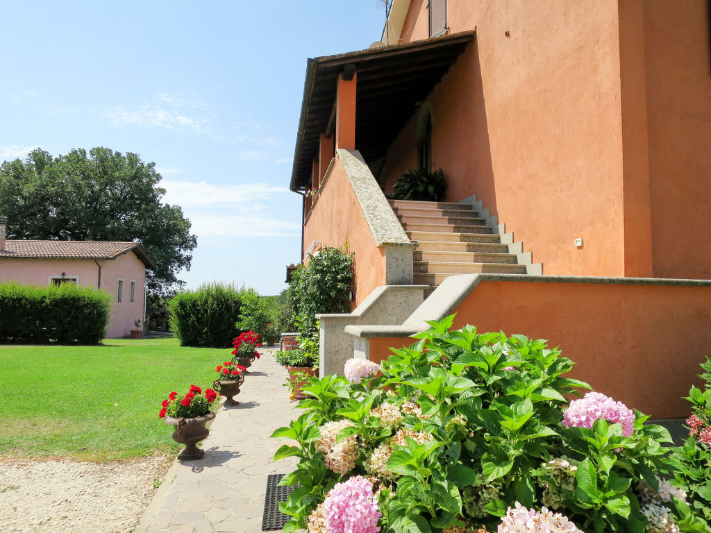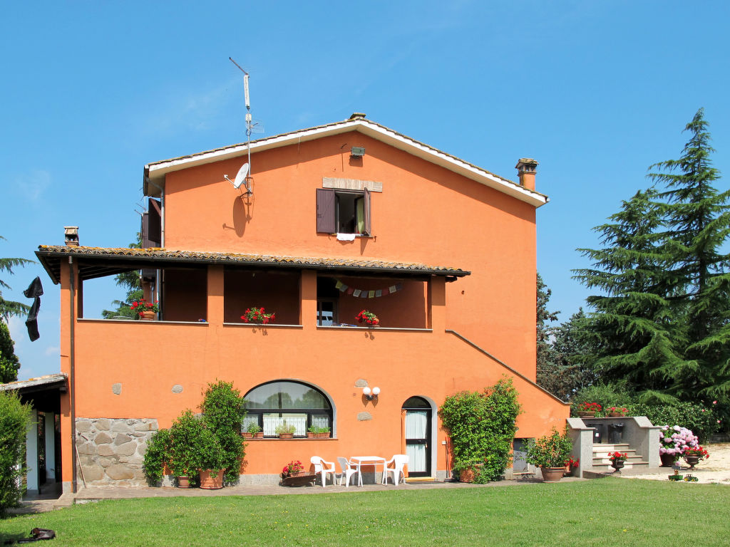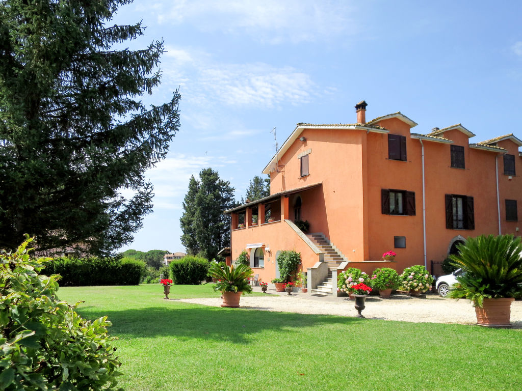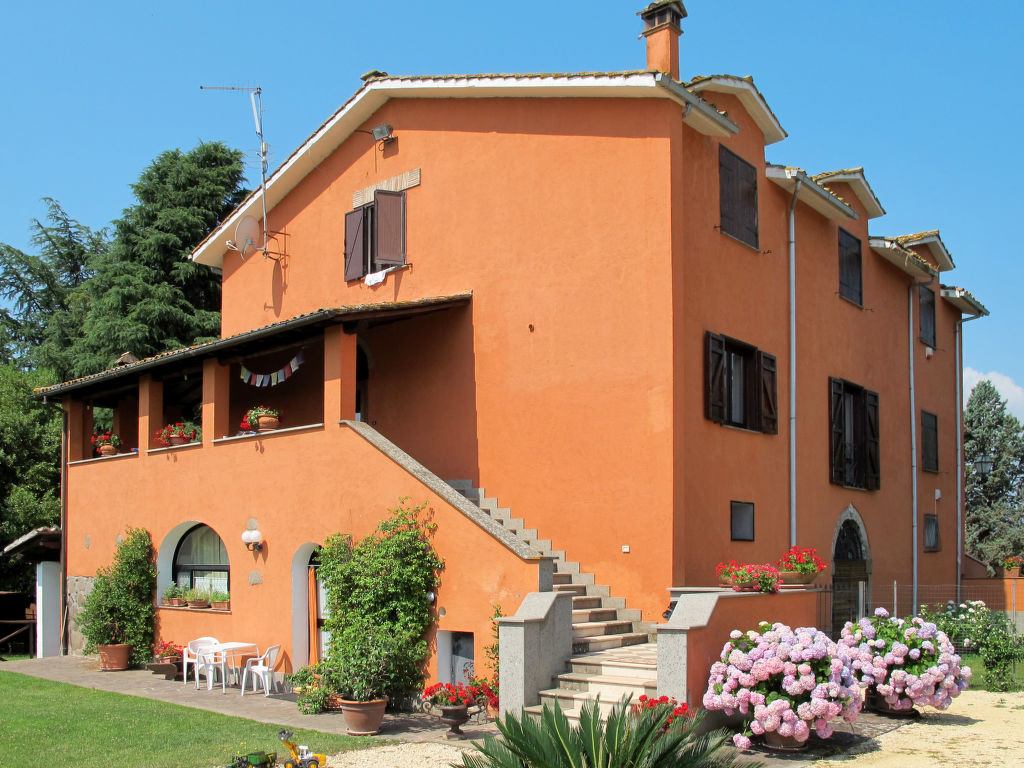 Landsitz "Santa Bruna". 15 km vom Zentrum von Orte, 30 km vom Zentrum von Viterbo, 70 km vom Zentrum von Roma, 25 km vom See, im Grünen. Zur Mitbenutzung: Grundstück 11 ha (eingezäunt). Zur Alleinbenutzung: Grundstück 5'000 m2, gepflegter Garten mit Rasen und Bäumen, Liegewiese, Schwimmbad (6 x 13 m, 140 - 300 cm tief, 18.05.-05.10.). Sitzplatz, Grill, Kinderspielplatz (Rutschbahn, Schaukel), Poolpflege durch den Besitzer/Gärtner. 3.7 km lange Zufahrt (4 km Naturweg). Treppenweg bis zum Haus. Parkplatz beim Haus. Einkaufsgeschäft 6 km, Supermarkt 9 km, Bahnstation "Orte" 15 km, Sandstrand 25 km, Freibad 15 km, Hallenbad 15 km. Golfplatz 33 km. Ab Hof Verkauf von bäuerlichen Produkten.