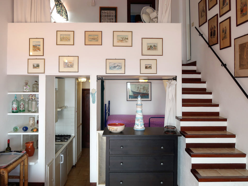 "Spinnaker", 1-Zimmer-Wohnung 40 m2 auf 3 Stockwerken im 1. Stock. Einfach und gemütlich eingerichtet: Wohnzimmer mit TV. Ausgang zur Terrasse. Offene Schlafnische mit 1 x 2 Etagenbetten. Kleine Kochnische (4 Flammen, Tiefkühler). Dusche/Bidet/WC. Obergeschoss: (steile Treppe) abgeschrägte, offene Galerie mit 1 Doppelbett und Dusche/Bidet/WC. Terrasse 8 m2, überdacht. Terrassenmöbel. Schöne Sicht auf das Meer und La Maddalena. Zur Verfügung: Waschmaschine, Bügeleisen, Babybett. Maximal 1 Haustier/Hund erlaubt.