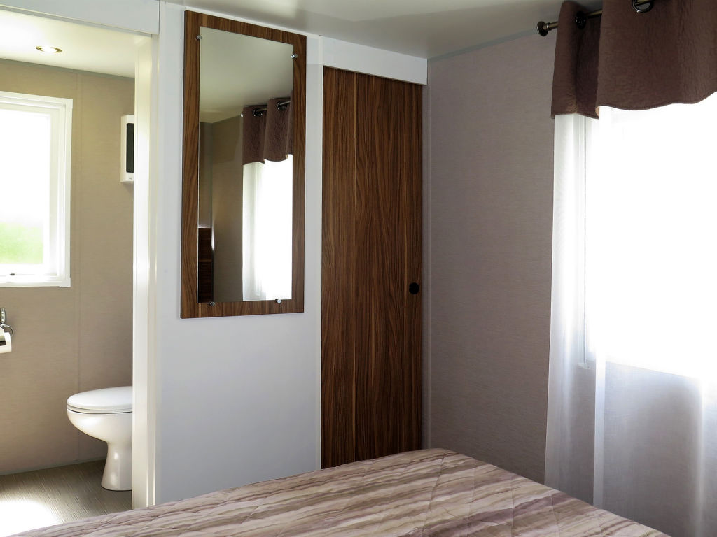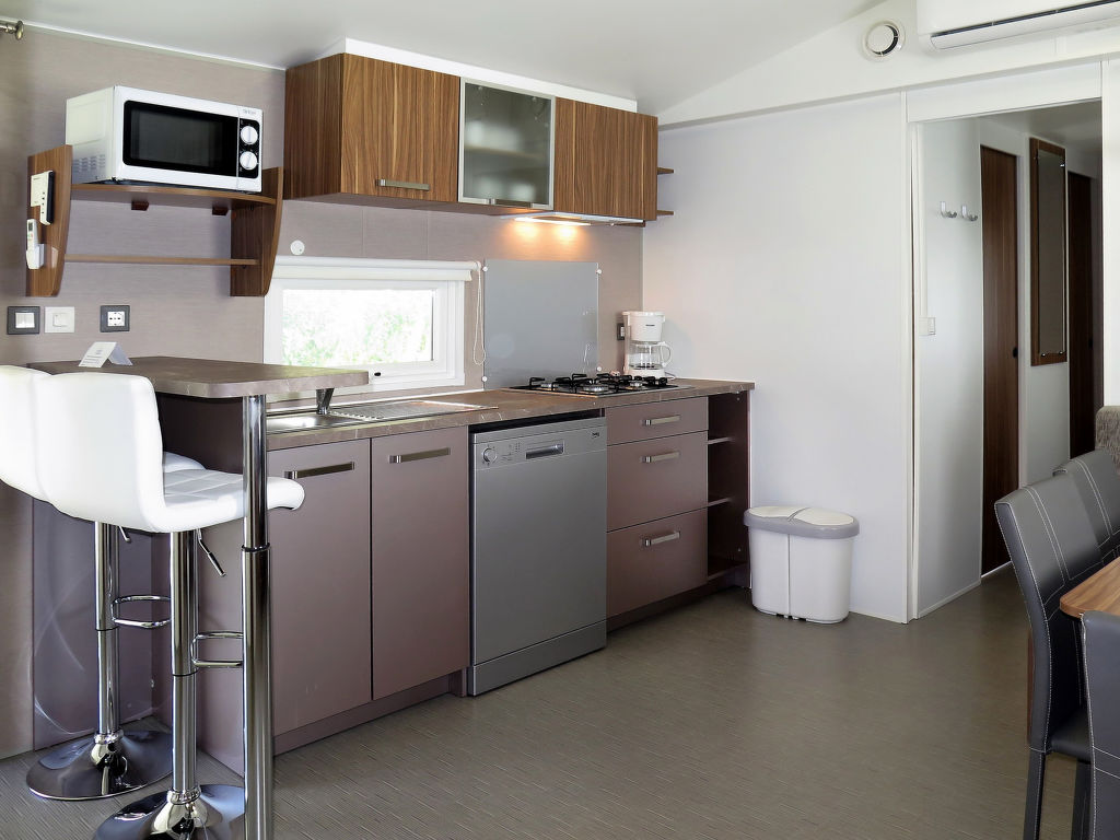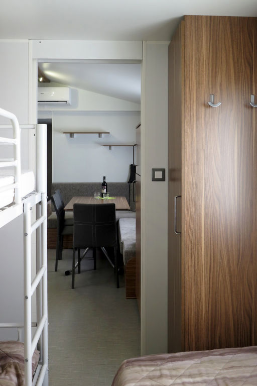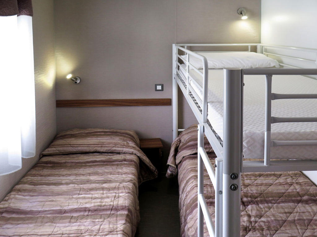 3-Zimmer-Mobilhome, ca. 31 m², zzgl. ca. 15 m² komplett verschließbare, überdachte Terrasse. Über 2 Stufen zum Wohn-/Schlafraum mit Doppelbettcouch, Essplatz, Küchenzeile (4 Flammen, Mikrowelle, kleiner Geschirrspüler, Kühl-/Gefrierkombination, Kaffeemaschine). Doppelzimmer. Schlafzimmer mit Etagenbett und Einzelbett. Dusche/WC. Sep.WC. Maximale Belegung: 6 Erwachsene und 1 Kind bis 10 Jahre. Strandentfernung 80-300 m.