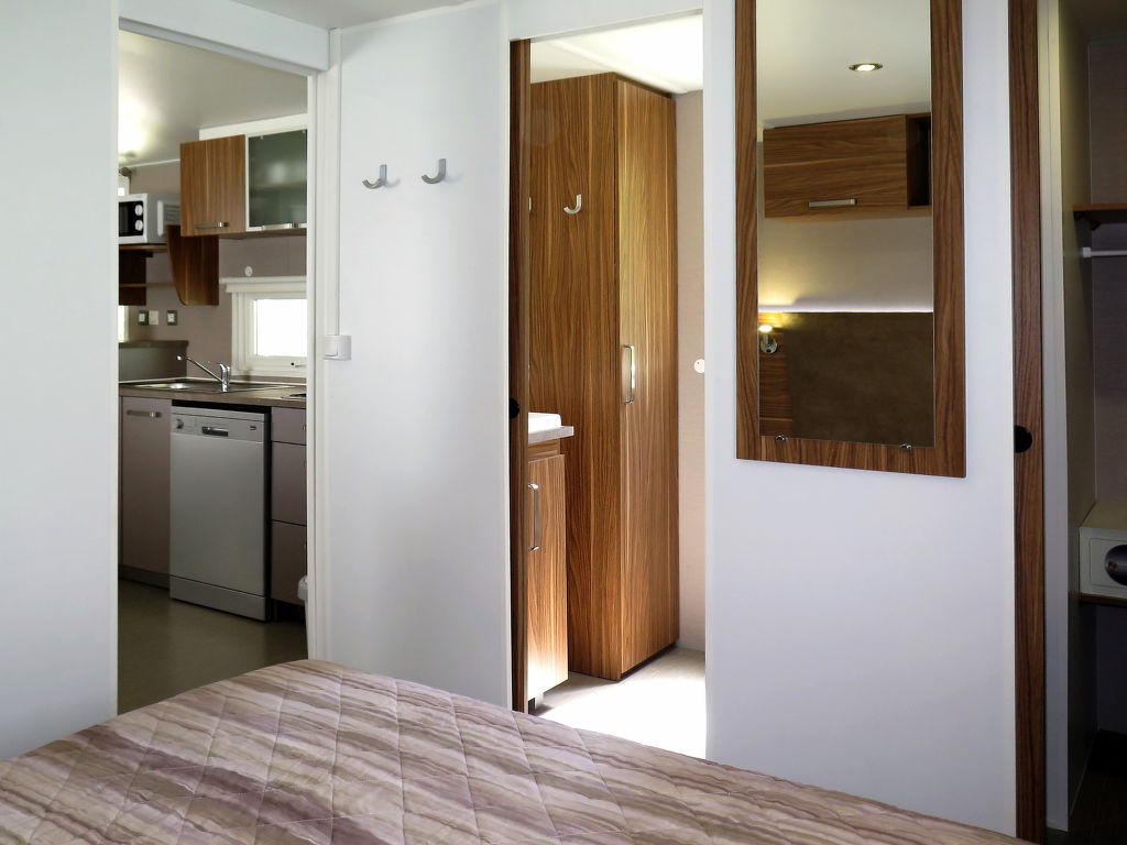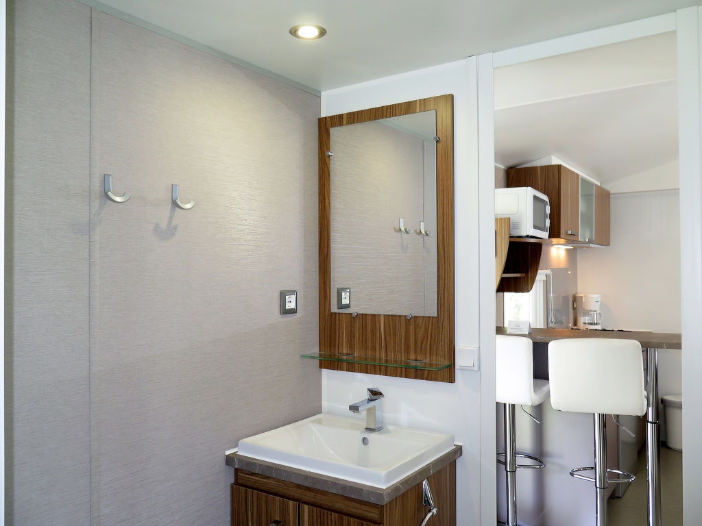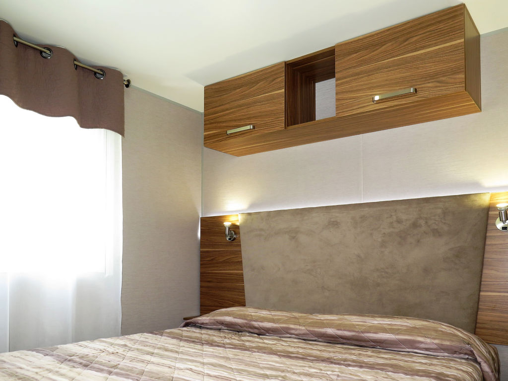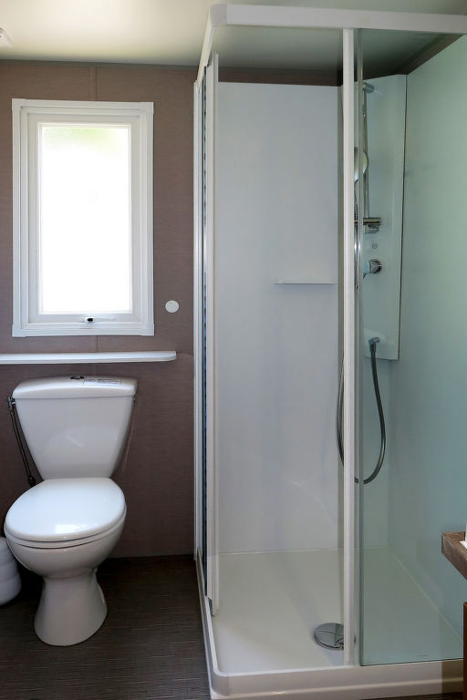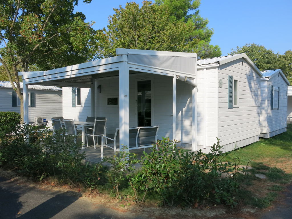 3-Zimmer-Mobilhome, ca. 31 m², zzgl. ca. 15 m² komplett verschließbare, überdachte Terrasse. Über 2 Stufen zum Wohn-/Schlafraum mit Doppelbettcouch, Essplatz, Küchenzeile (4 Flammen, Mikrowelle, kleiner Geschirrspüler, Kühl-/Gefrierkombination, Kaffeemaschine). Doppelzimmer. Schlafzimmer mit Etagenbett und Einzelbett. Dusche/WC. Sep.WC. Maximale Belegung: 6 Erwachsene und 1 Kind bis 10 Jahre. Strandentfernung 80-300 m.