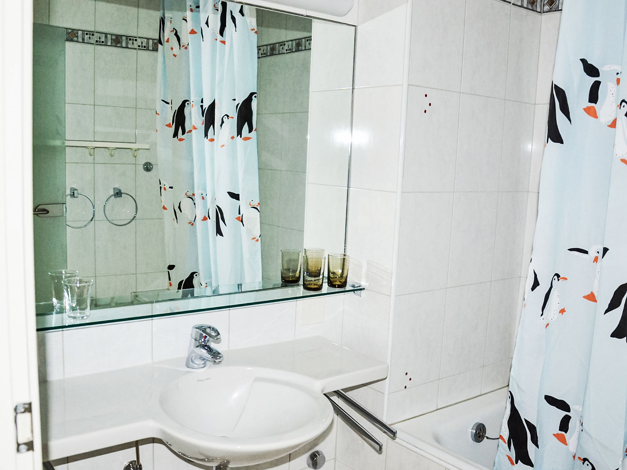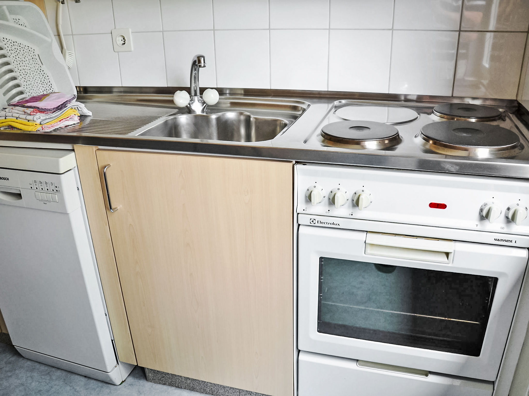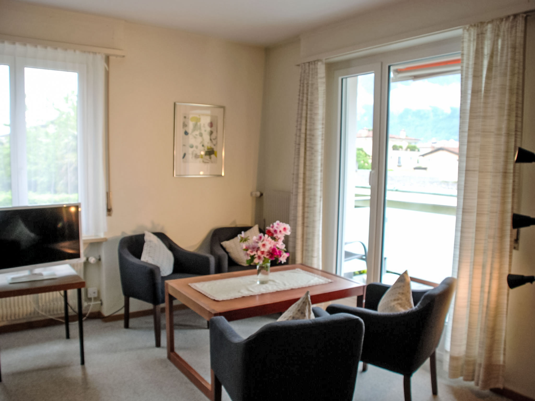 4-Zimmer-Wohnung 88 m2 im 1. Stock. Geräumig und hell, zweckmässig und gemütlich eingerichtet: offenes Wohn-/Schlafzimmer mit 2 Wandschrankbetten (90 cm, Länge 200 cm), Kabel-TV, Flachbildschirm und Radio. Ausgang zum Balkon. Esszimmer mit Schiebetür. Ausgang zum Balkon. 1 Doppelzimmer mit 1 Doppelbett (2 x 90 cm, Länge 200 cm). 1 Zimmer mit 2 Betten (90 cm, Länge 200 cm). Küche (3 Kochplatten, Backofen, Geschirrspüler, elektrische Kaffeemaschine, Kapseln für die Kaffeemaschine (Chicco d’oro) extra) mit kleiner Bar. Bad, sep. WC. Heizung. Balkon. Balkonmöbel. Sicht auf die Berge und die Landschaft. Bitte beachten: Nichtraucher-Unterkunft. Maximal 1 Haustier/Hund erlaubt.